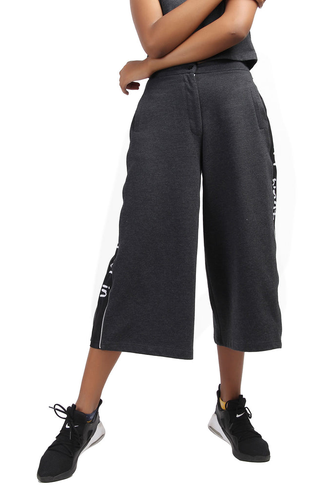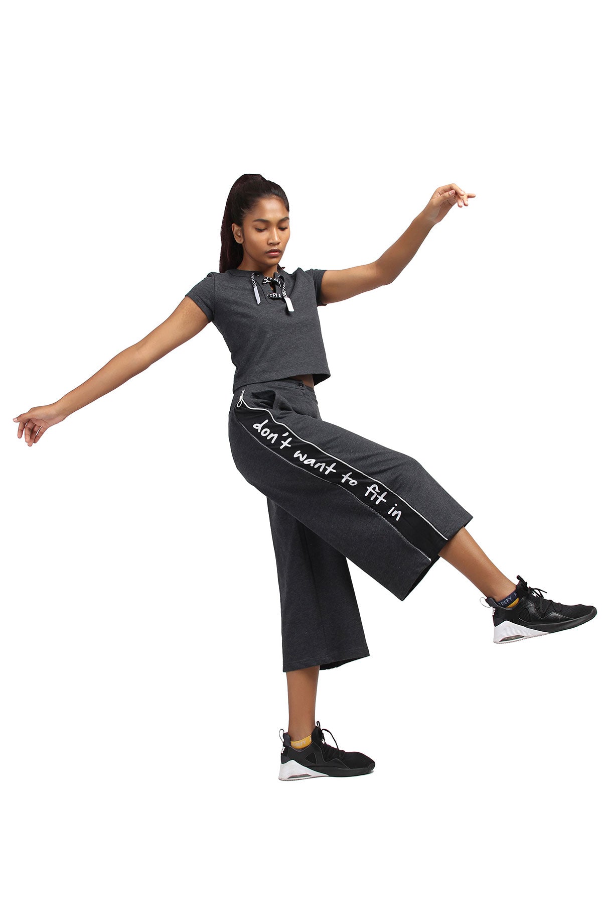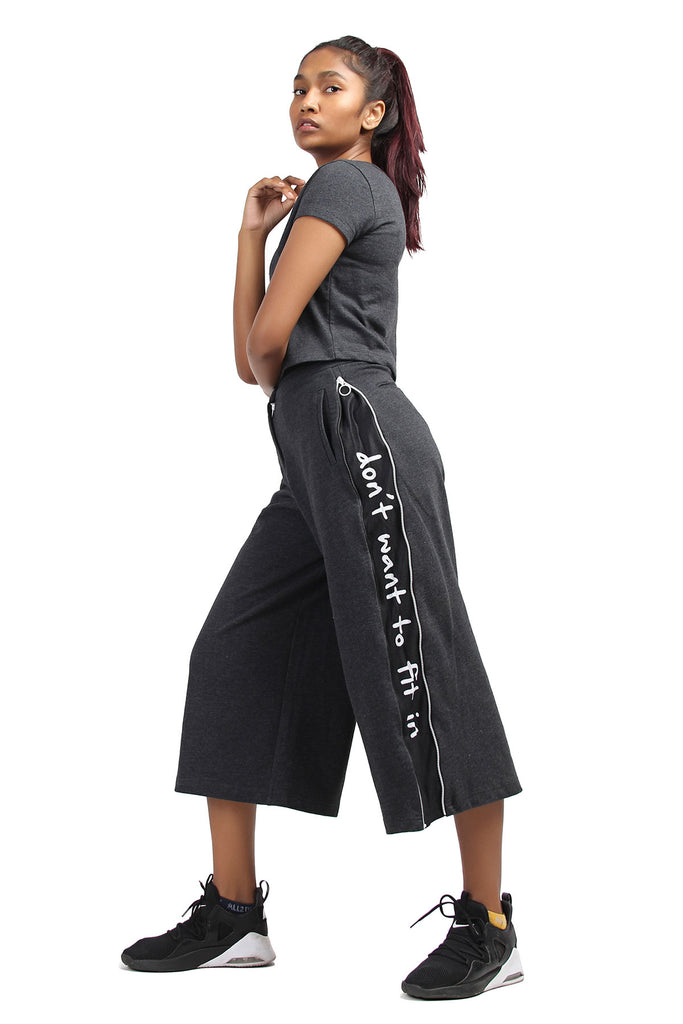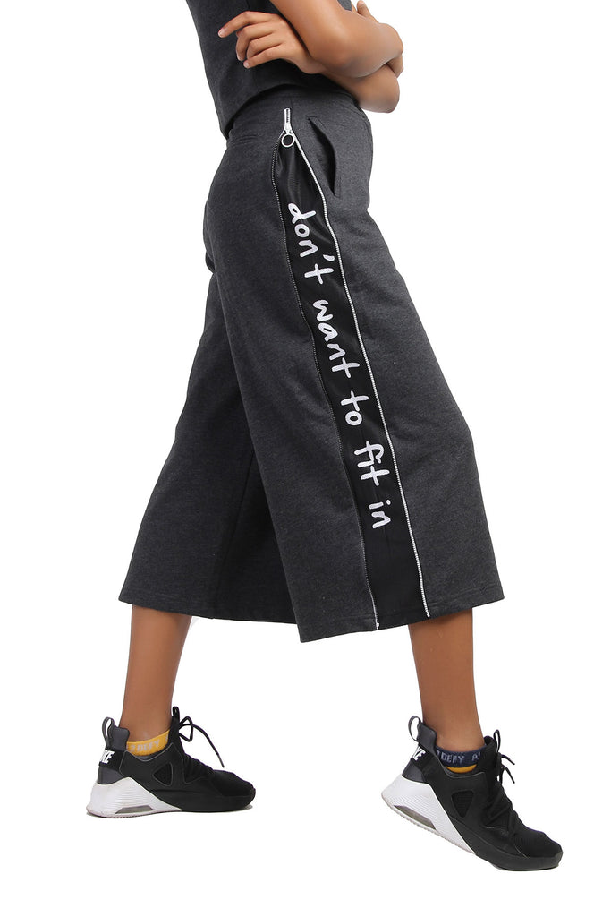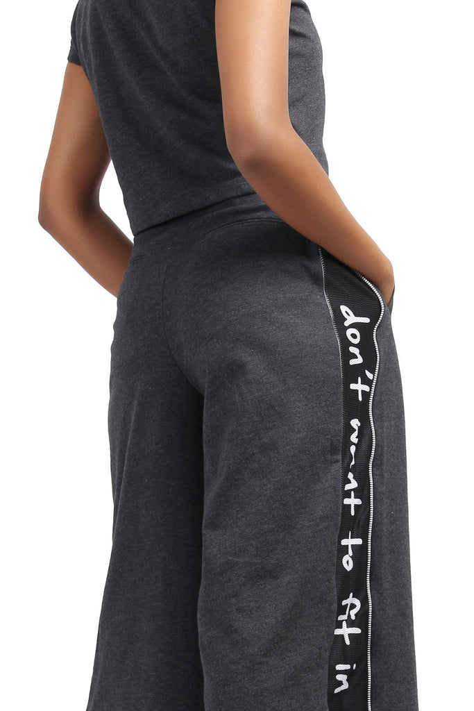 Wide cotton terry lounge pants in charcoal. High-rise. Two-pocket styling. Expandable outseams with two-toned zipper closure. "Don't want to fit in" printed in white on the mesh inserts. Concealed two-tone zipper at the crotch. "Don't want to fit in" graphic on the crotch. Cropped leg. Tonal stitching.