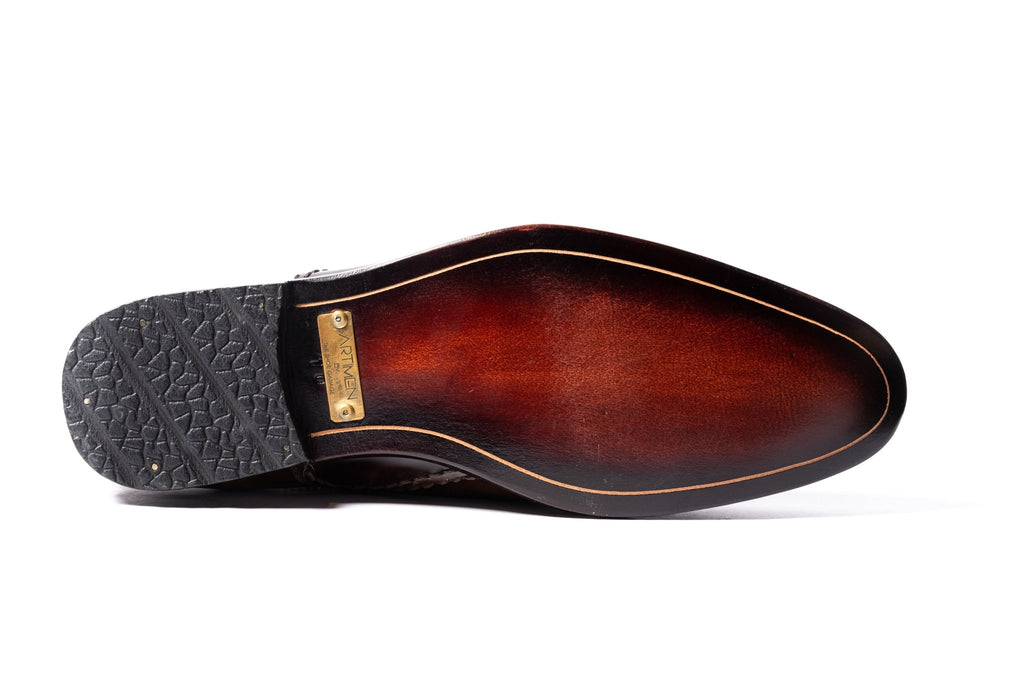 A well thought of design with a perfect blend of three leathers in one. Burnt tan leather with deep brown combination sets it apart from the rest. The stitched ears on the sides adds character to the whole look of the shoe.