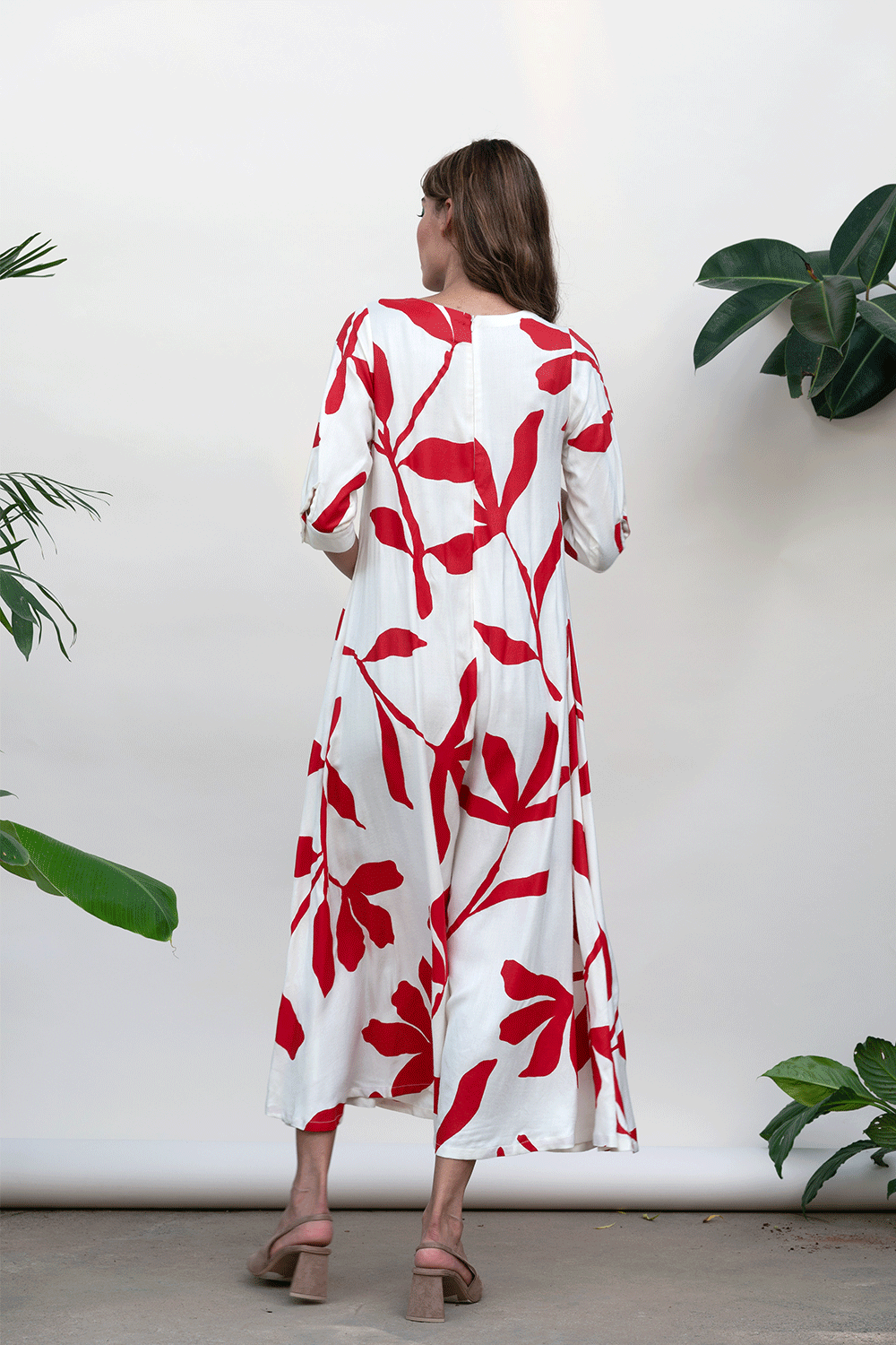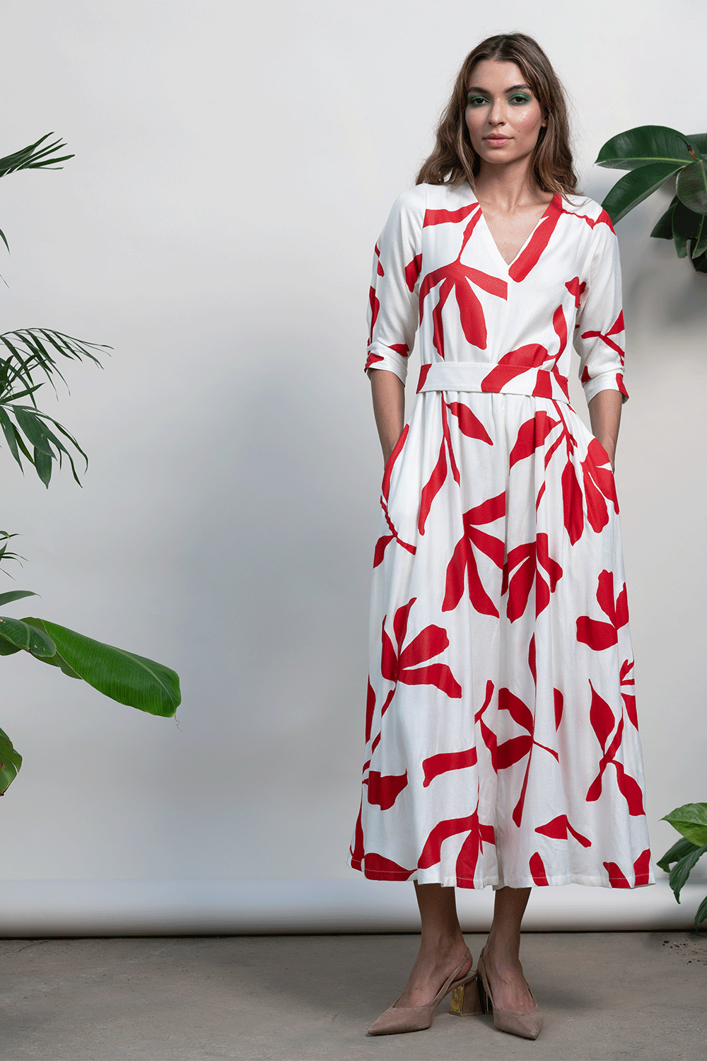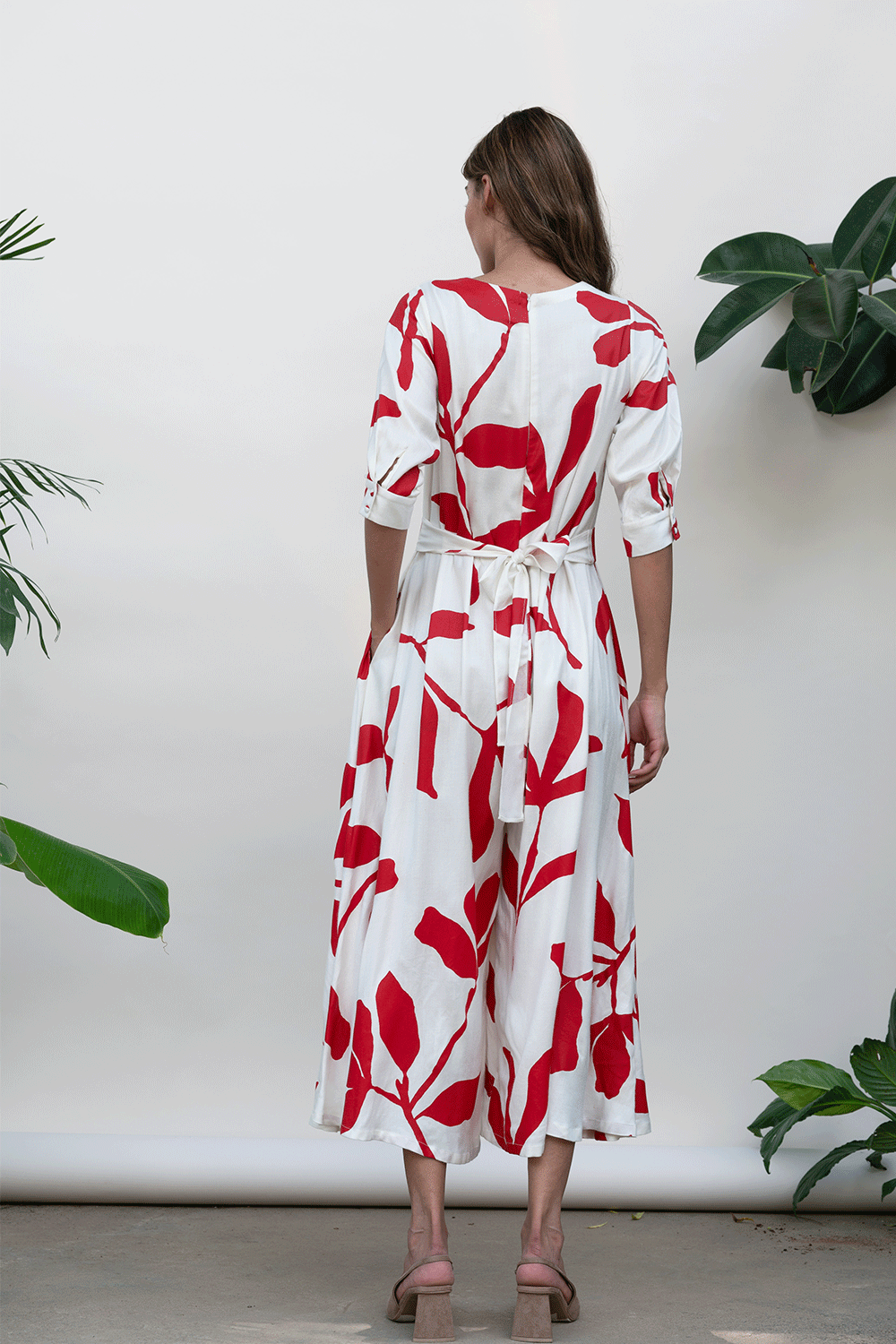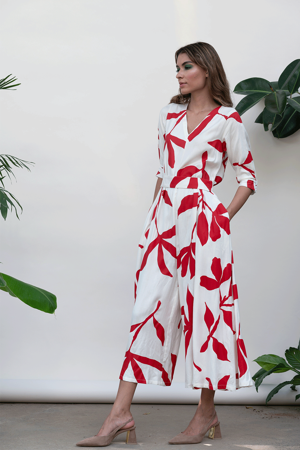 Wide leg printed jumpsuit with zip opening at the back. Easy to wear with v-neck. Comes with a printed belt. Due to the nature of the print, the placement of the print will vary in every piece.