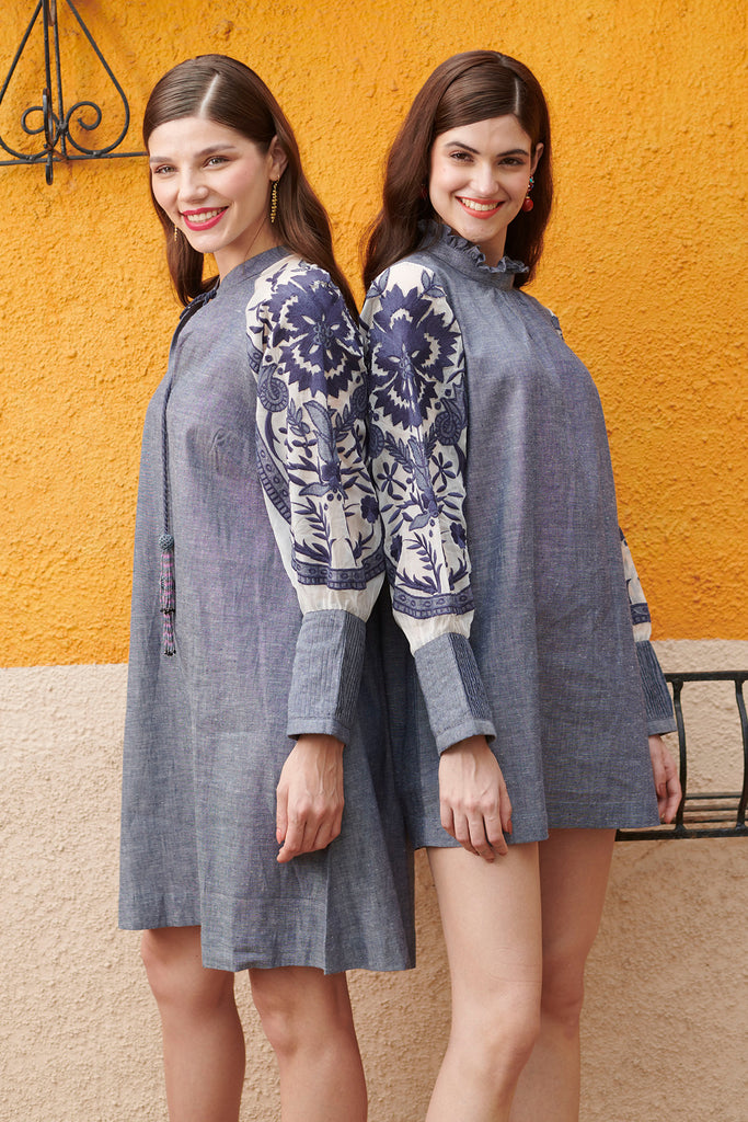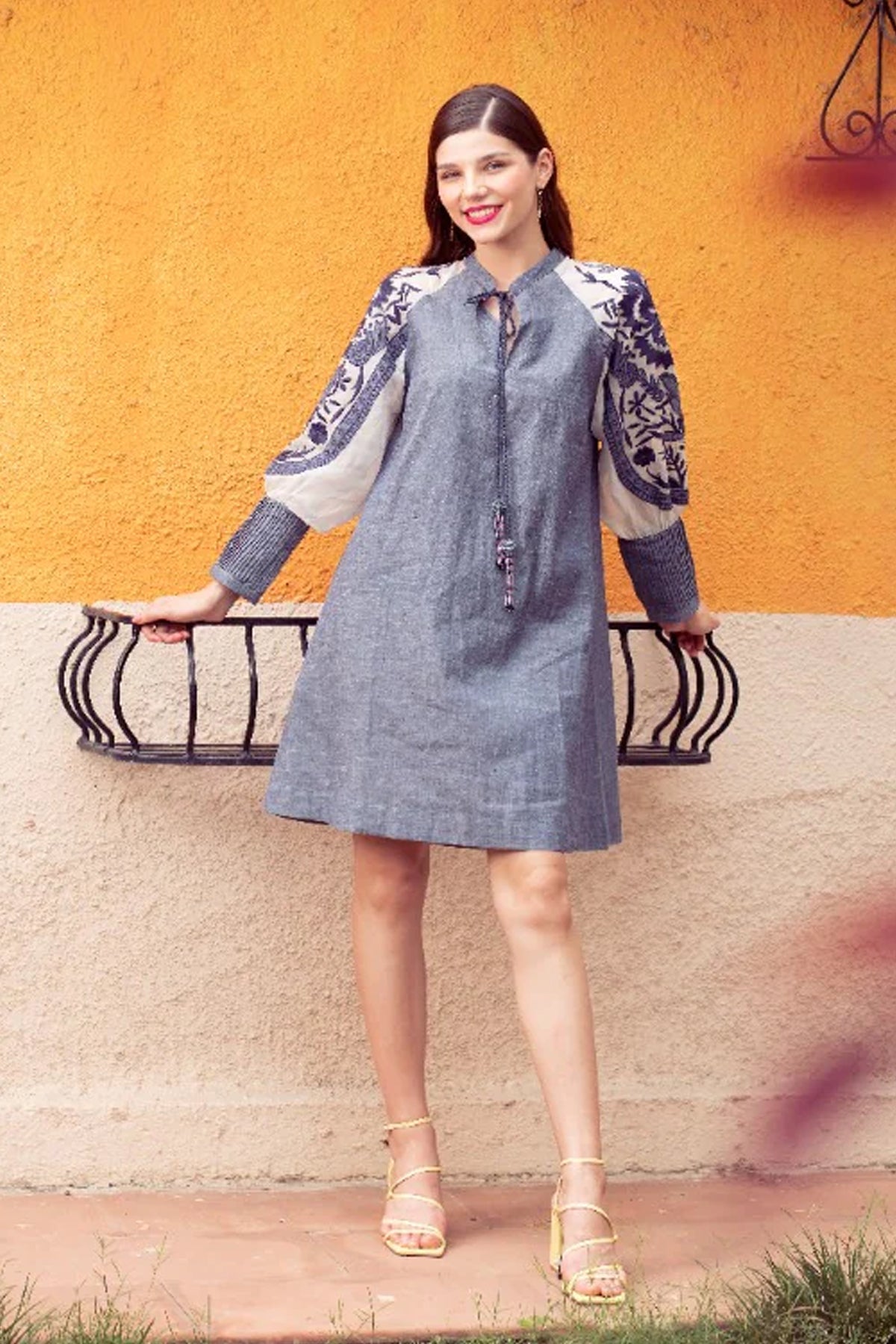 A classic Nika 1.0 Silk organza embroidered dress , the FLORENCE DRESS is a must have in your wardrobe. Crafted from a intricate, textured denim chambray fabric, creating a subtle striking effect. A classic dress, key hole neckline at the back and tassels as another option. This easy-to-wear flattering dress will be a timeless addition to your transeasonal wardrobe.