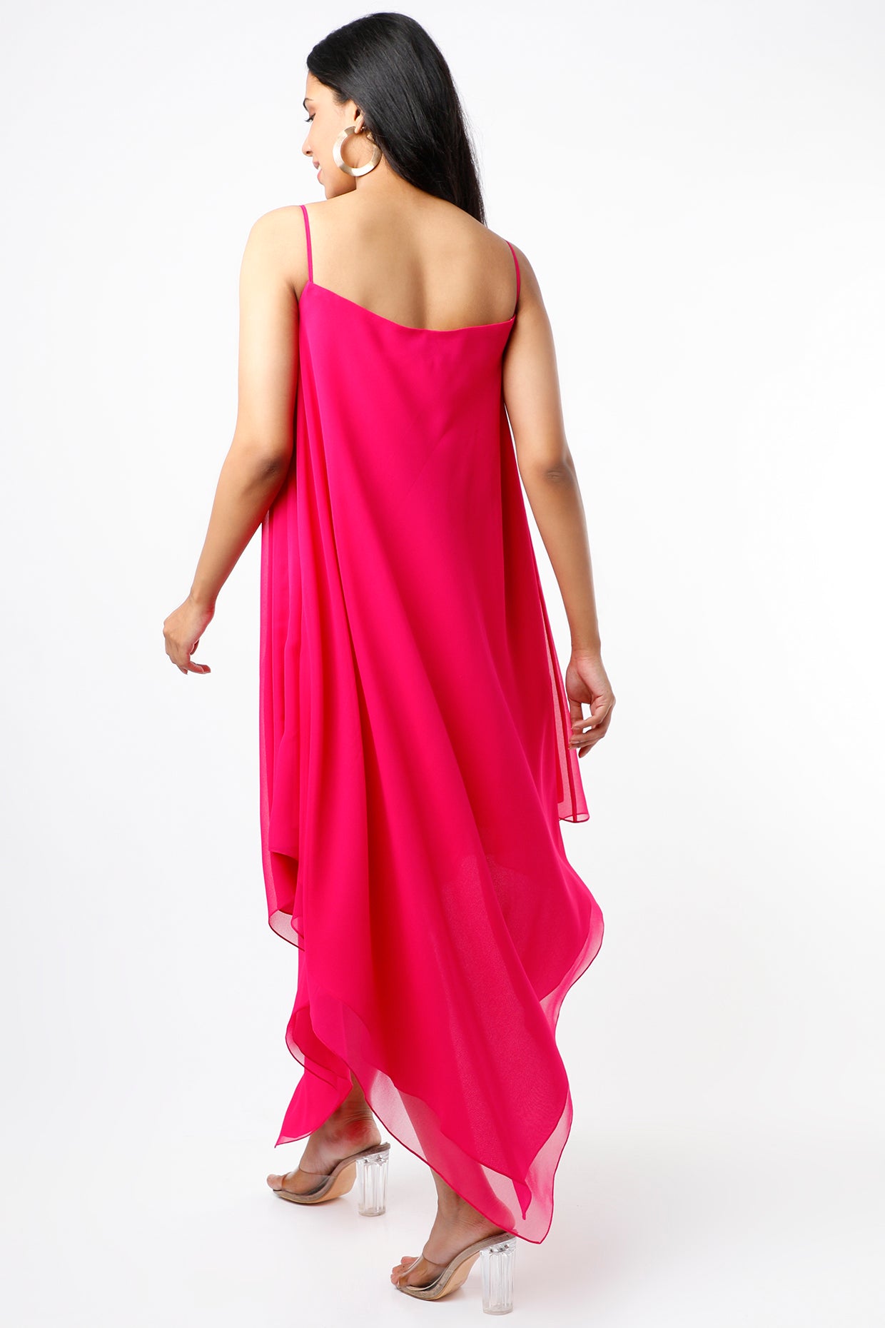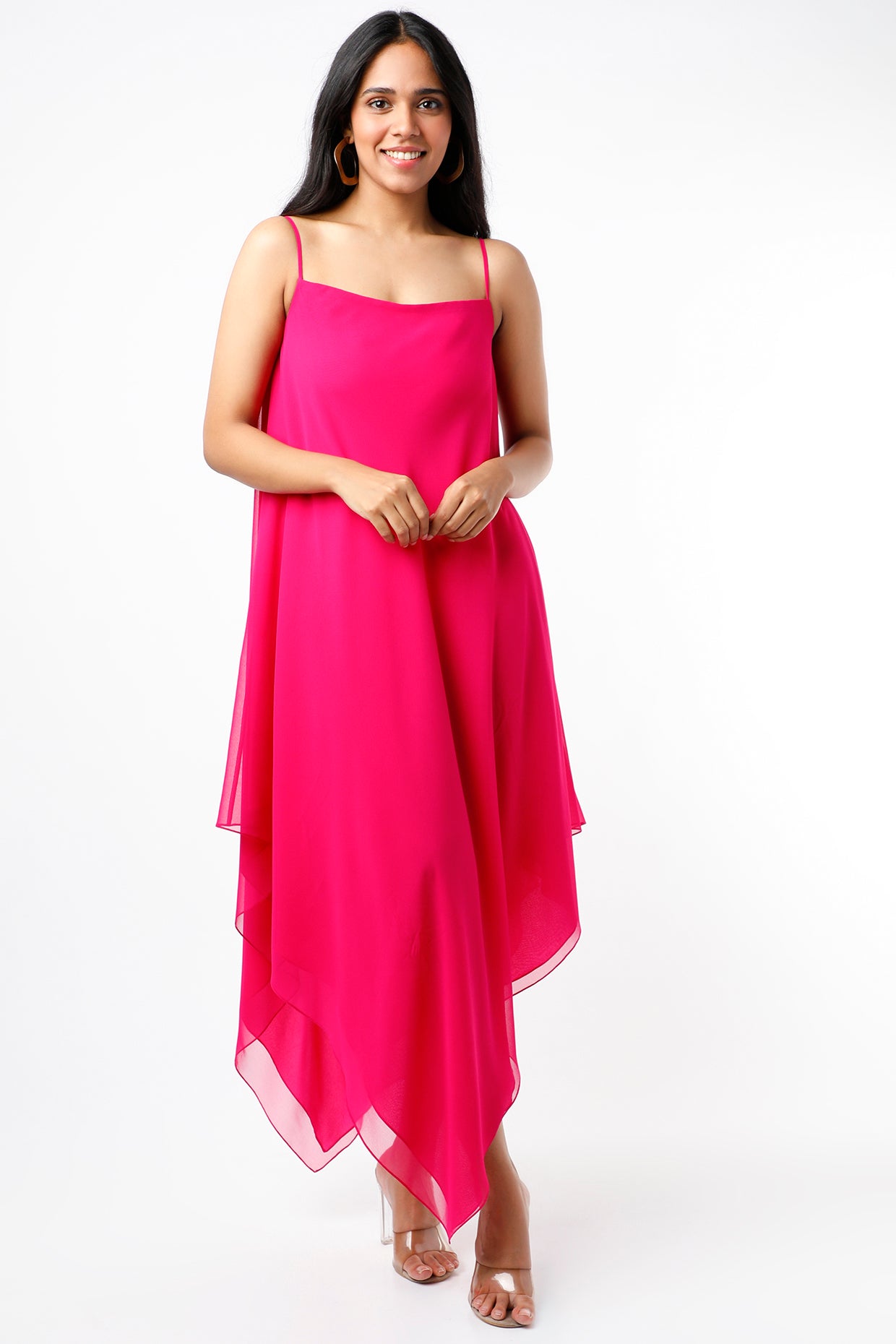 Featuring a fuchsia spaghetti strap dress in georgette base with asymmetrical hemline.