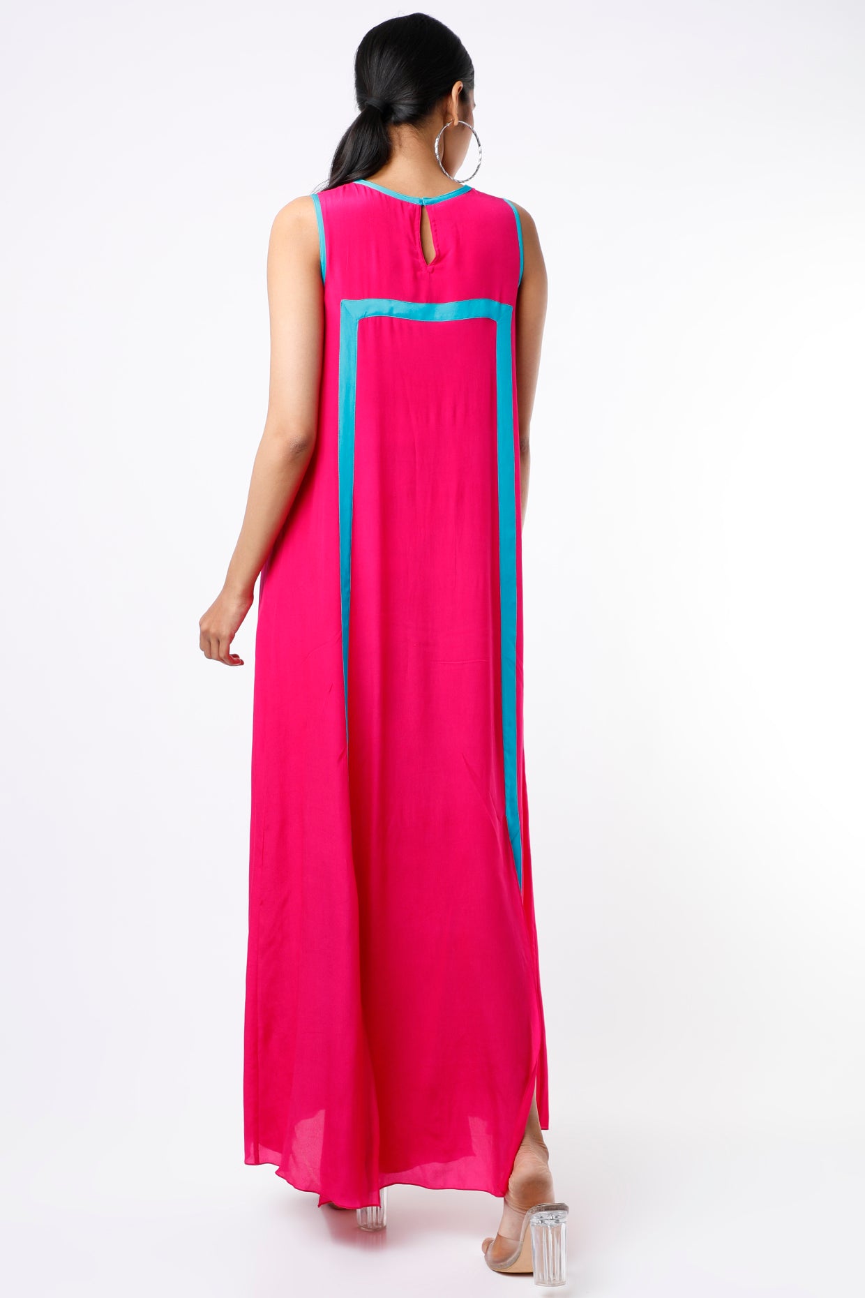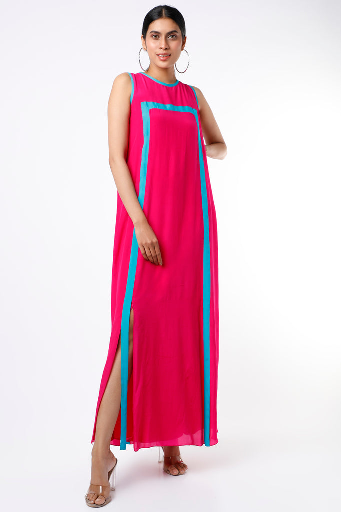 Featuring a Fuchsia & Turquoise sleeveless maxi dress in crepe base with a slit.