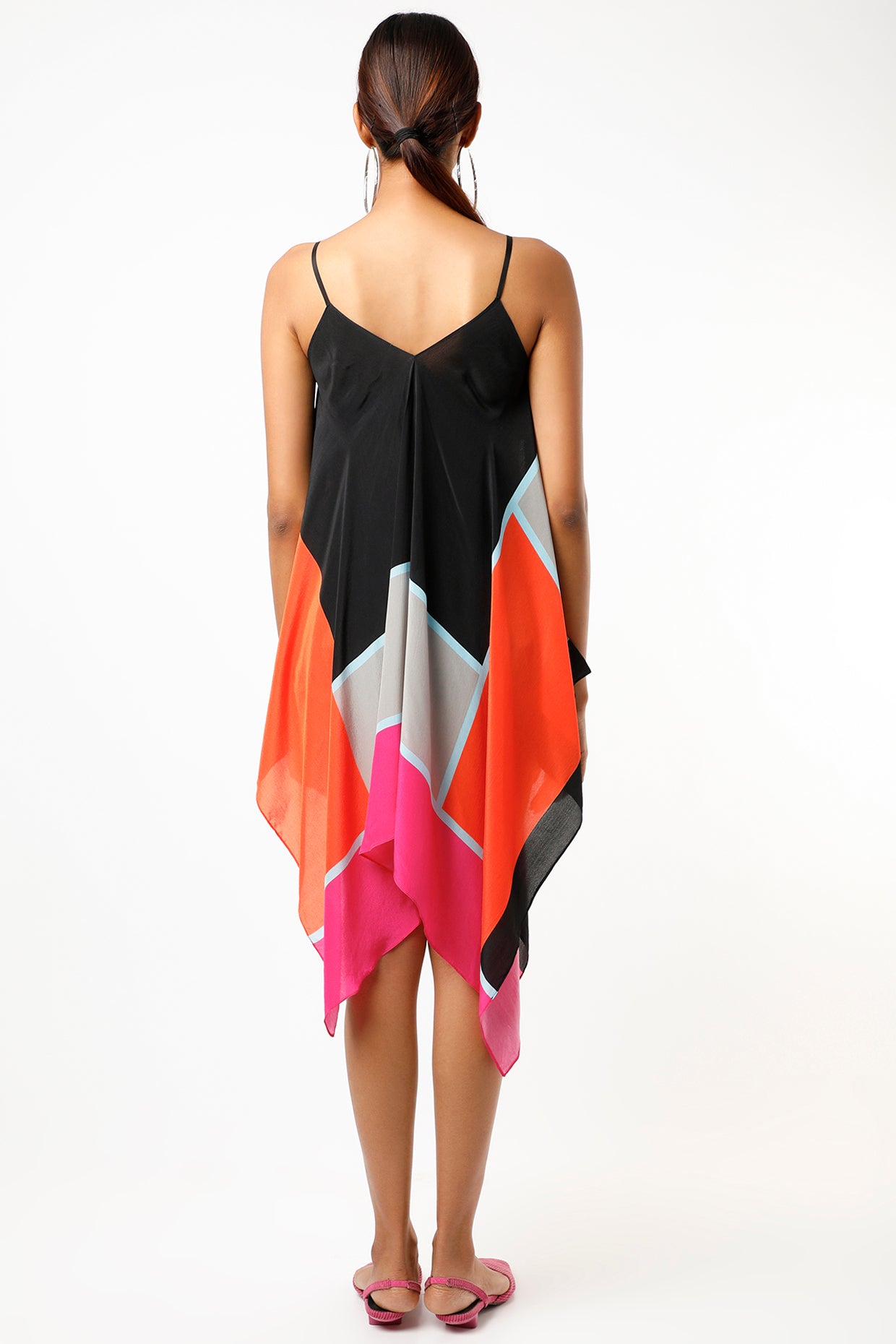 Featuring a multi colored handkerchief top in crepe base with color blocking and digital print. This contains only one piece.