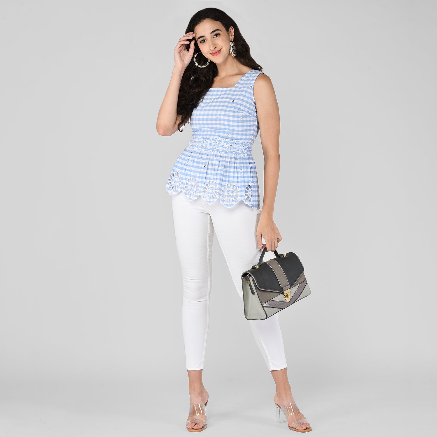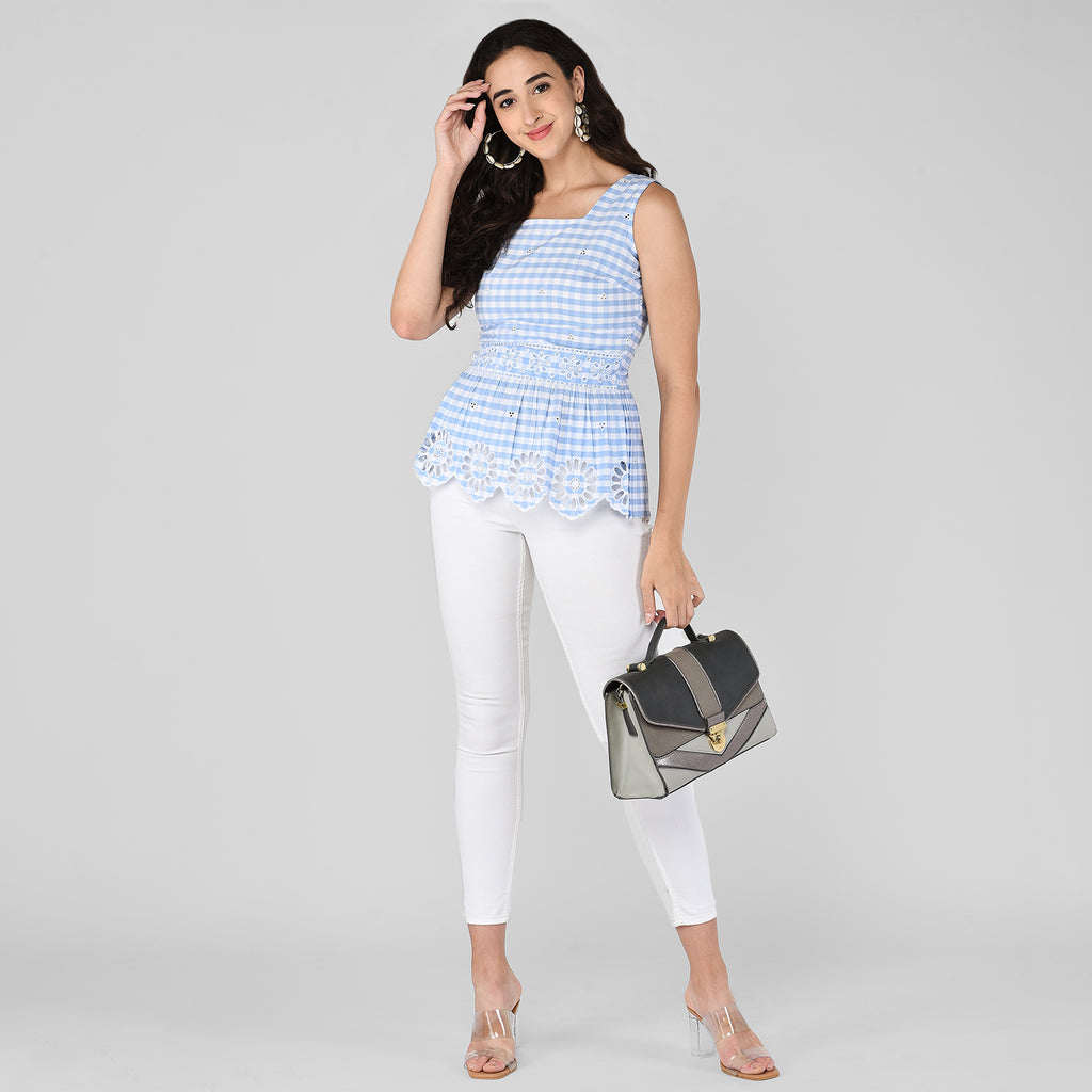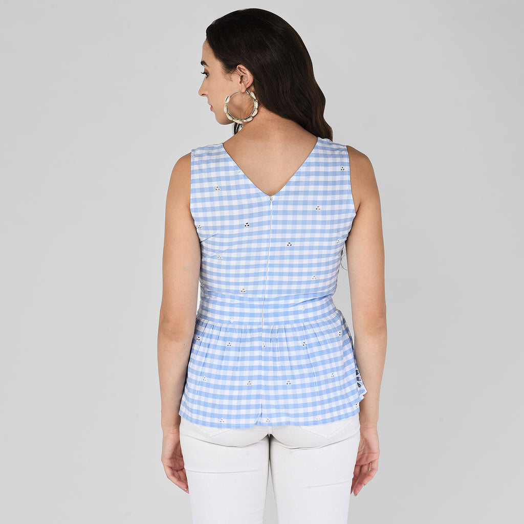 Sweet eyelet detail and a cosy silhouette makes this stunning gingham top apt for coffee catch ups and darling dates. It is finely crafted from cotton fabric, which gives it a good finish and also assures day long comfort. Style it with a pair of jeans and stilettos or a pair of shorts and sneakers to get that stunning look.