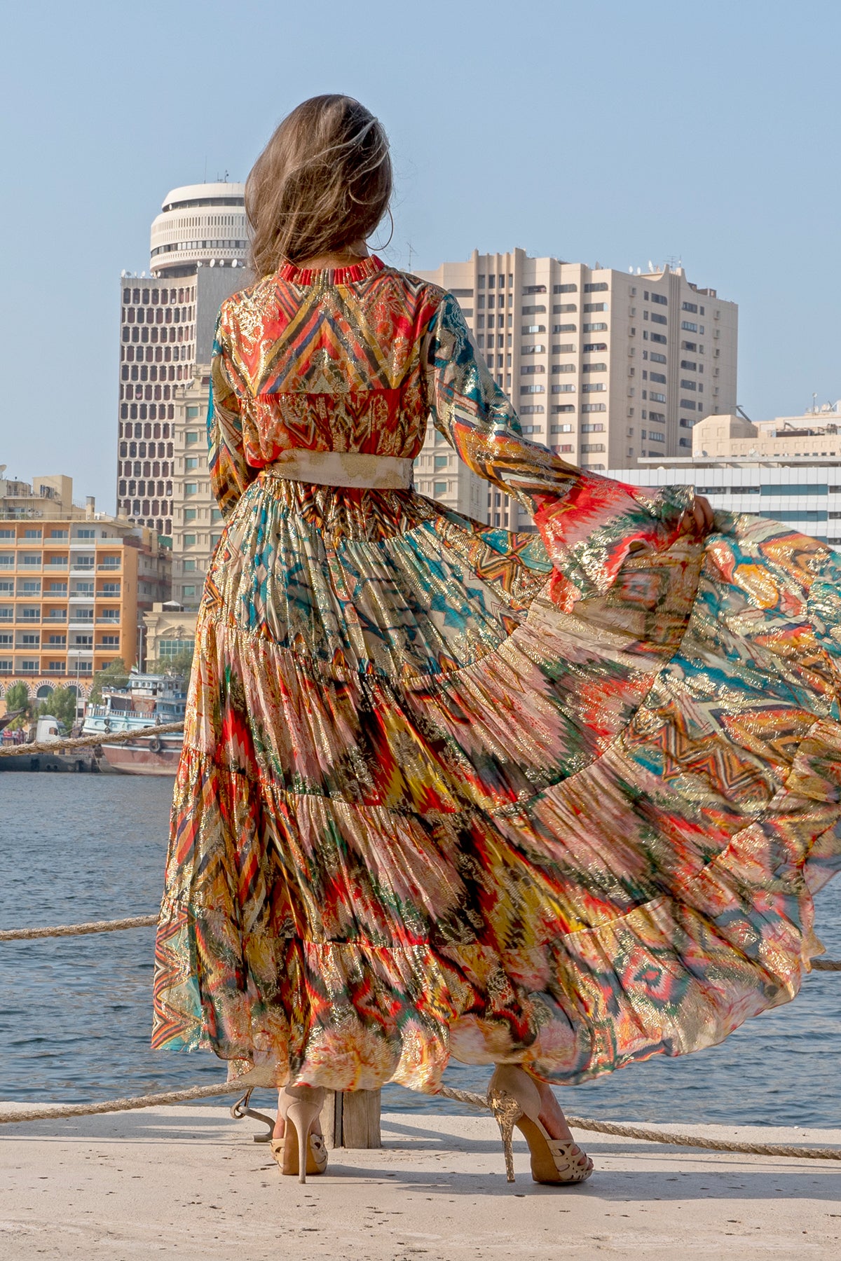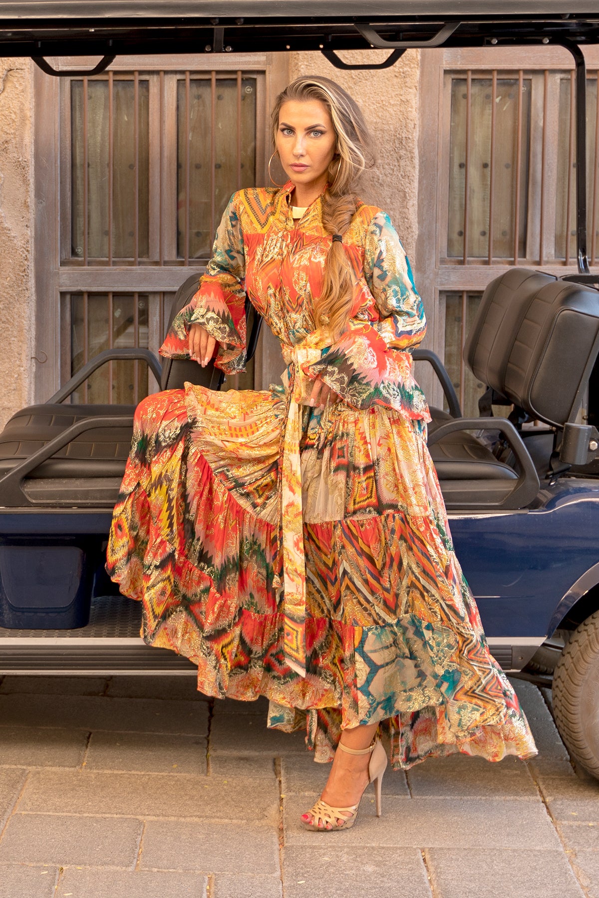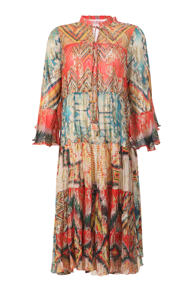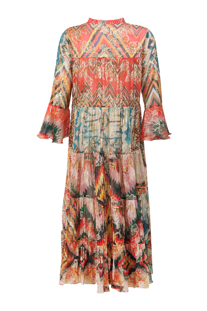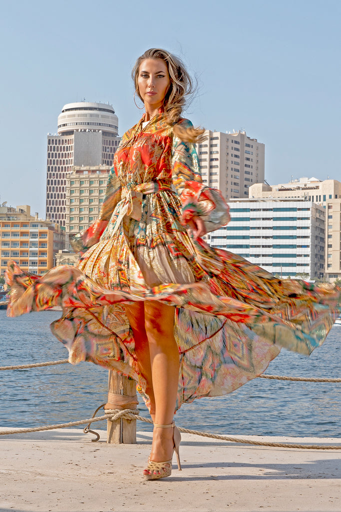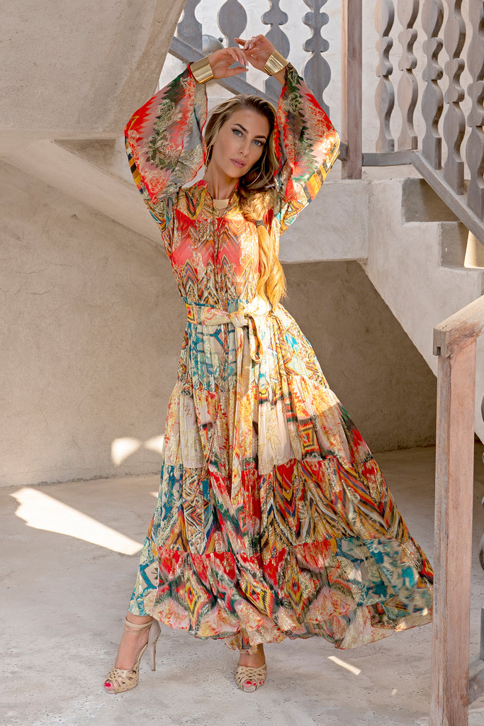 The craftsmanship of this long, asymmetrical maxi dress is unmatched, having an exotic flair that’s stiff to miss. Like a goddess, it is alluring, delicate, and endearing. Featuring a collar, a self-attested belt and bell sleeves that embody an eccentric expression with its lustrous melange pattern made of pure viscose.