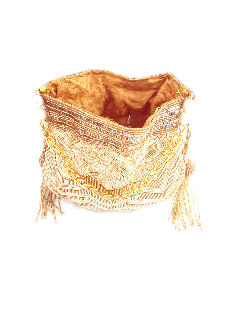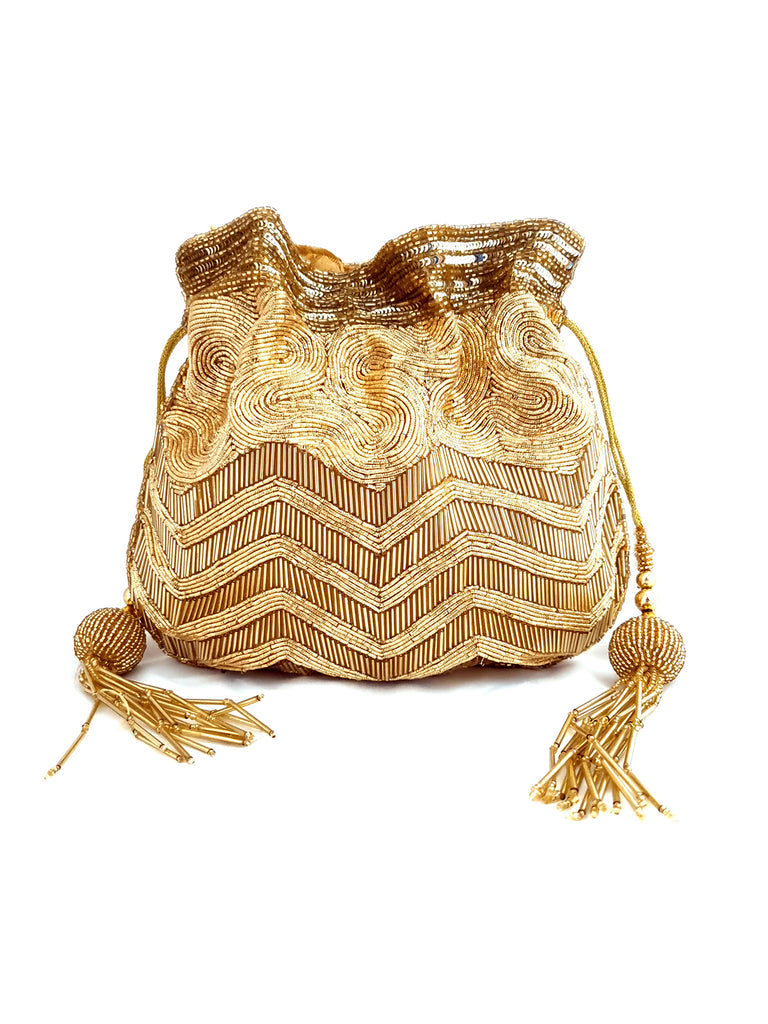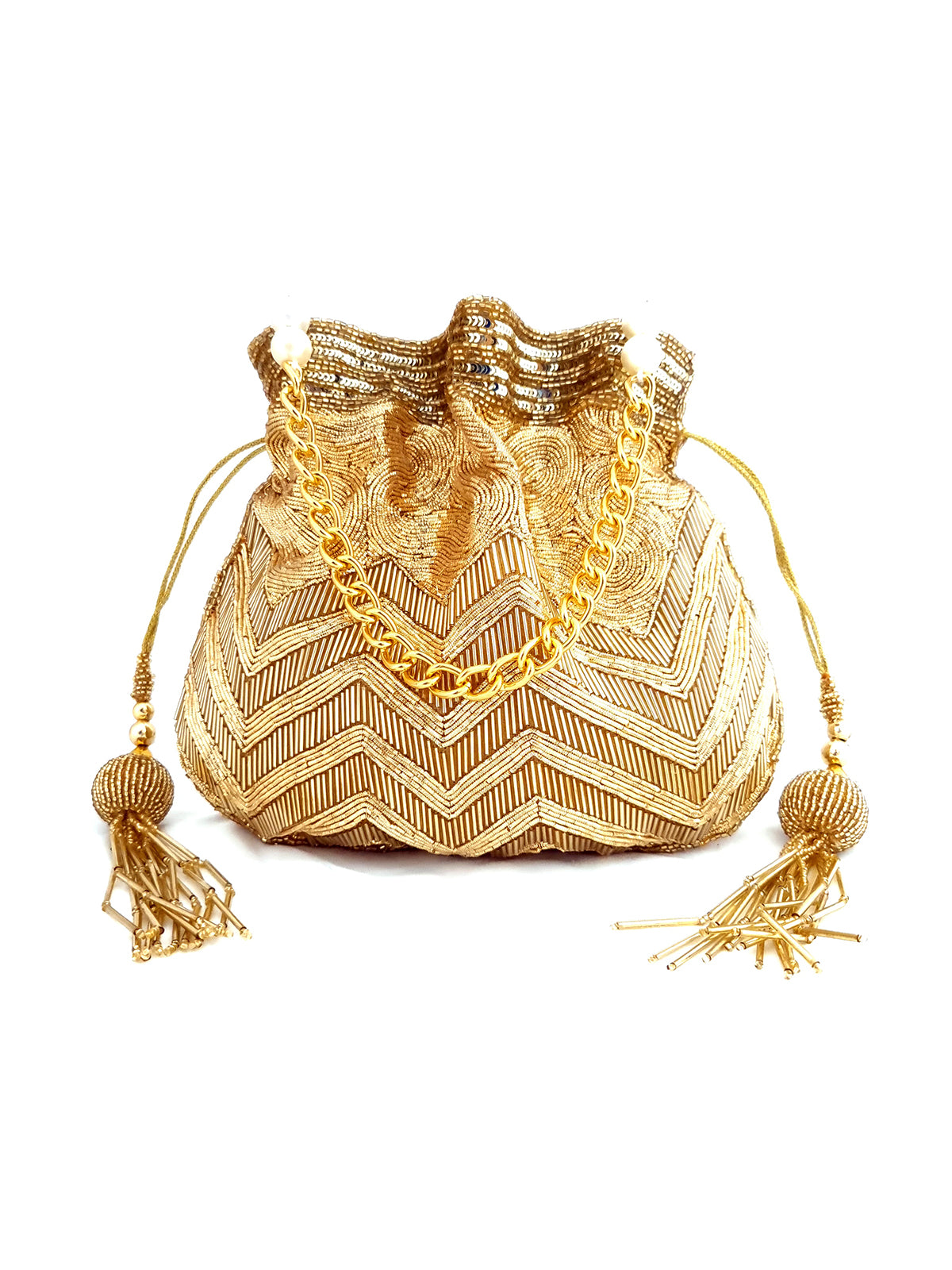 Hand embroidered Potli with Gold Dabka and Bead work in Zigzag Pattern on both sides.