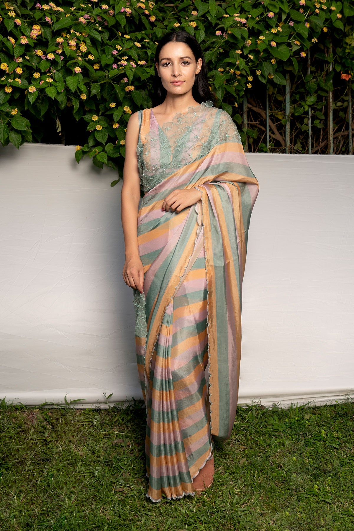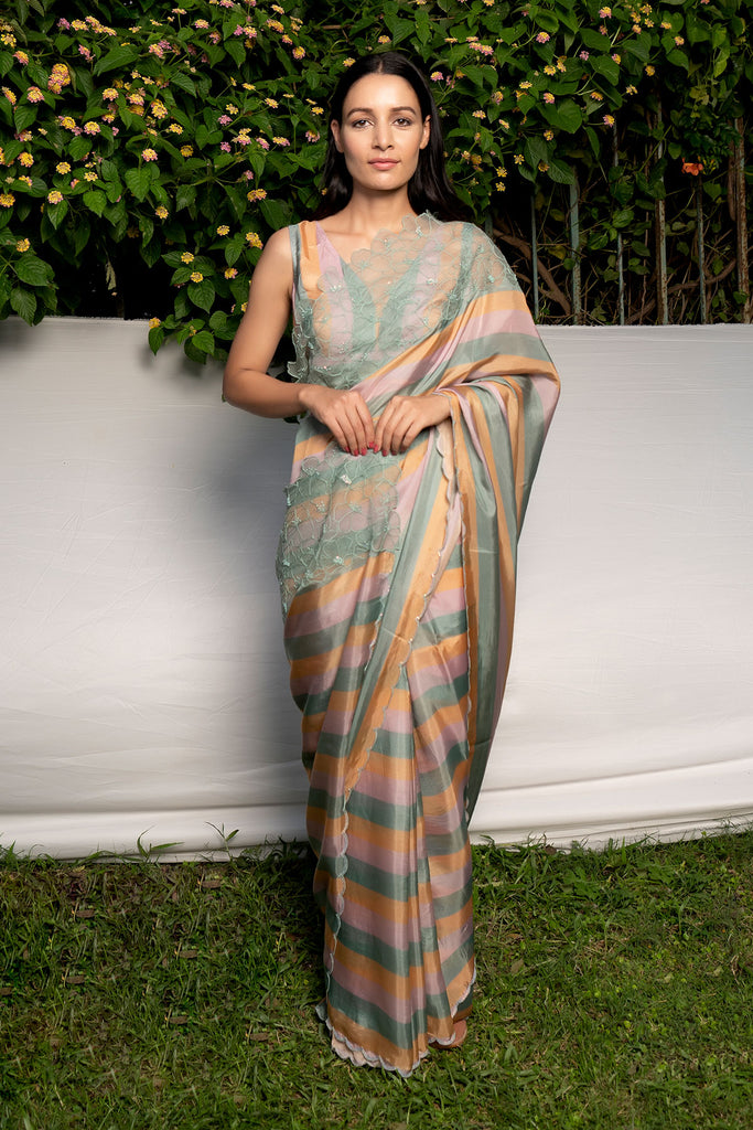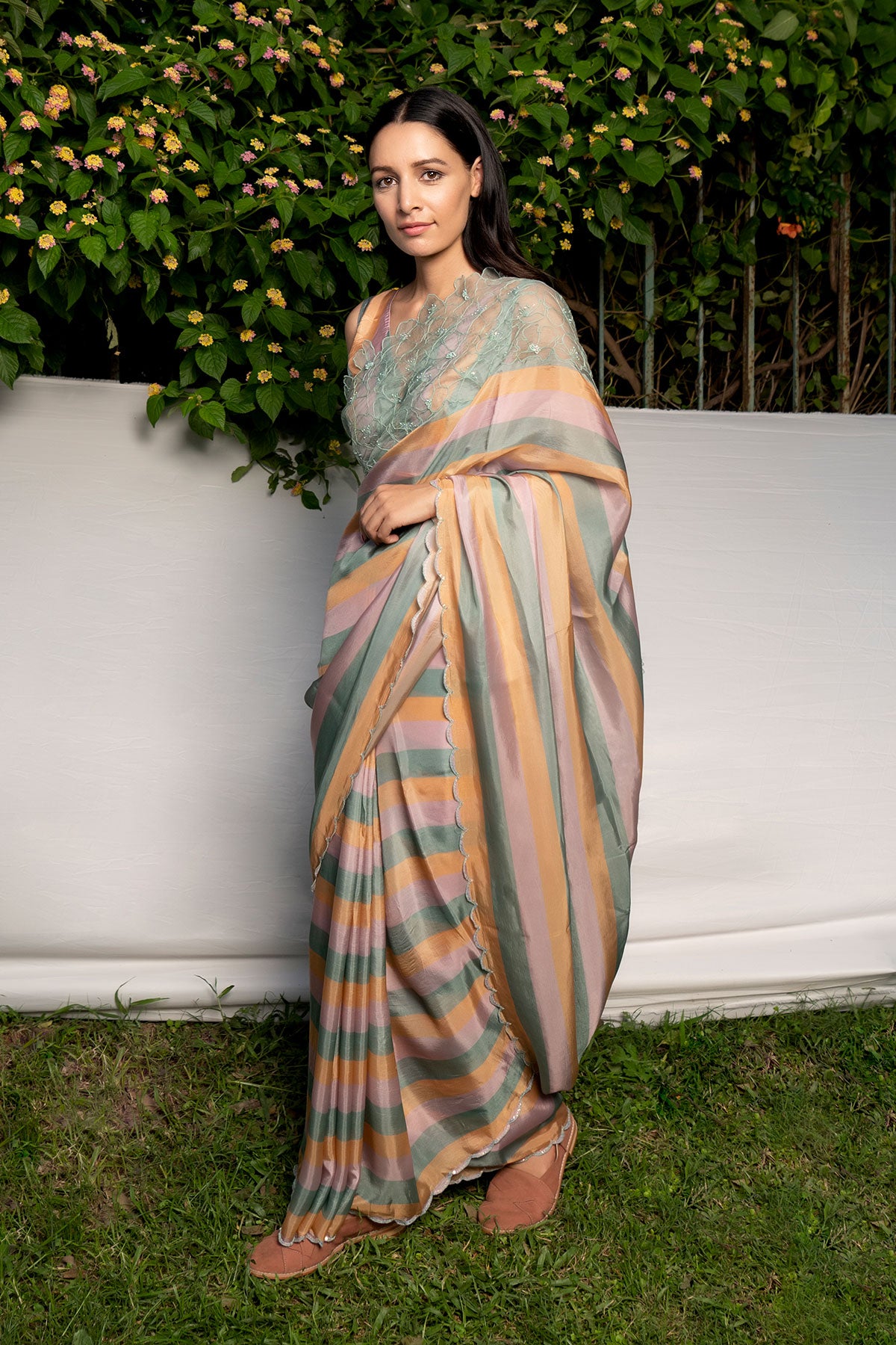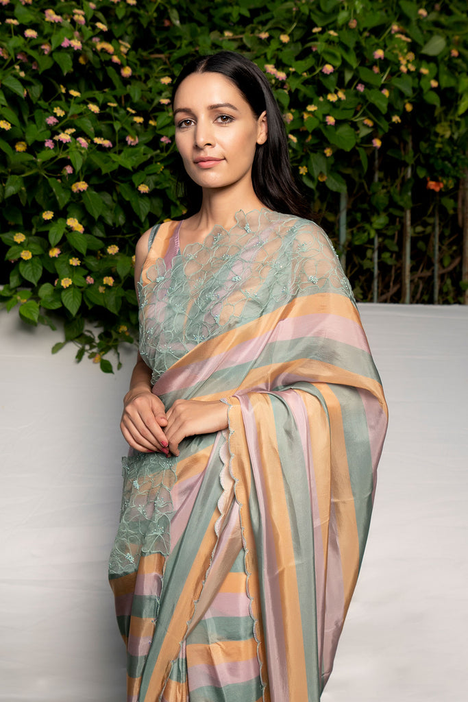 - Floral hand embroidered border with sequence scalloped edges allover.