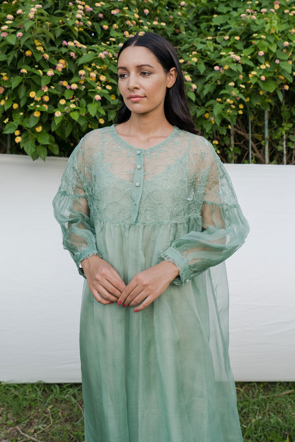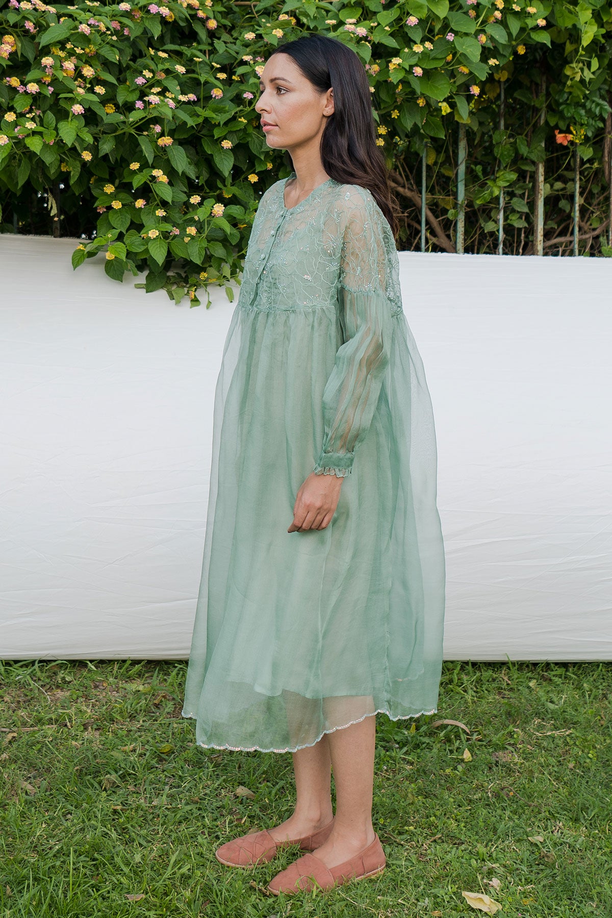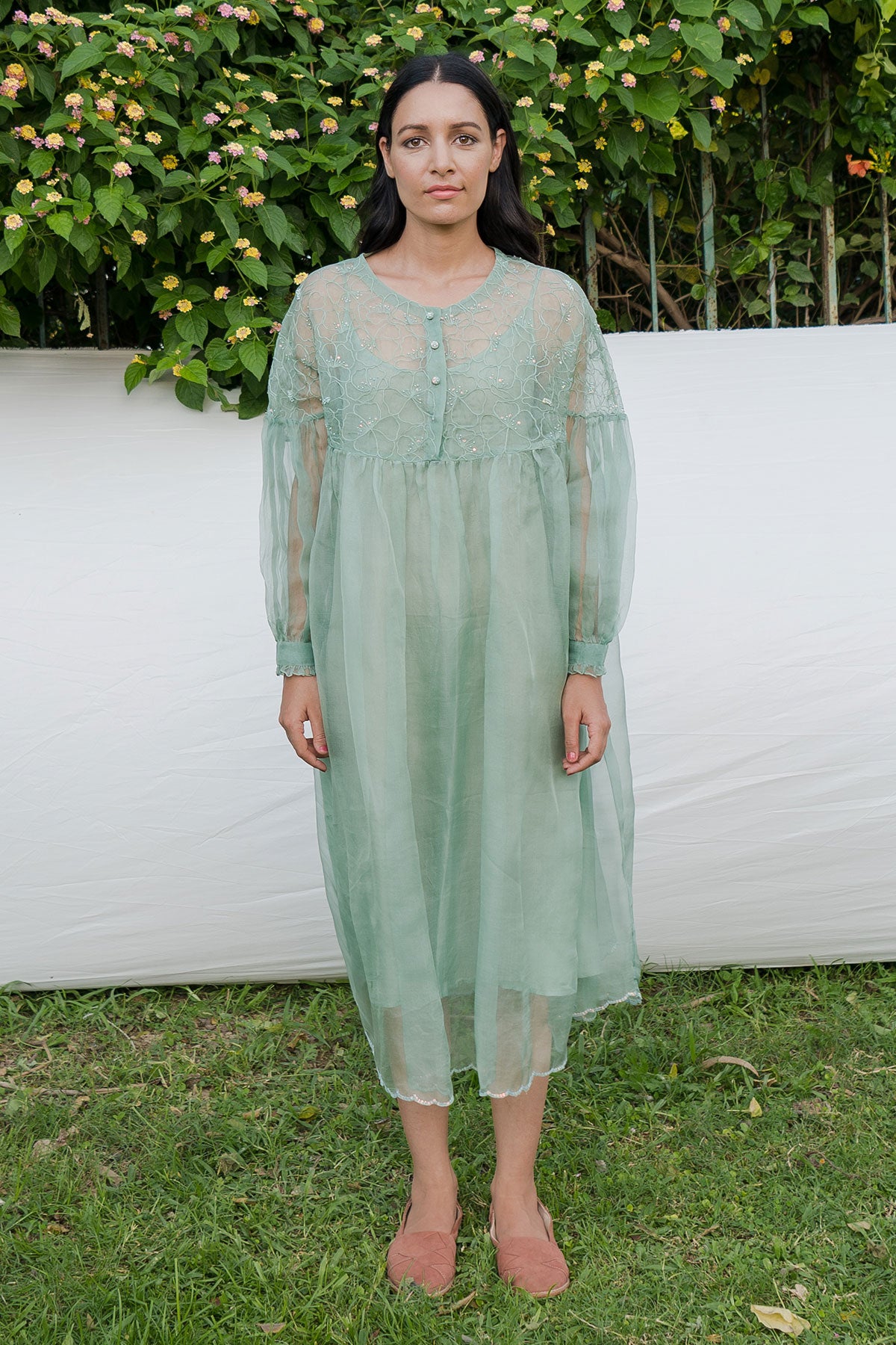 - Hand embroidered dress with gathers and scalloped hem along with spaghetti lining.