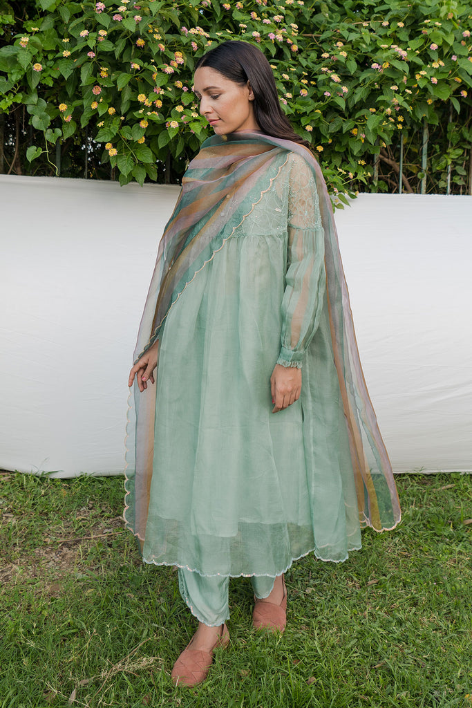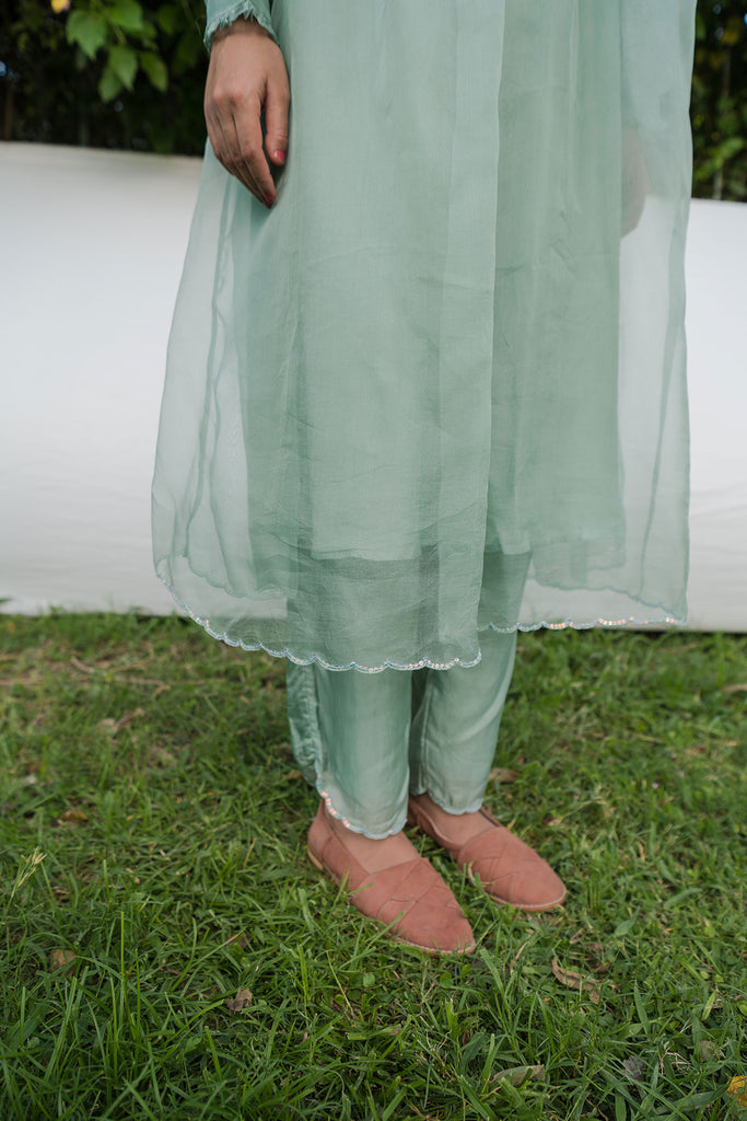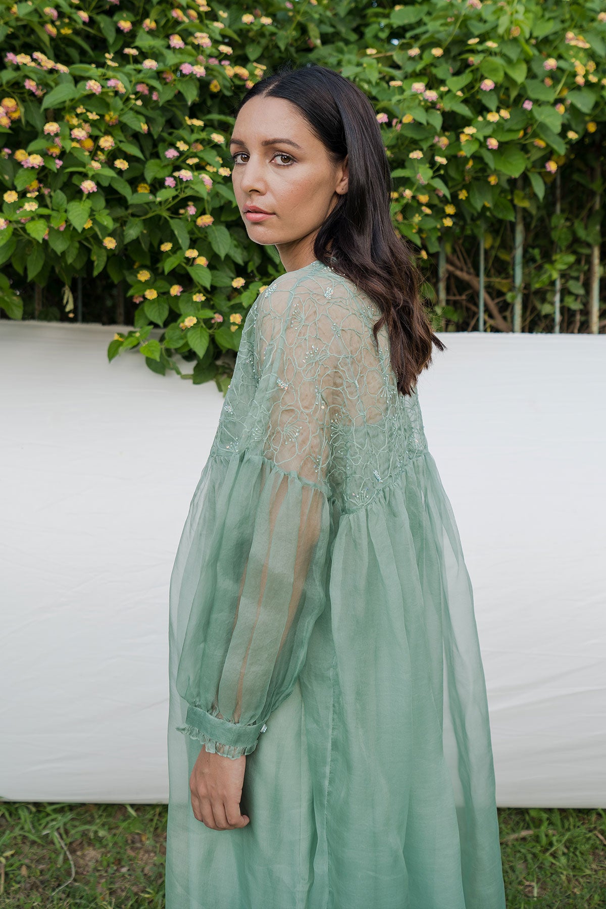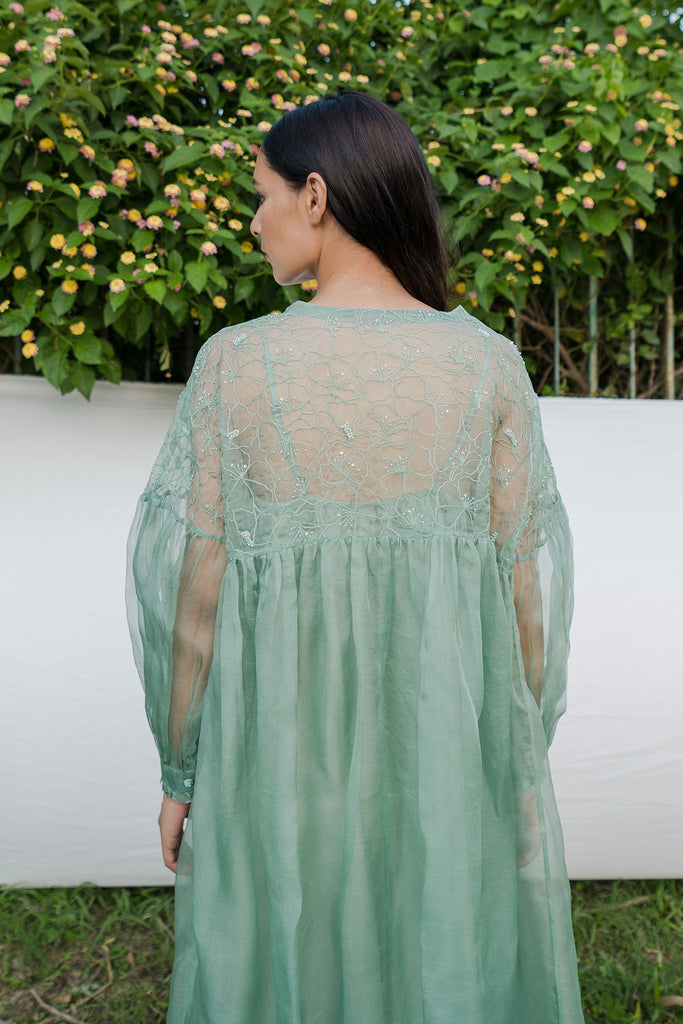 - Hand embroidered dress with gathers and scalloped hem along with spaghetti lining.