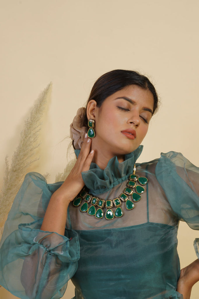 This jewellery set consists of a Necklace & a pair of Earrings. Green Stone Studded Jewellery Set, has stone detailing. Secured with drawstring Closure. A pair of matching Earrings, each secured with post and back closure.