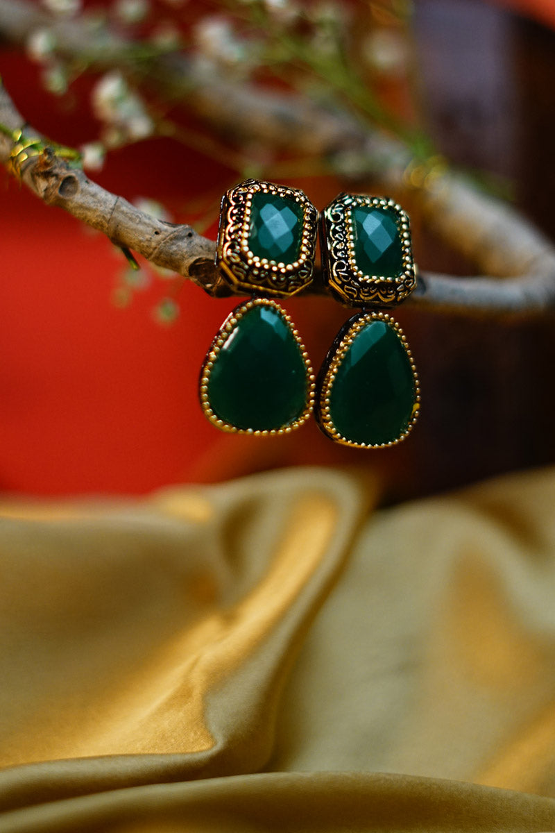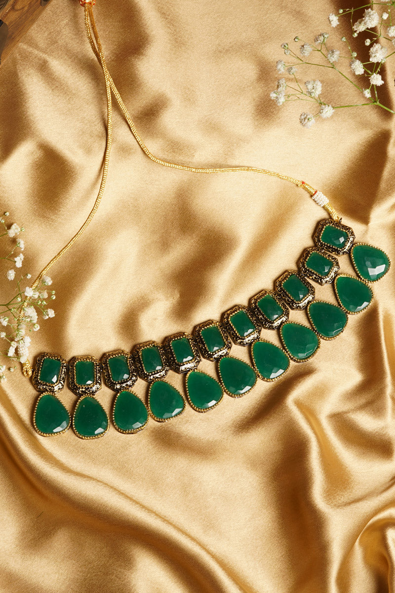 Green Stone Studded Black & Gunmetal Plated Jewellery Set