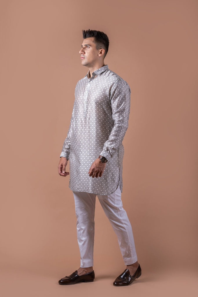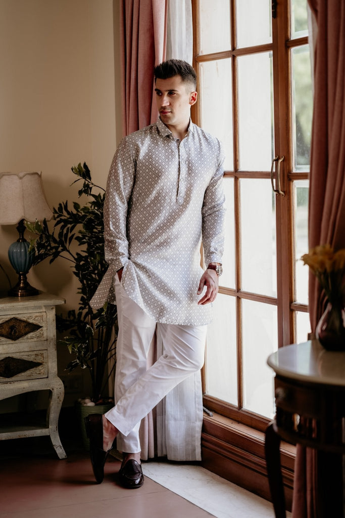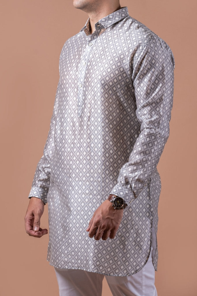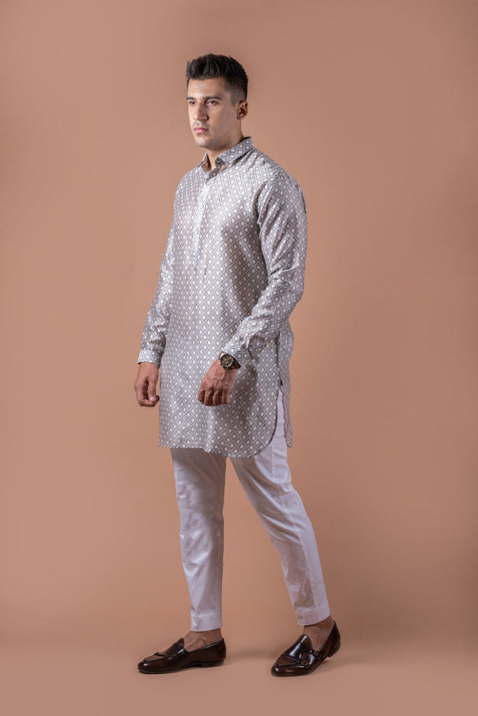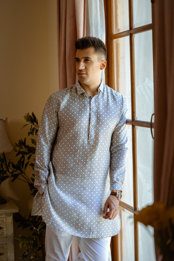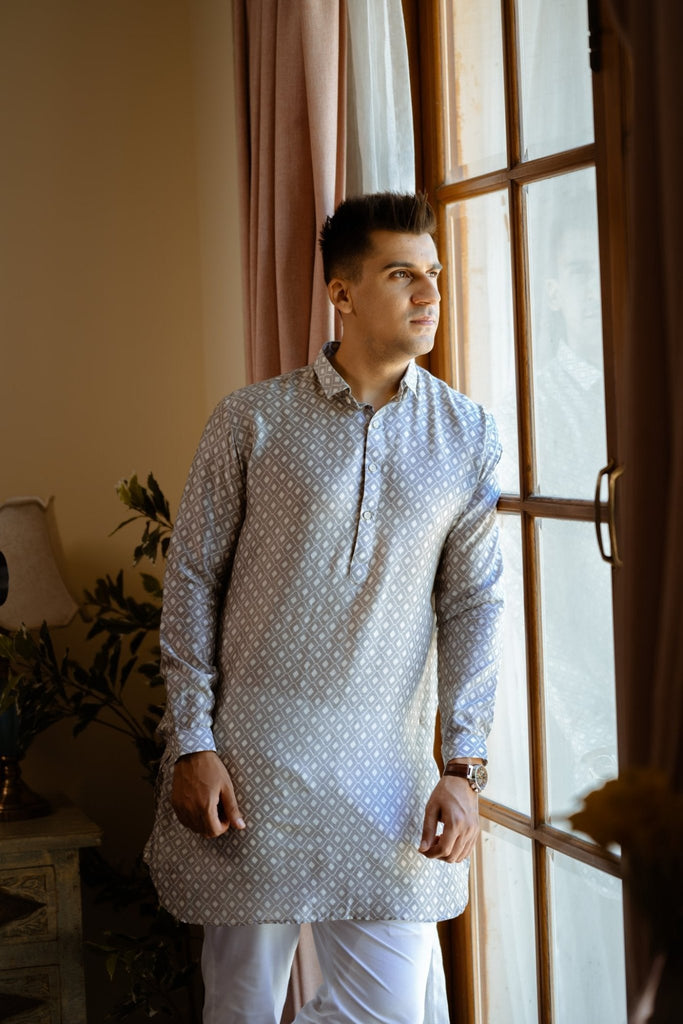A perfect blend of simplicity and style supporting classic kurta patti with shirt collar and cuffs. The round bottom and diamond self pattern gives it a trendy look.