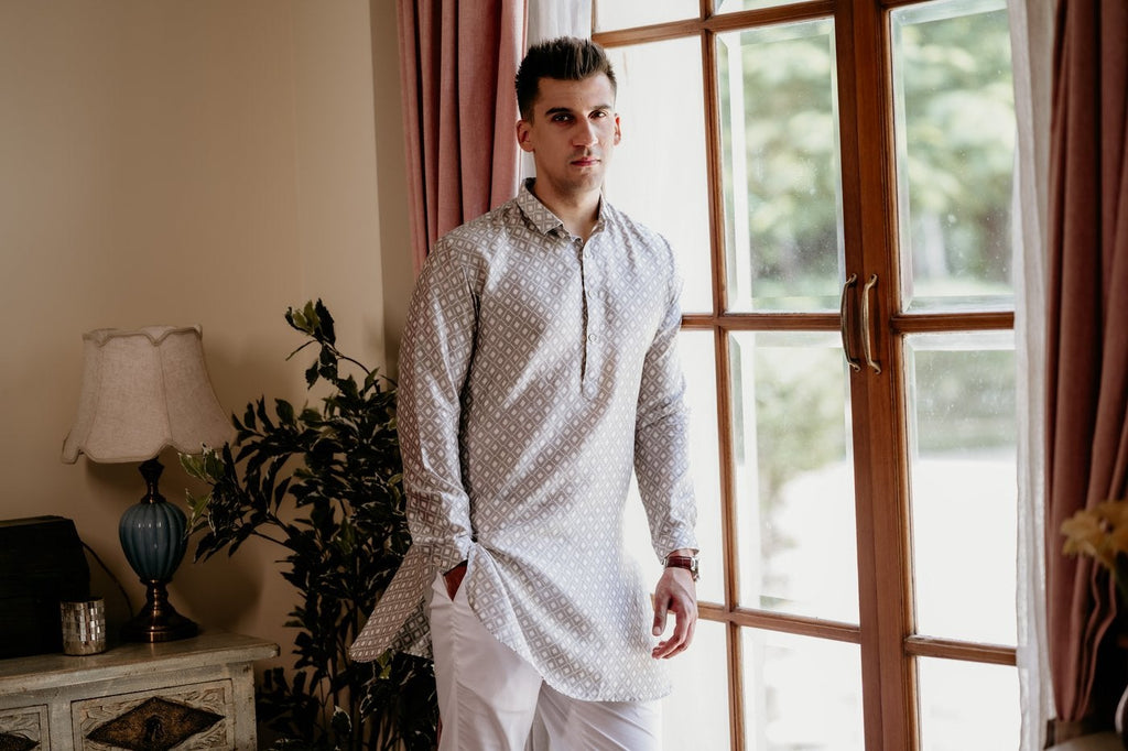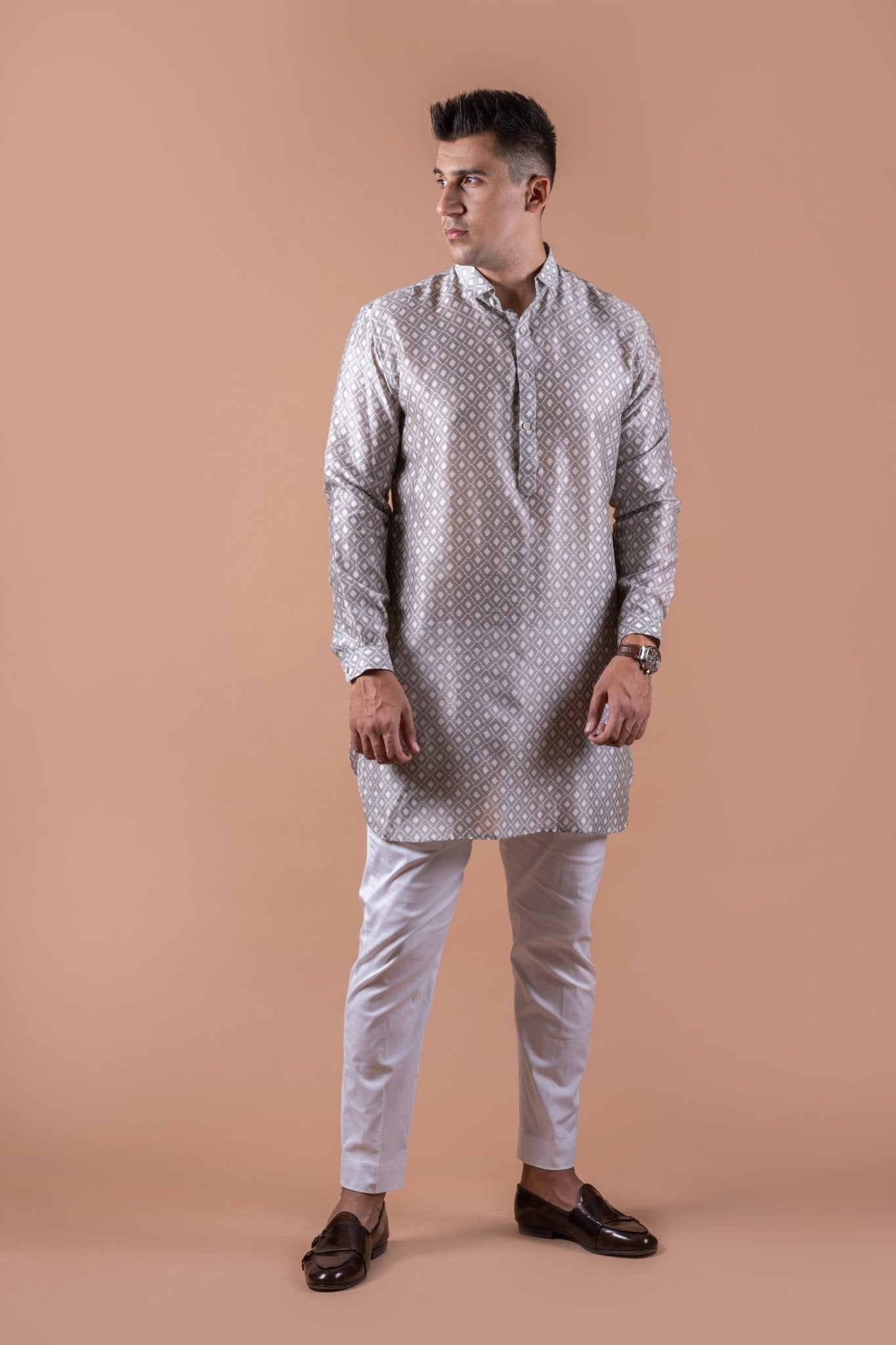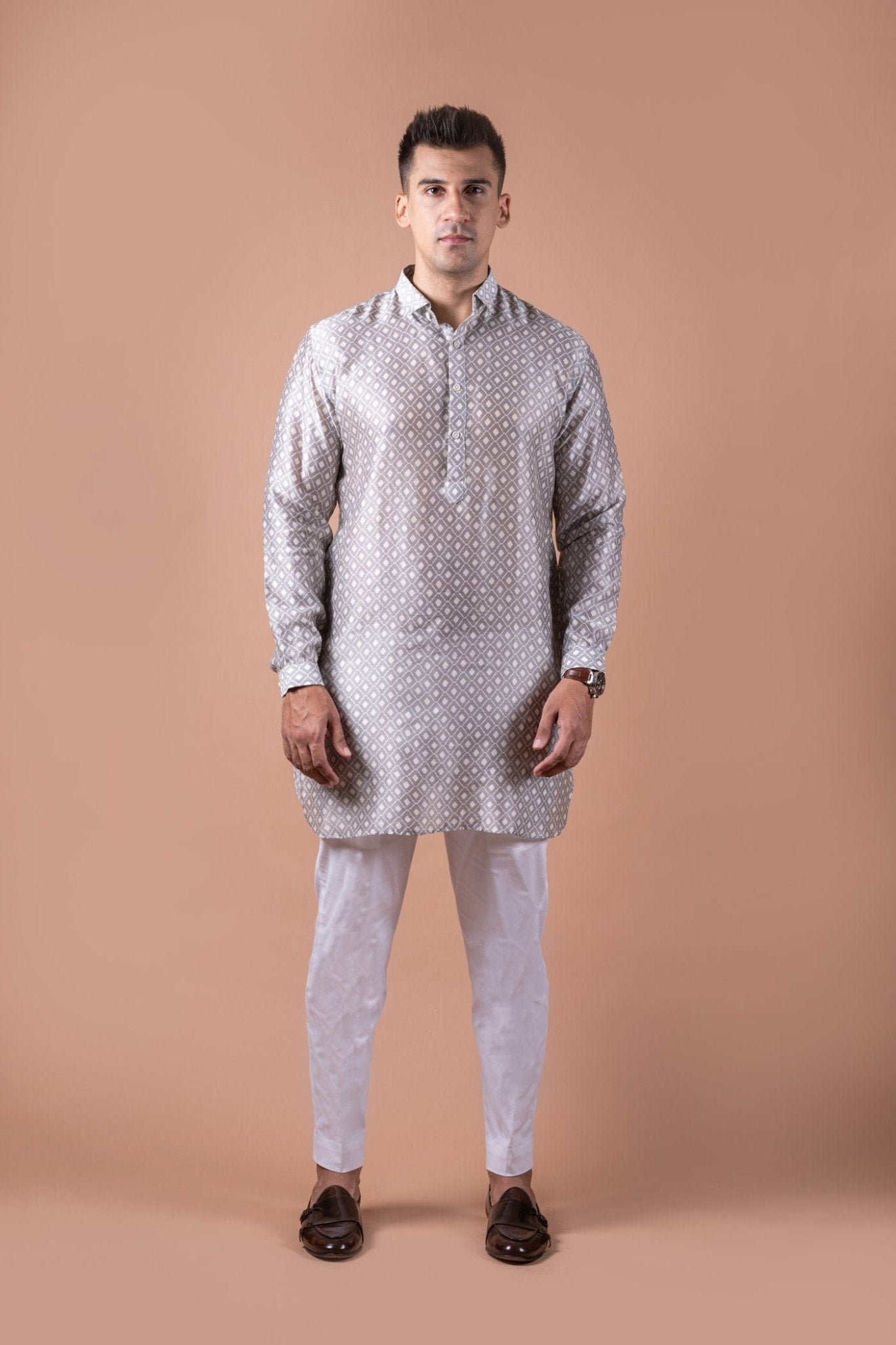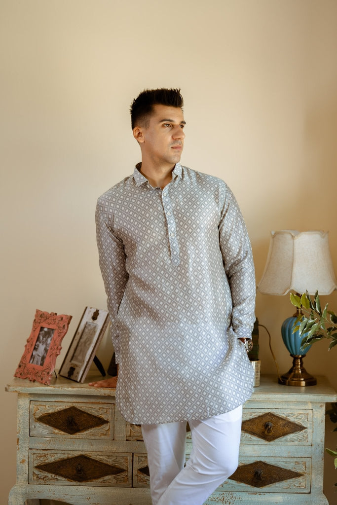 A perfect blend of simplicity and style supporting classic kurta patti with shirt collar and cuffs. The round bottom and diamond self pattern gives it a trendy look.