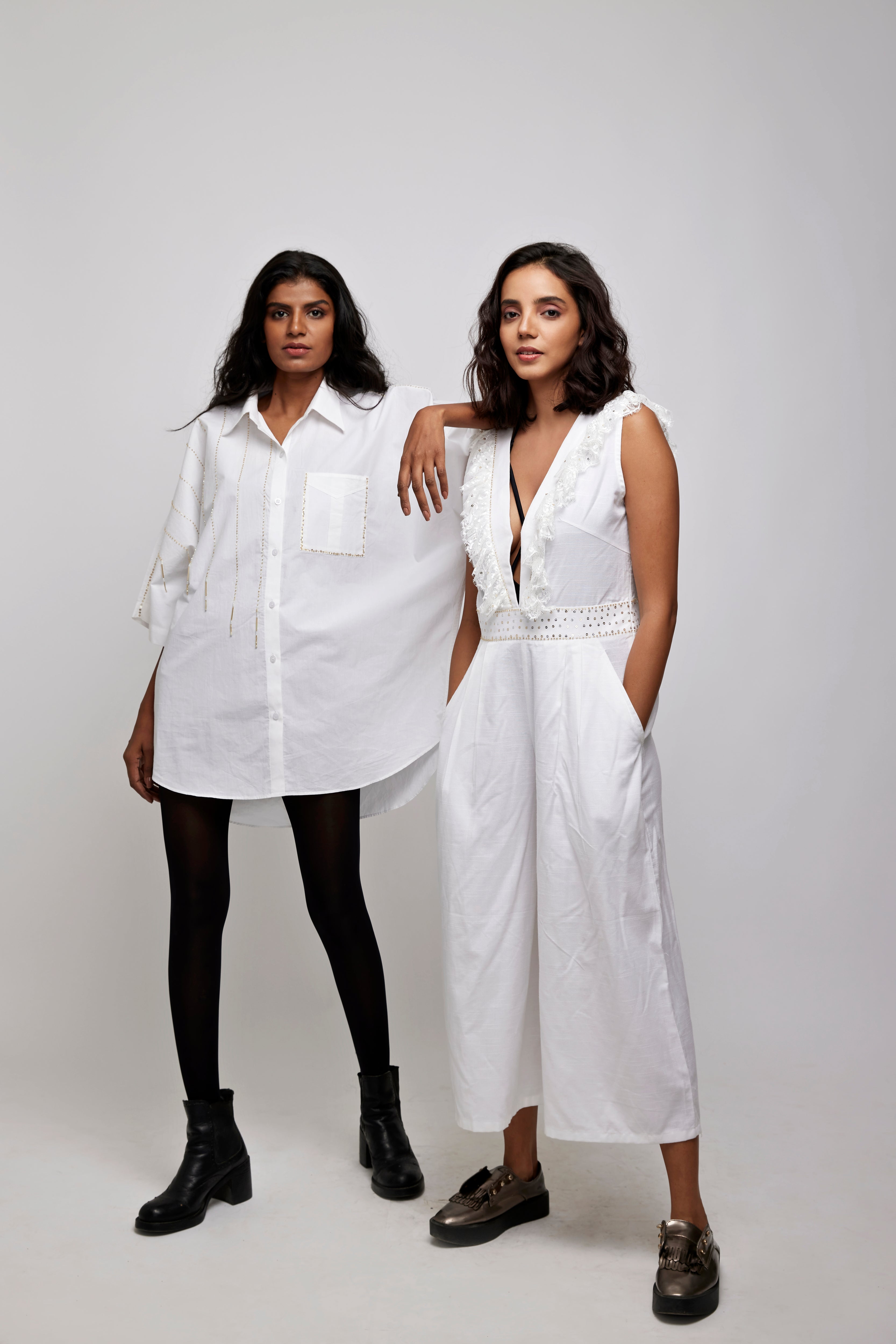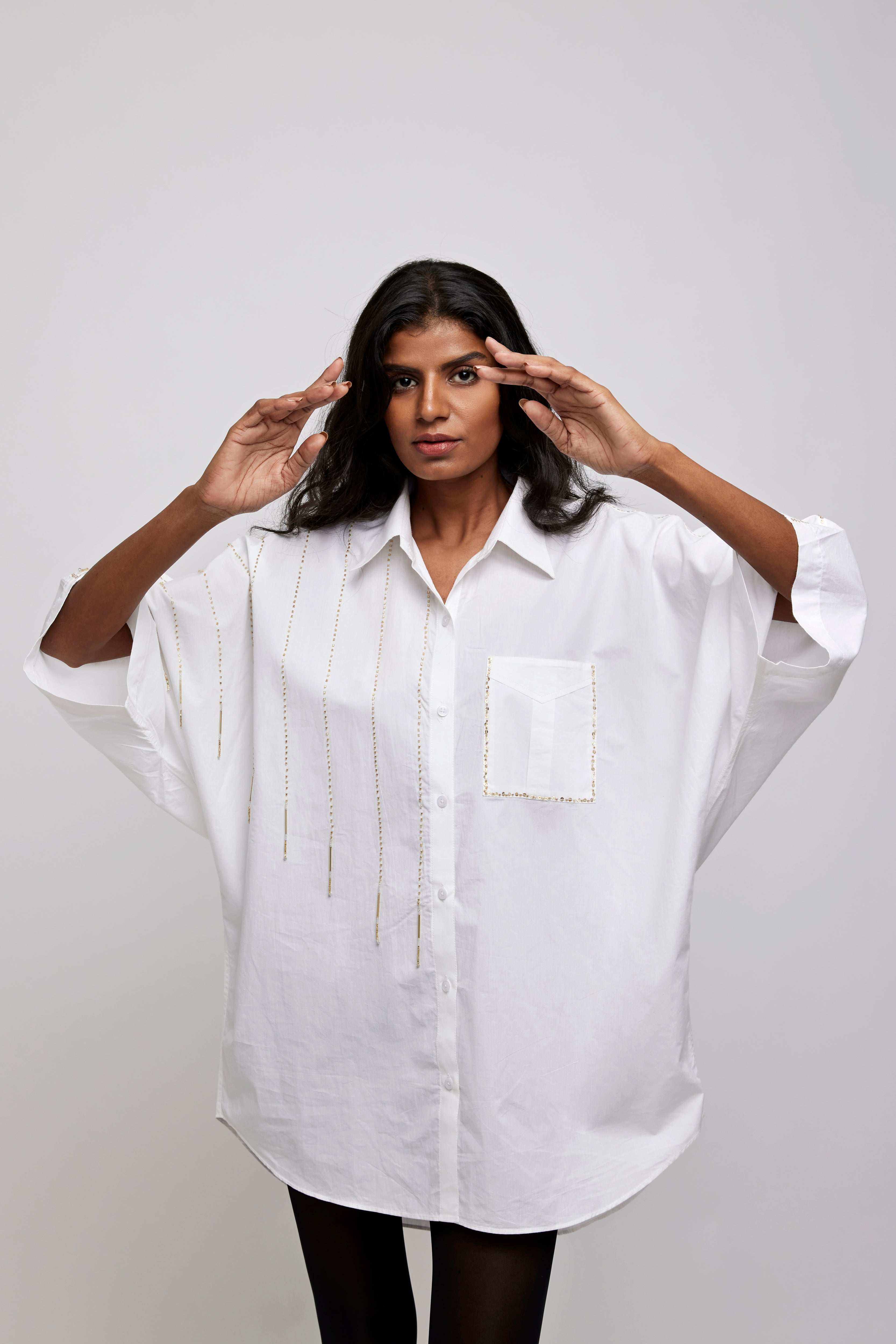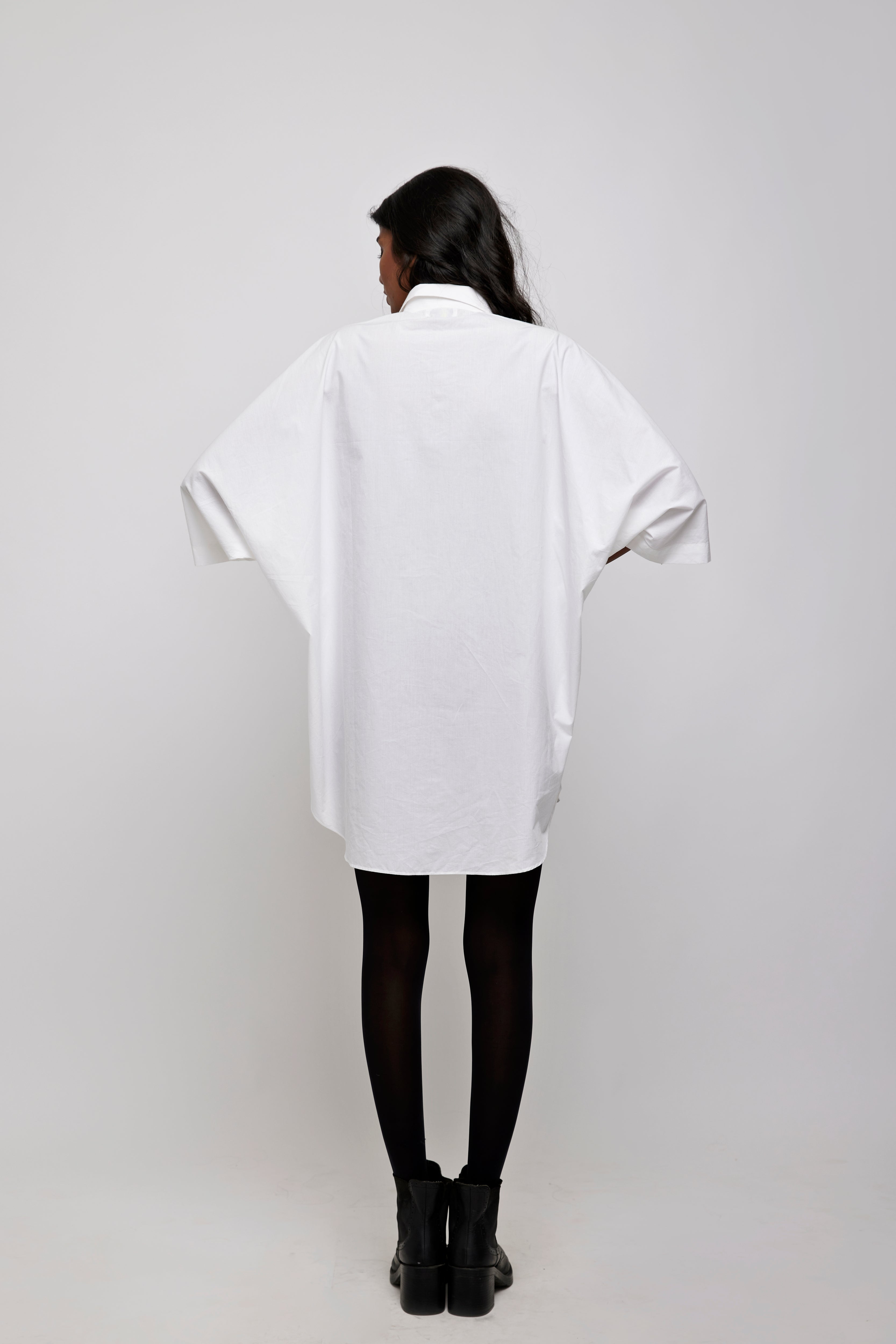 Oversized shirt with a classic collar and classic patch pocket with box pleat.