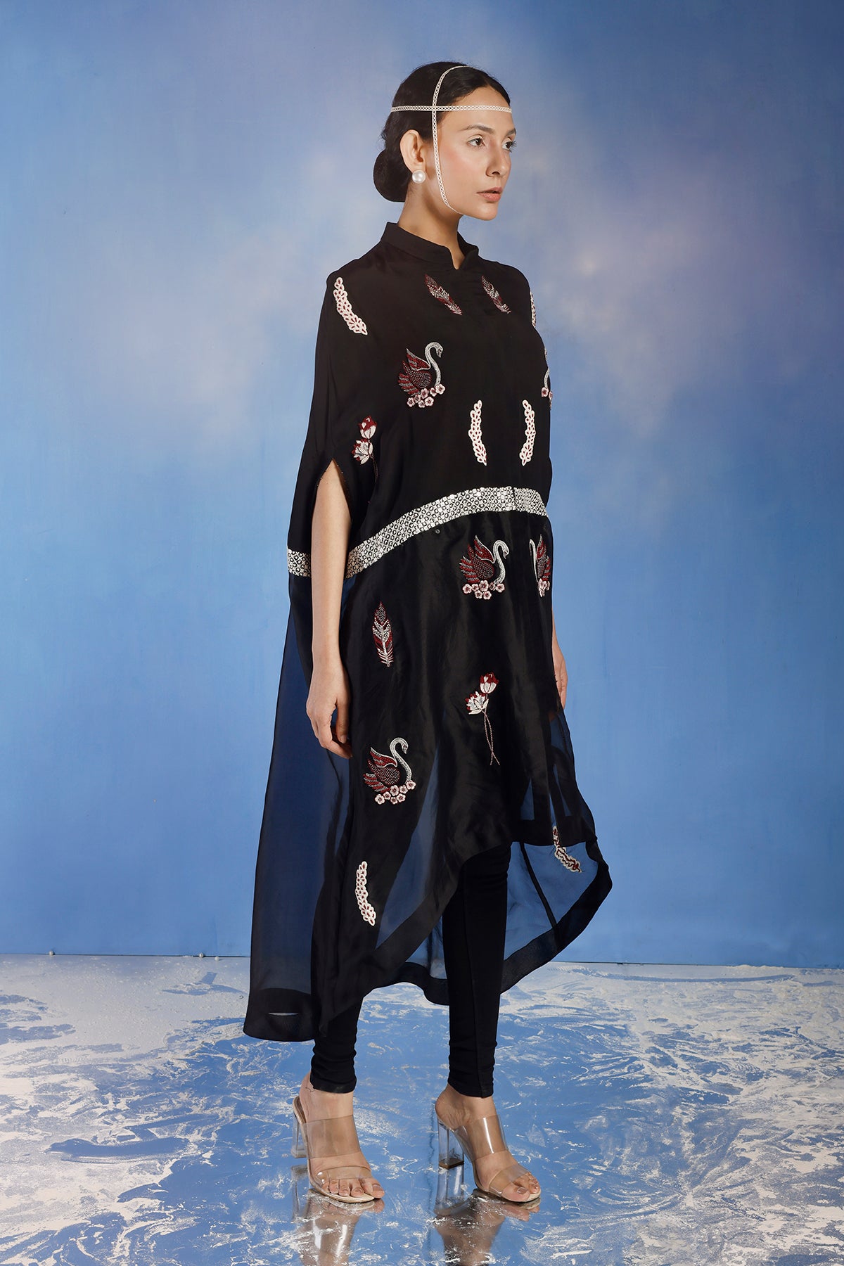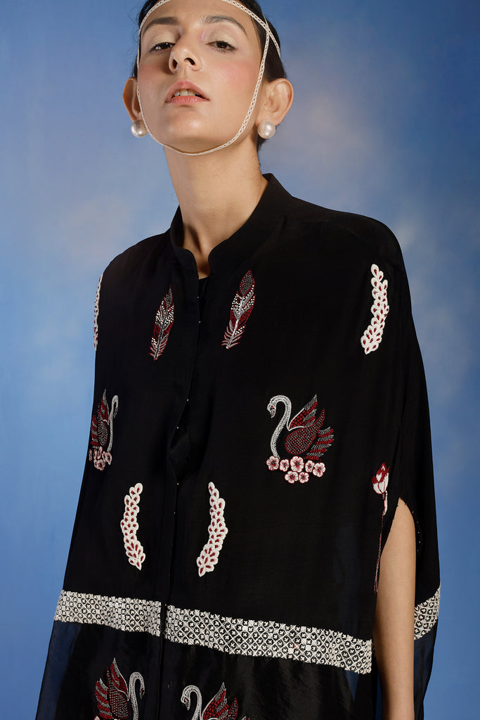 An embroidered half and half drape cape top. With embroidered motifs and scallop detail.