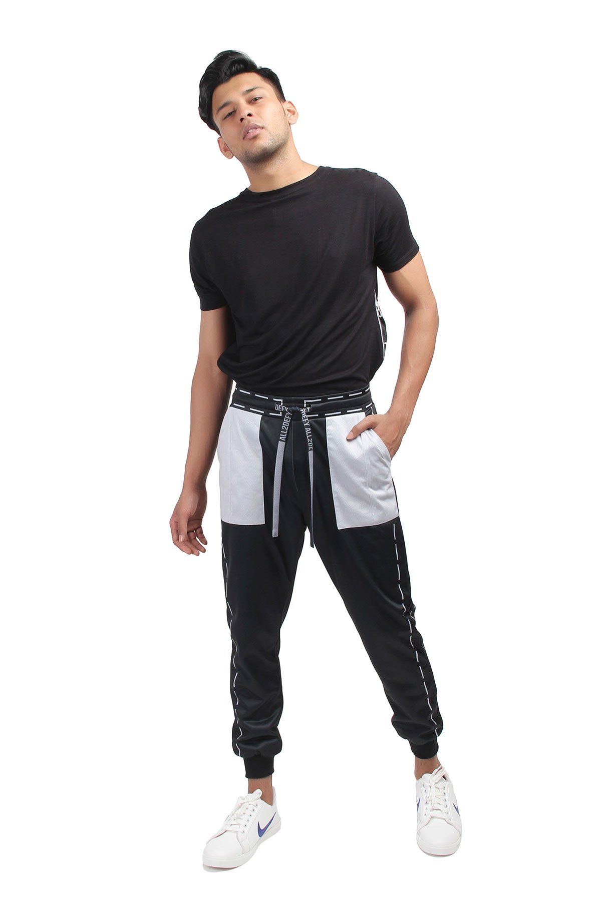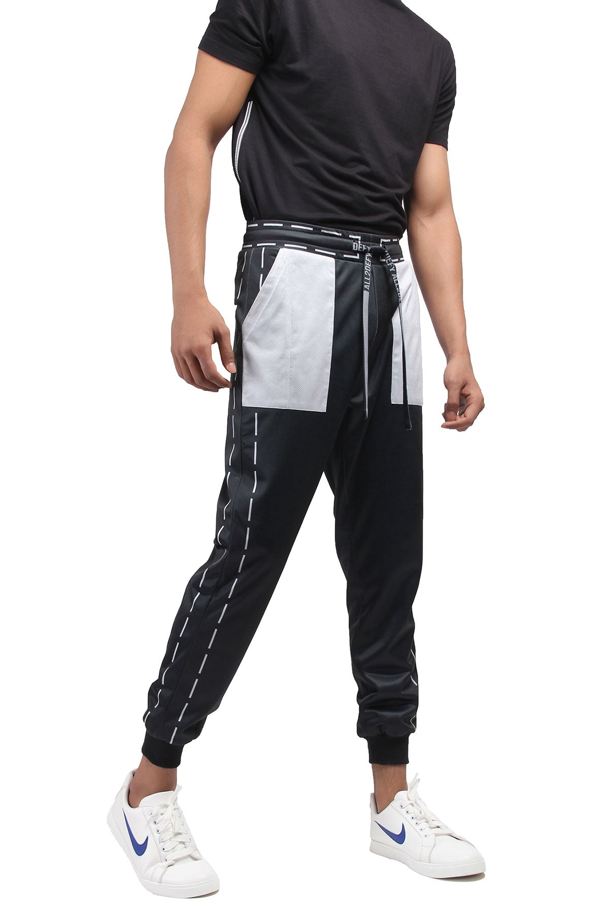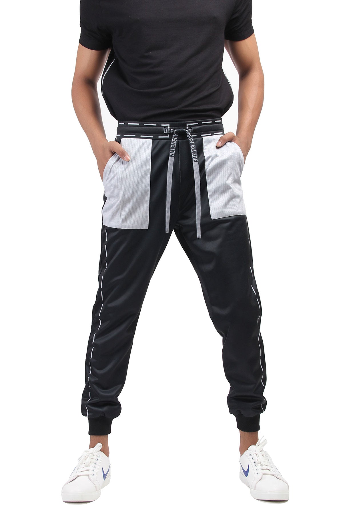 Polyester-terry joggers in black. Hand stitch printed in grey throughout. Mid-rise. Two-patch pocket styling. Mesh pocket in grey. Signature ALL2DEFY black mesh drawstring with grey print. Elasticized waistband. Rib-knit cuff.