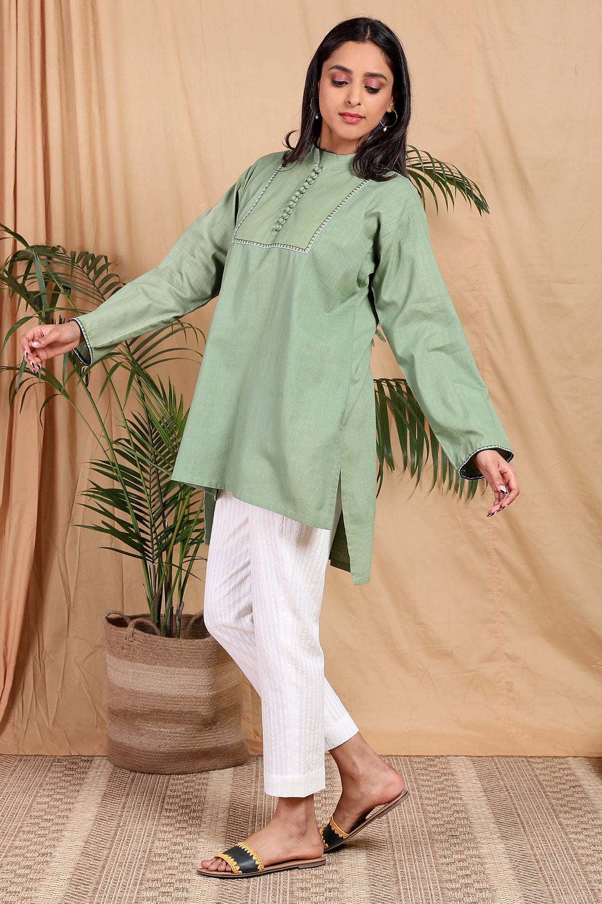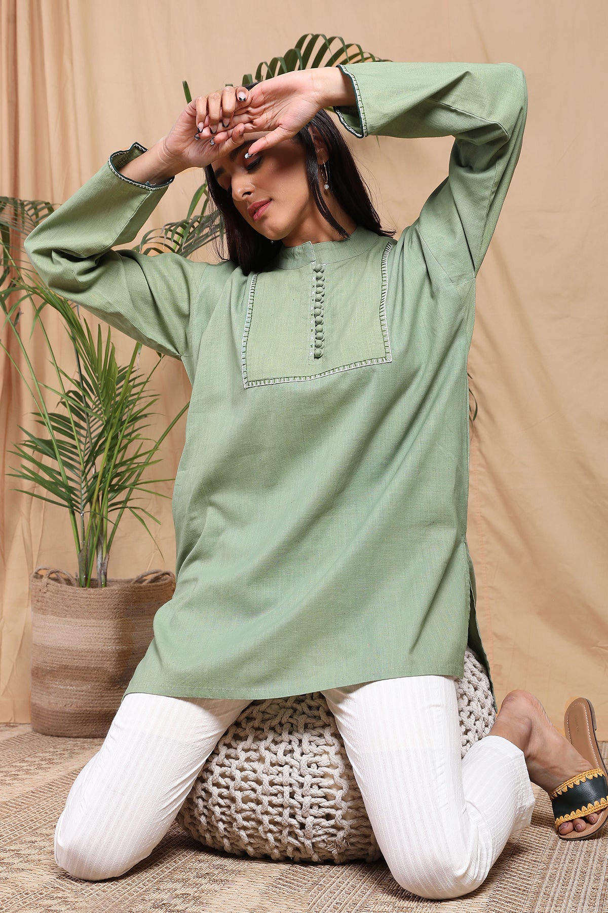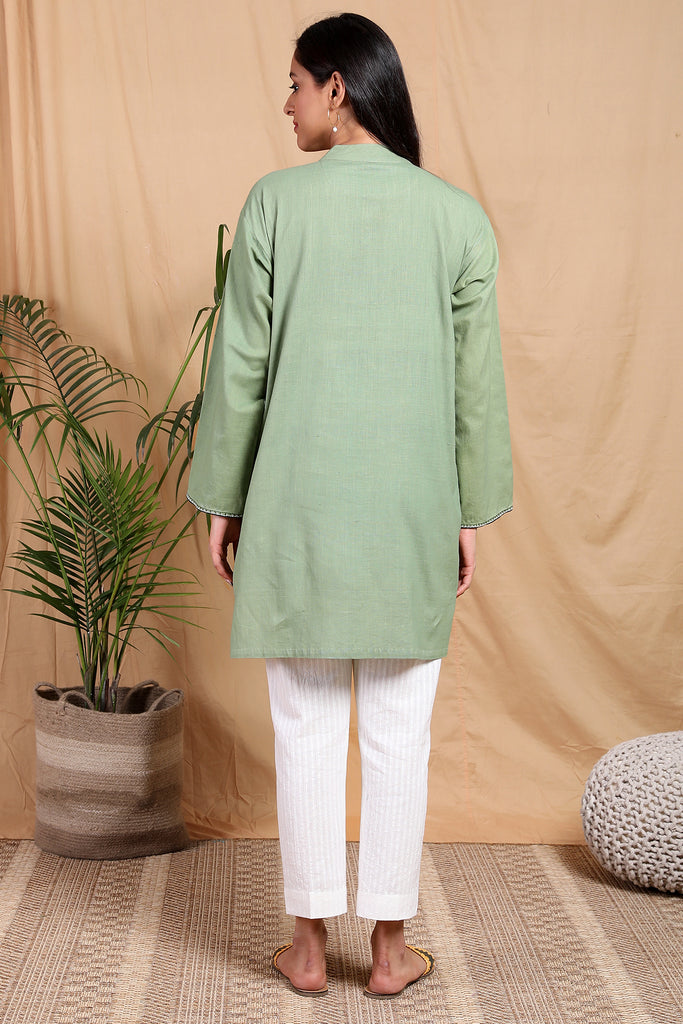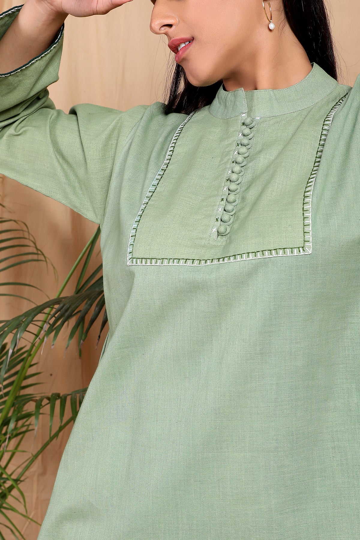 Made in a beautiful shade of Green, this Kurta is the epitome of effortless styling. This comfortable Kurta comes crafted in Handwoven Linen fabric. Dainty potli buttons running down the front and hand embroidery stitches around the neckline and cuffs add to the allure.