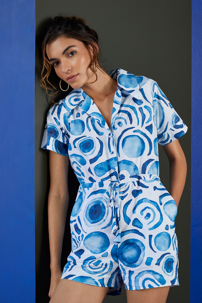 Short sleeves playsuit in our blue Head In The Clouds print. Styled with a drop down collar, pockets on both sides and a waist tie for the perfect fit.