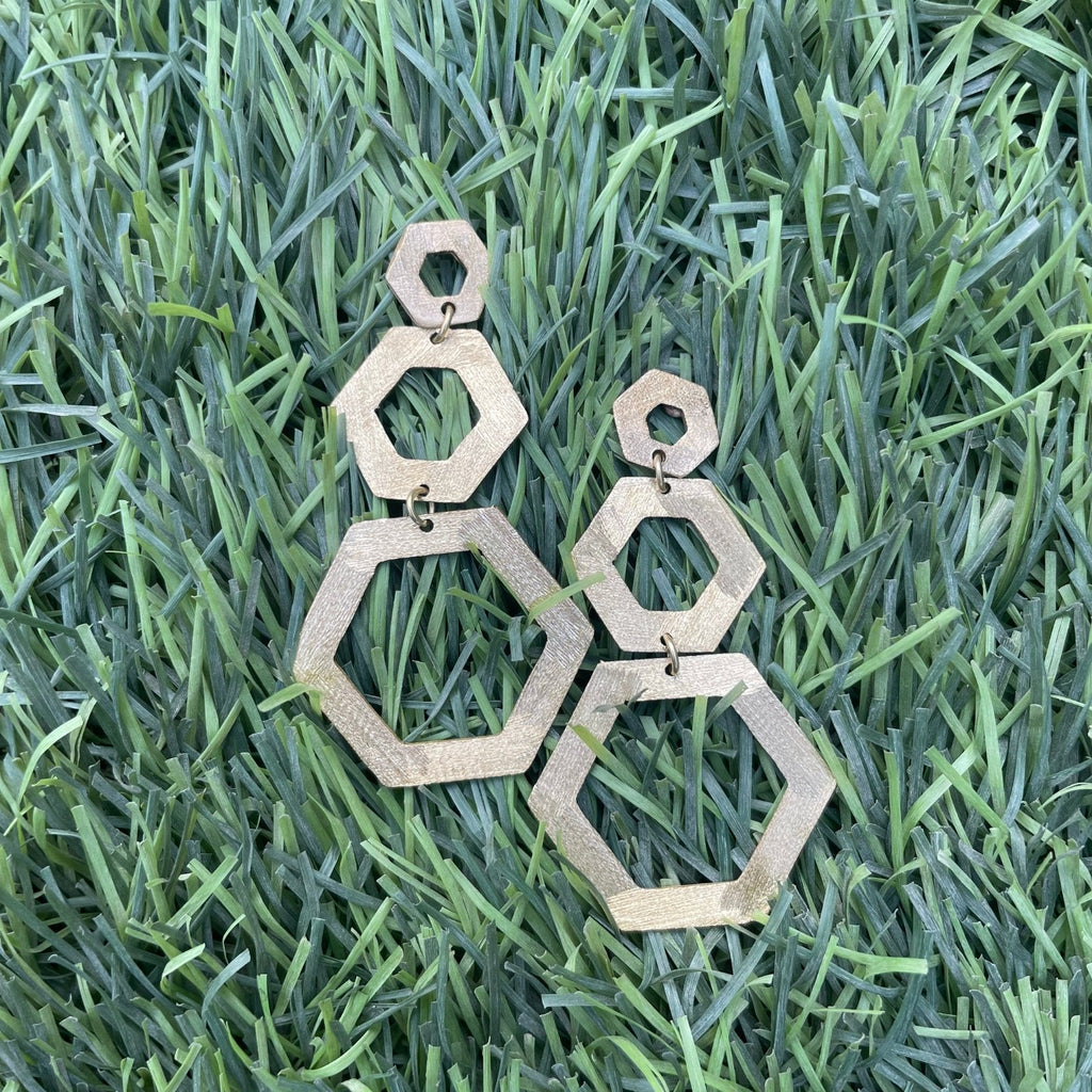Minimal Honeycomb inspired earrings. Small, medium and large centre cut hand-cut pieces are attached with a single loop.