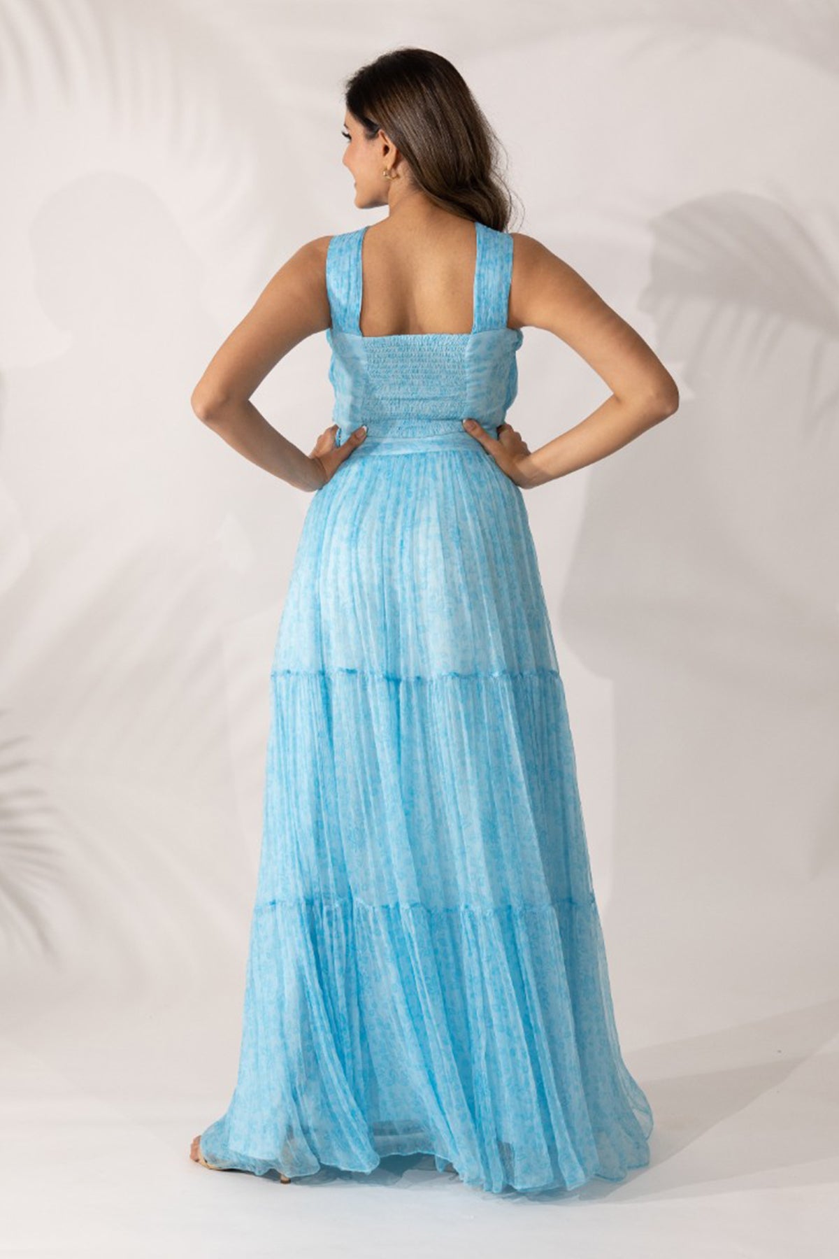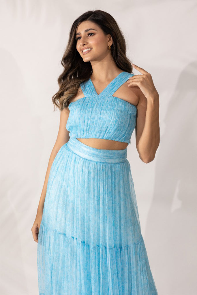 A chiffon tiered maxi skirt is such a delight. It manages to have a remarkable lightness when indeed it has the most extravagant flare. It’s a set made of meticulous hand pleated details from the strap of the crop top to the waistband of the skirt, we have left no stone unturned. Enjoy a day out in the sun in a super comfortable co-ord made of natural materials while shining in the limelight.