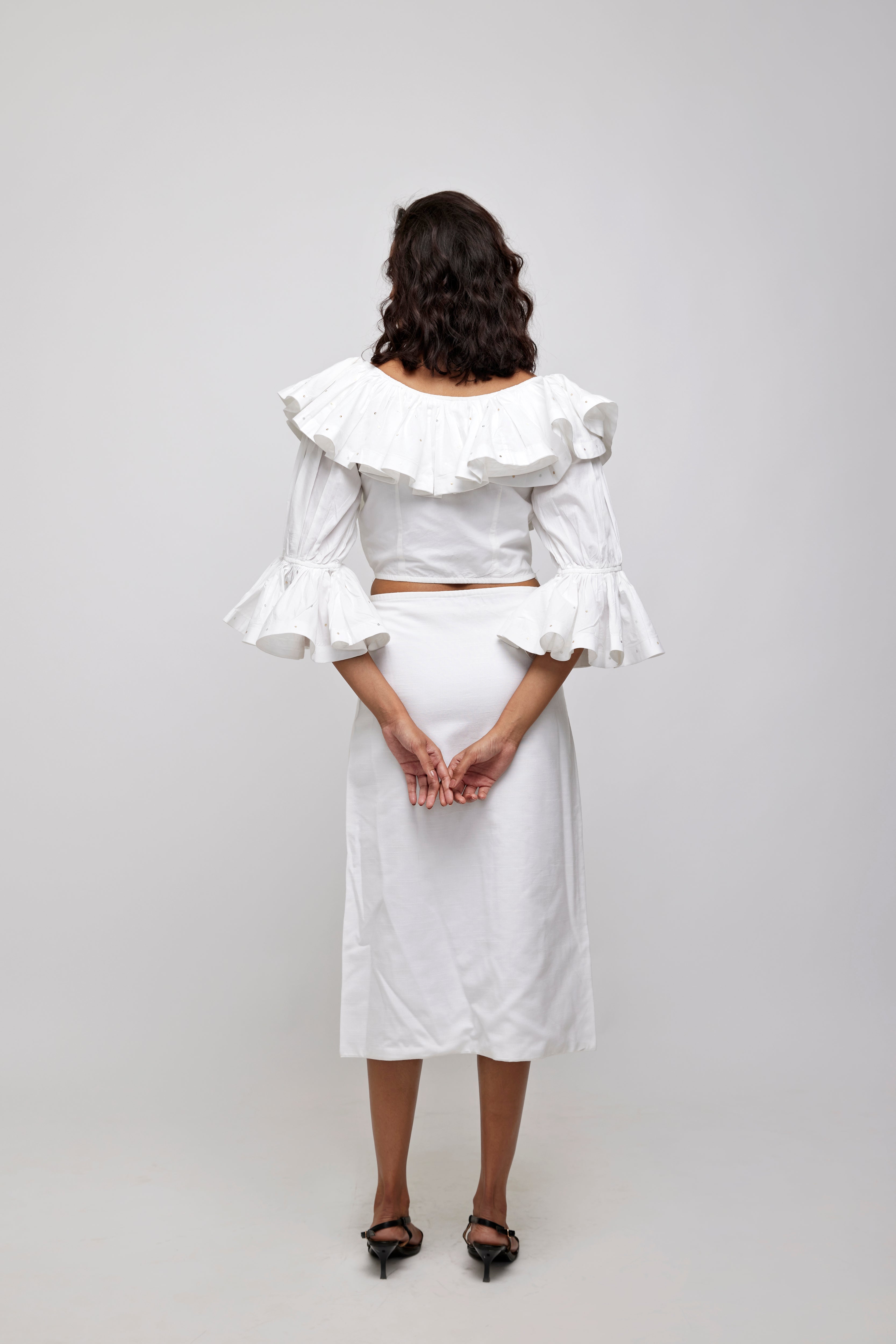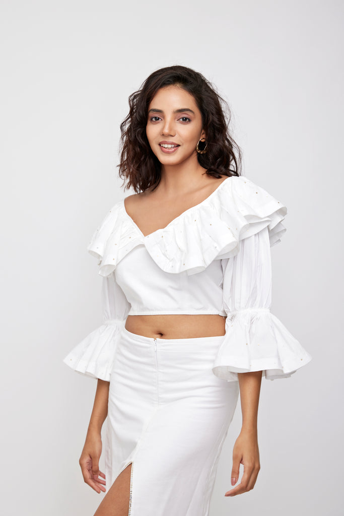 Crop top , off shoulder double ruffle full circular with sequins embellished. 3/4th peasant sleeves.