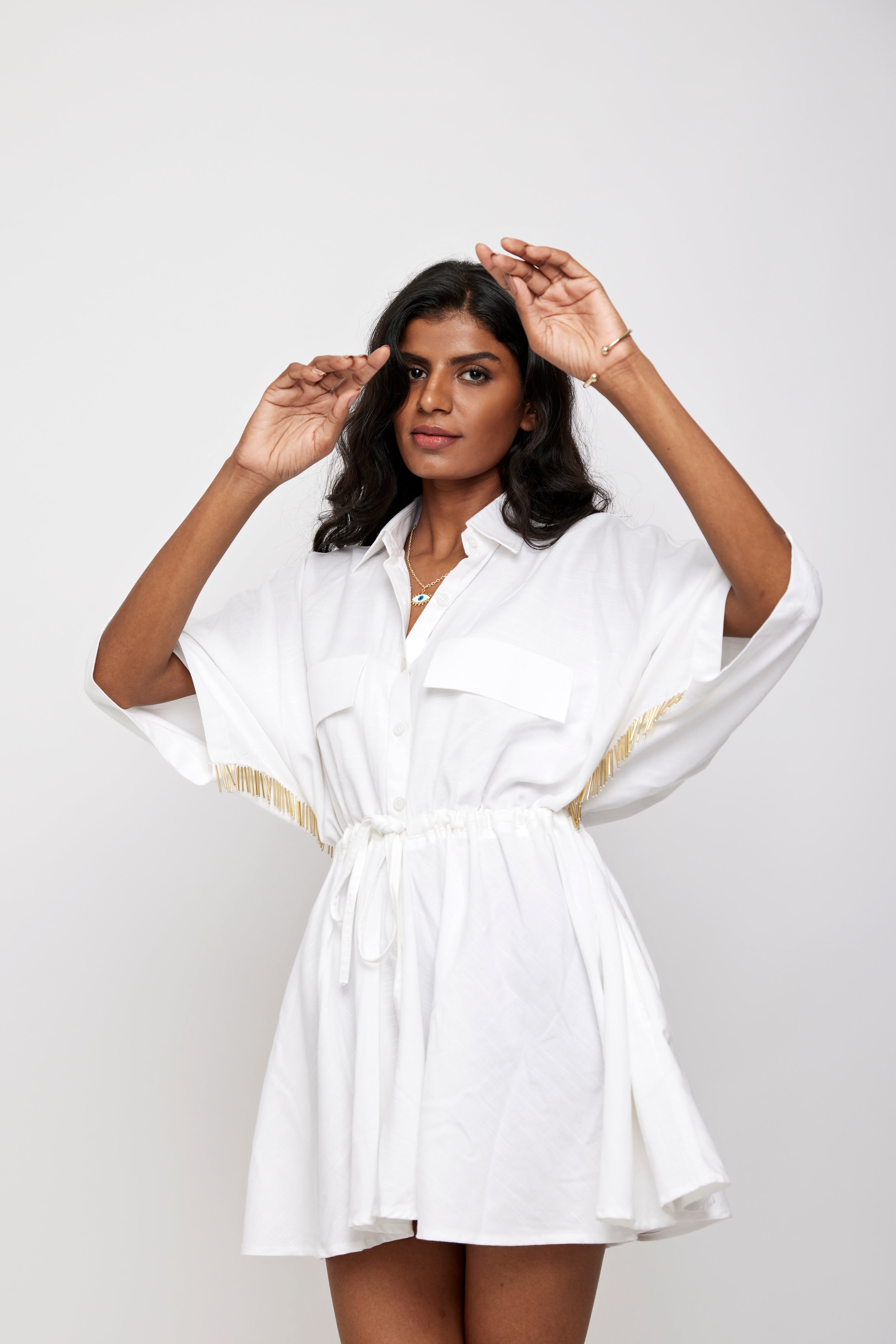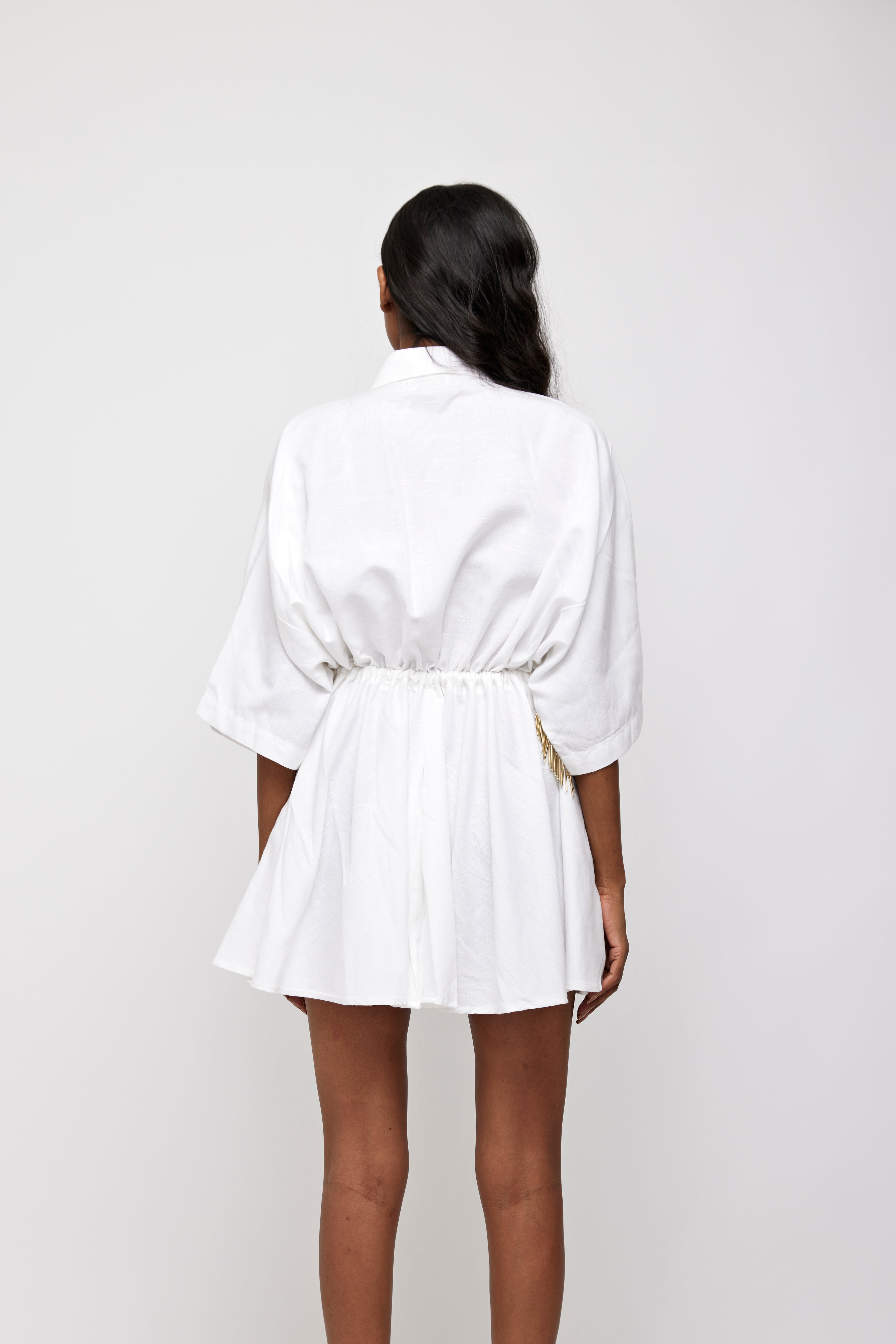 Tie up and flare short length shirt dress with button down front open.