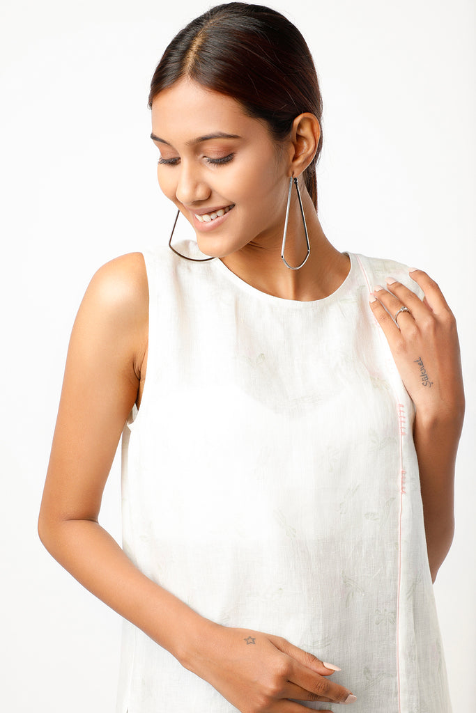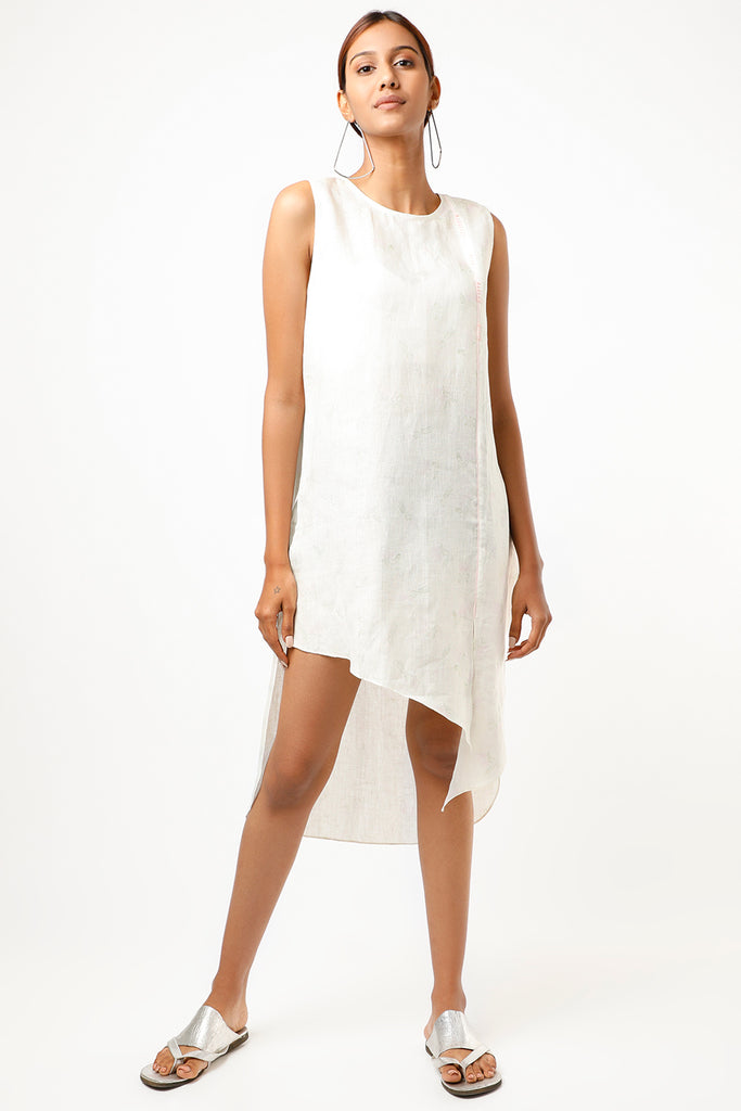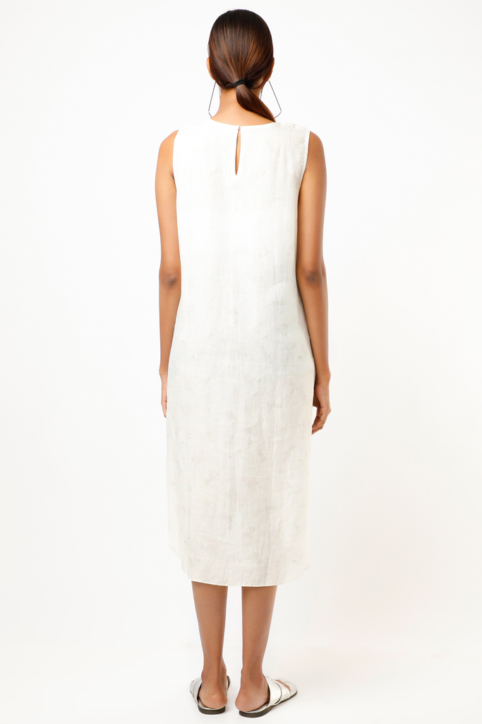 Featuring a ivory calla lilie digitally printed sleeveless dress in linen base with asymmetrical hem and anchor embroidery detailing.