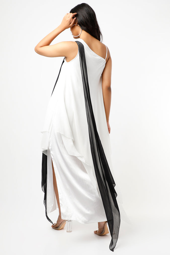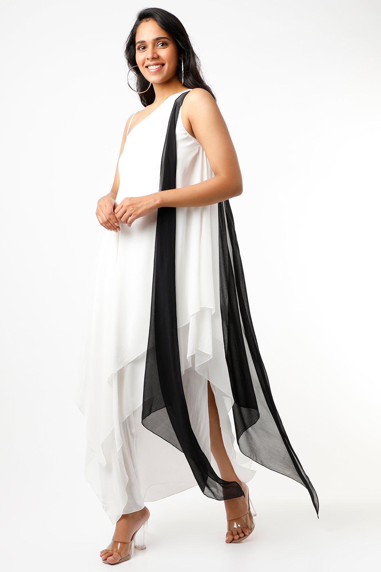 Featuring a ivory one shoulder layered maxi dress with Black shoulder drape in georgette base.