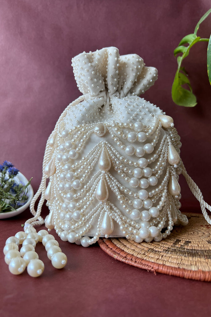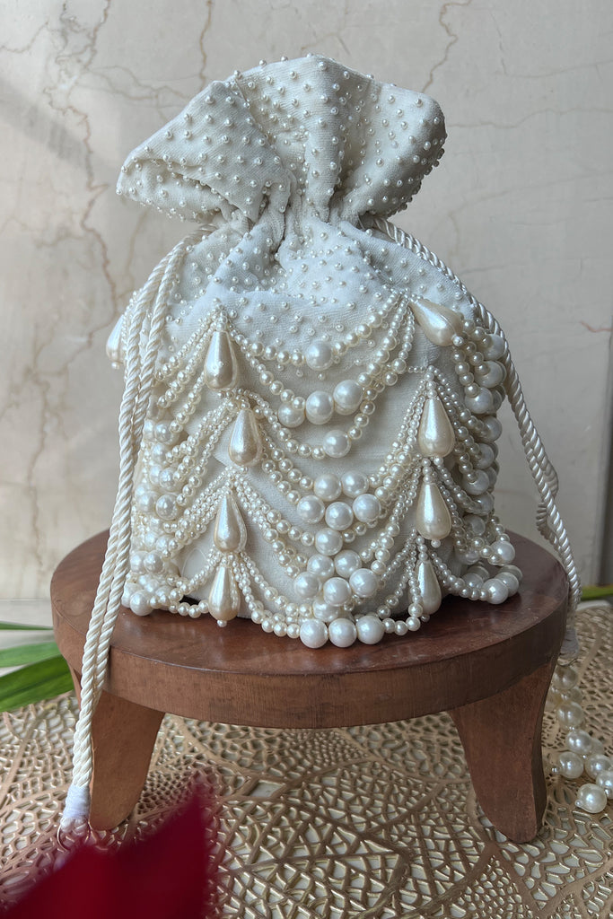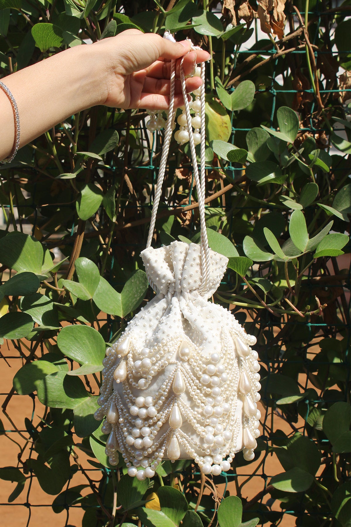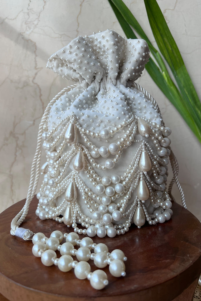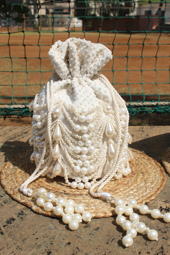 Hand Embroidered White bucket velvet potli with pearl work . The potli comes with a detachable beaded handle. Work on both sides.