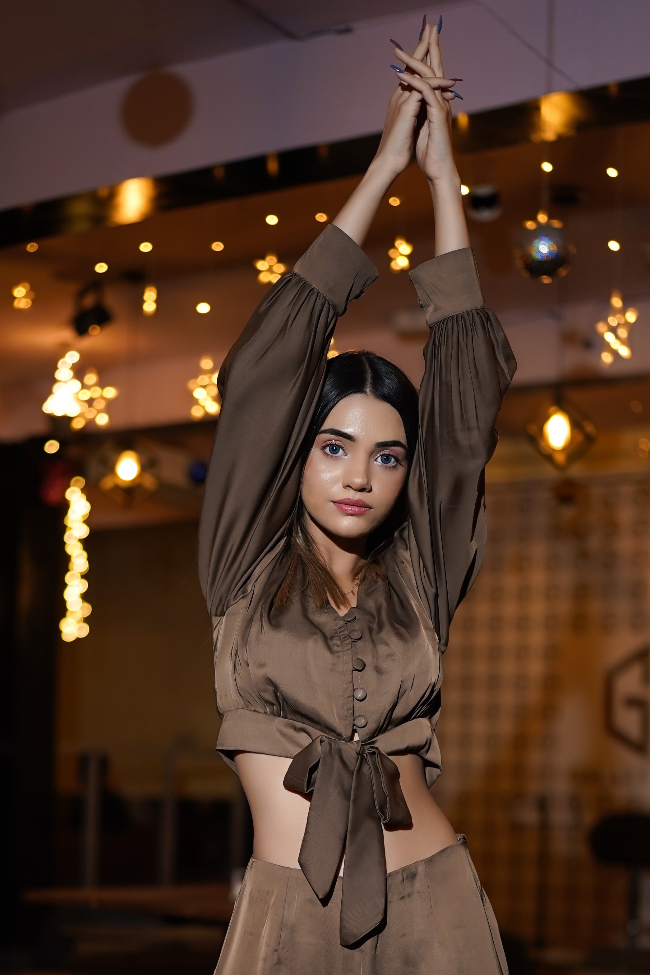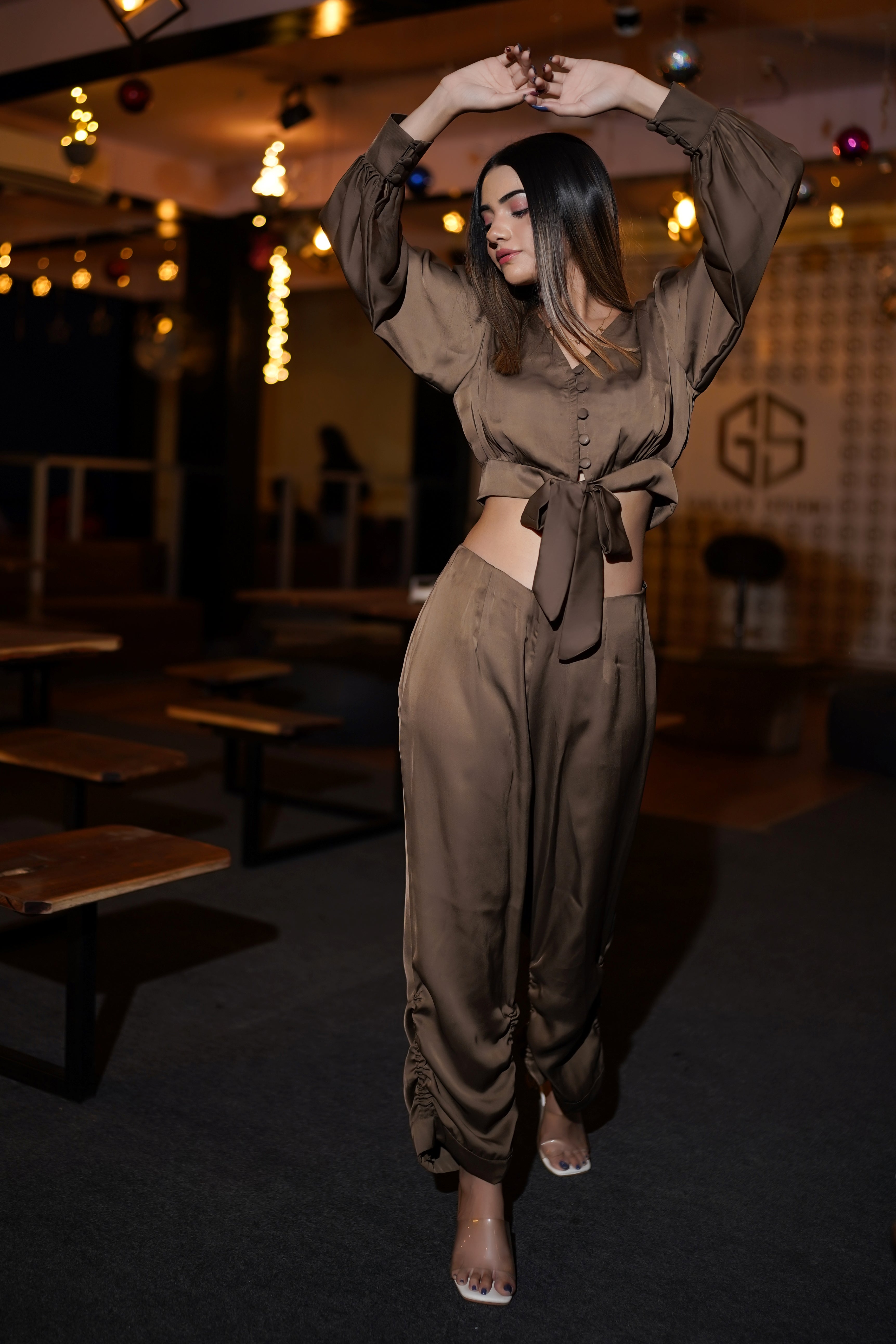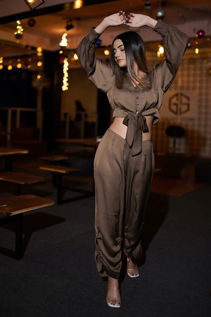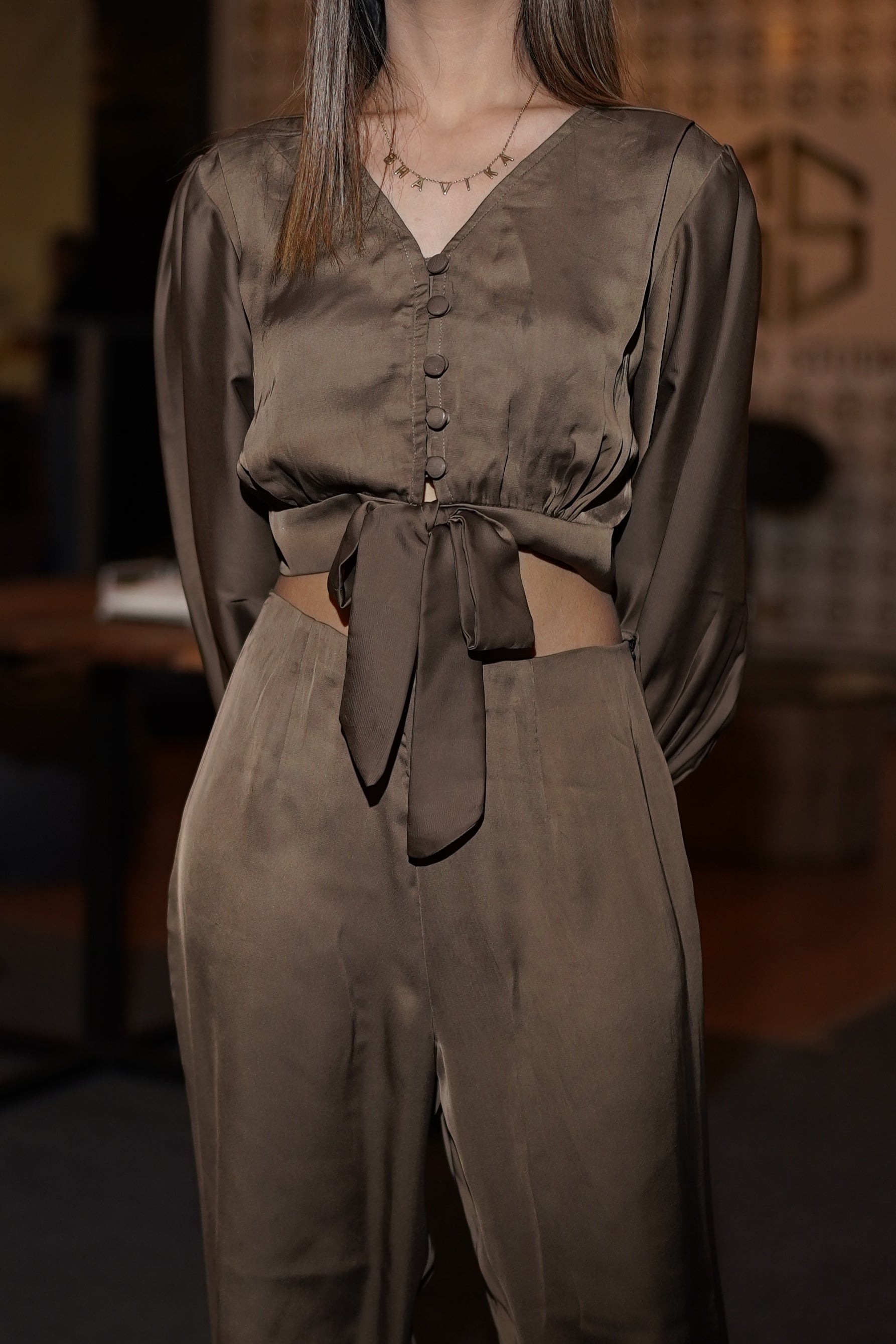 This copper colour top has a retro feel that is timeless and trend defying. Faultlessly made from satin fabric, it features a V neck, enchanting bishop sleeves with button on calf and a buttoned front with tie knot. From now online from MANNMANI.