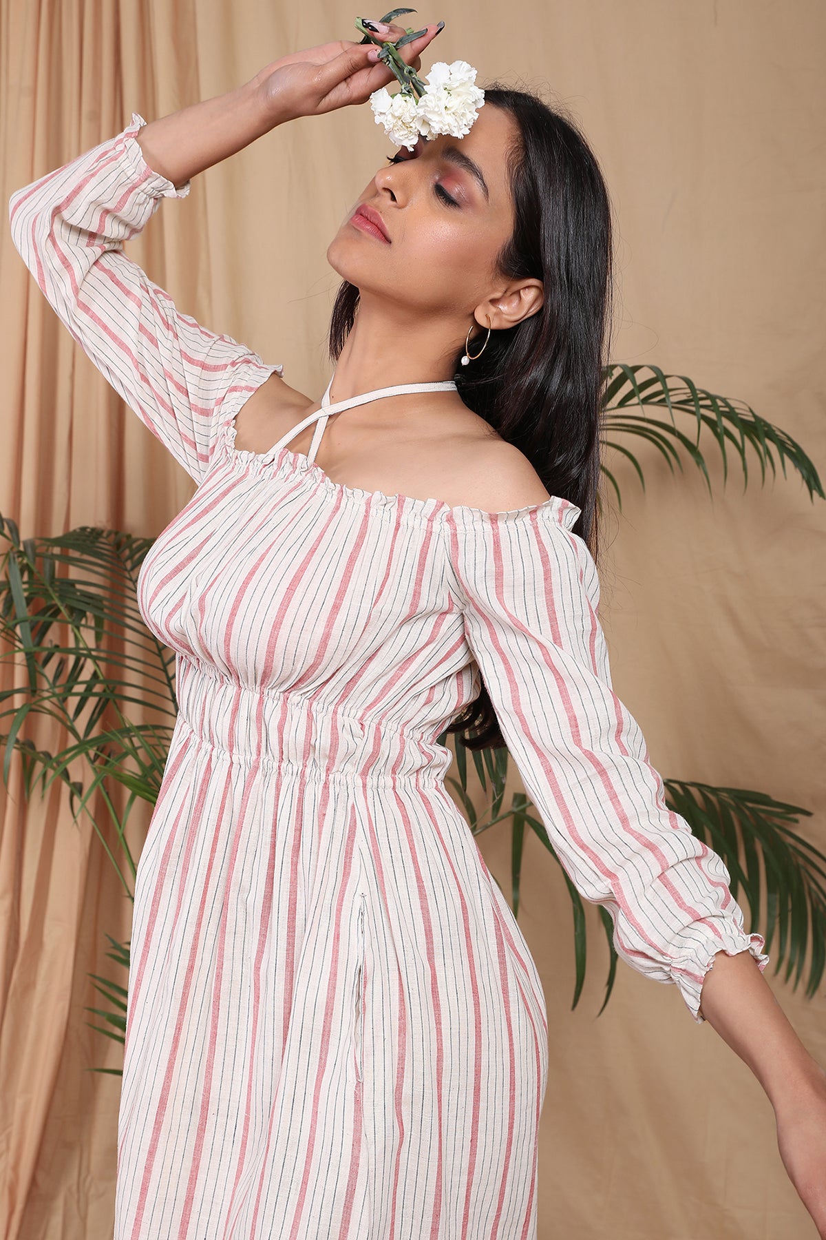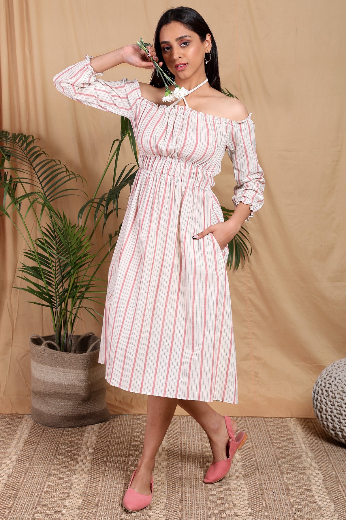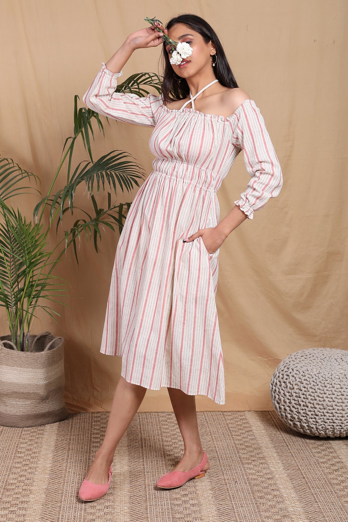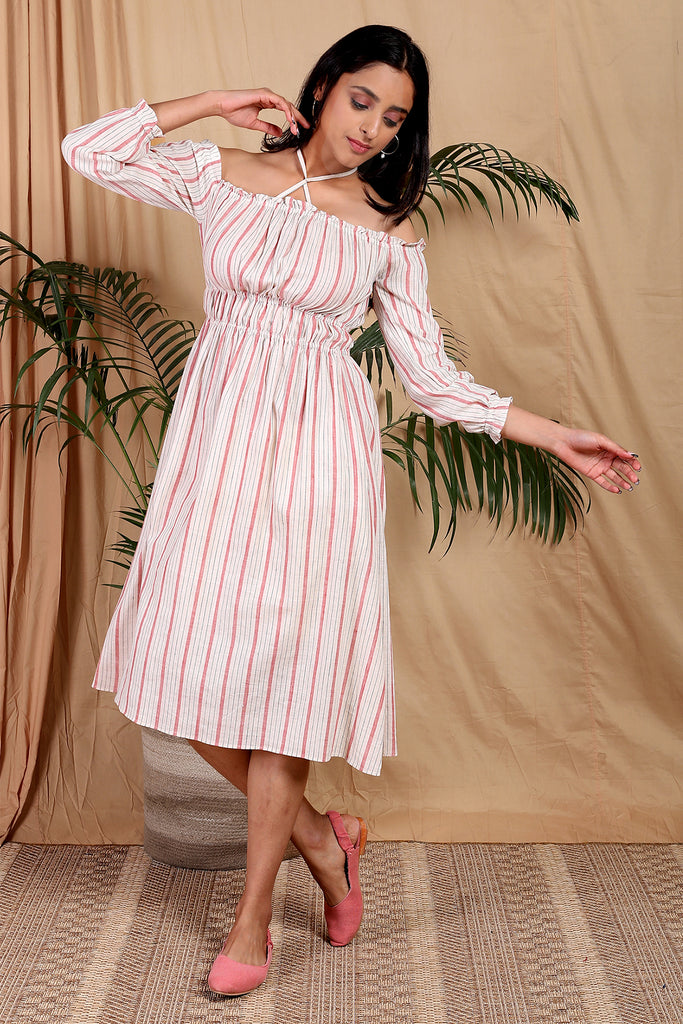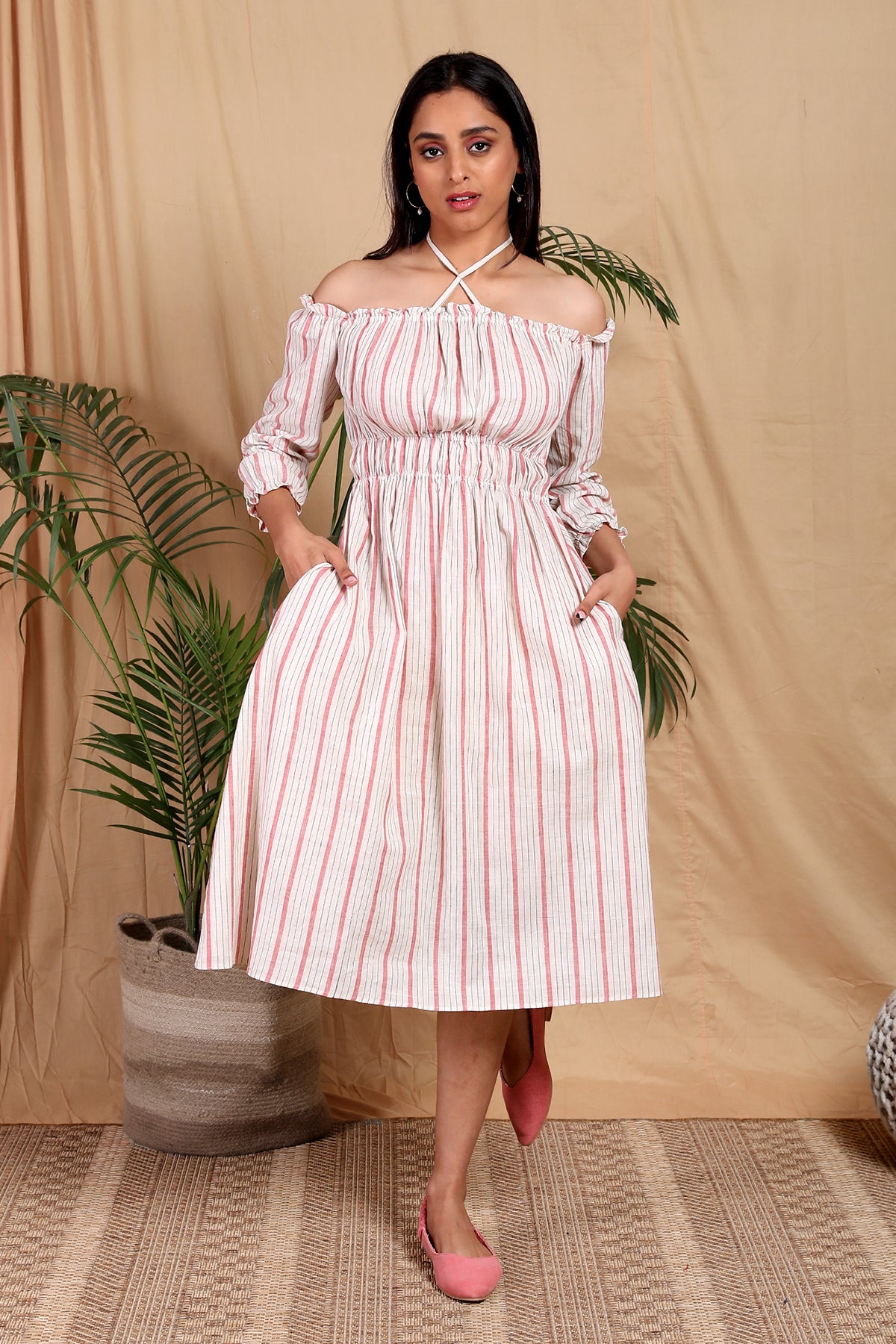 Our Khushali Dress is made with yarn-dyed Khadi stripe fabric. The fabric is handwoven. Tie-up detail at the neck lends an ethereal grace to the dress. Shirred at the waist, this is the perfect dress for a romantic date or if heading out. Show off those beautiful shoulders and neckline lovelies!