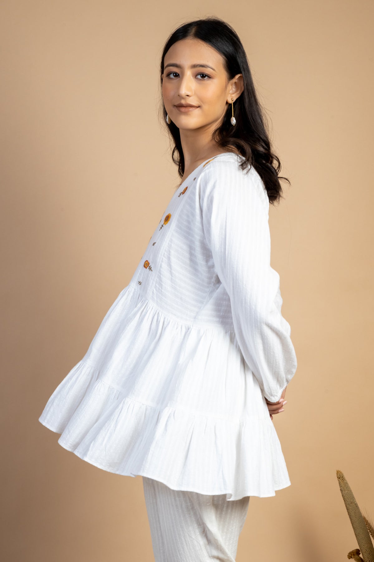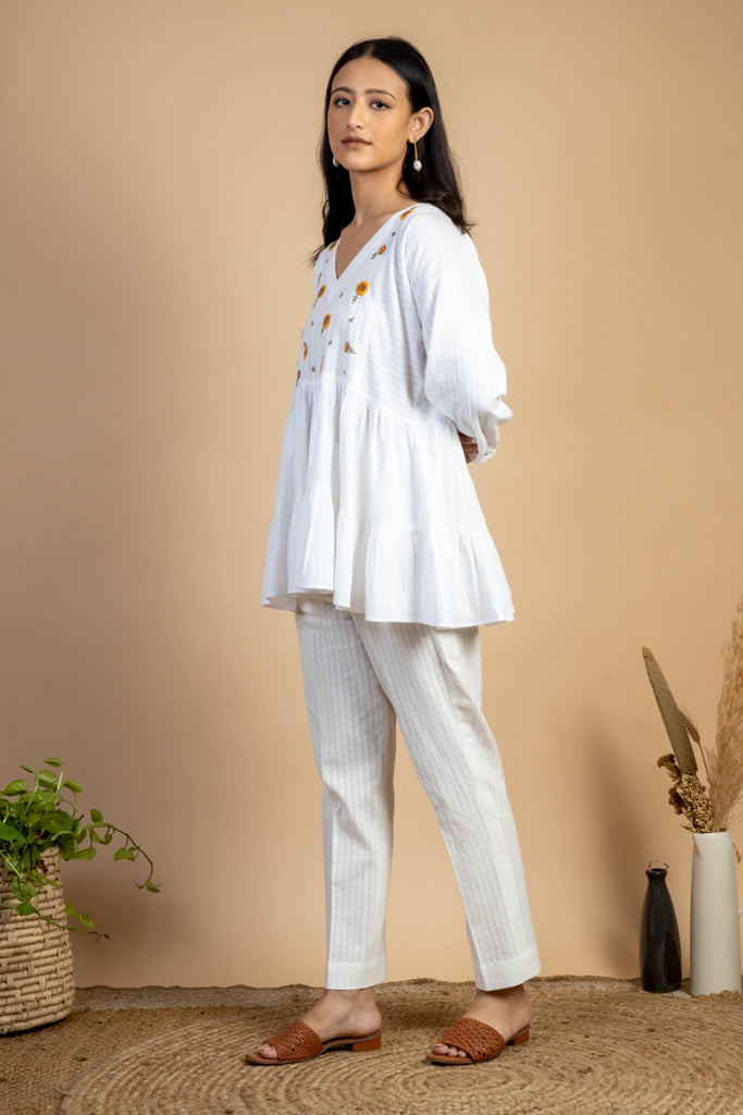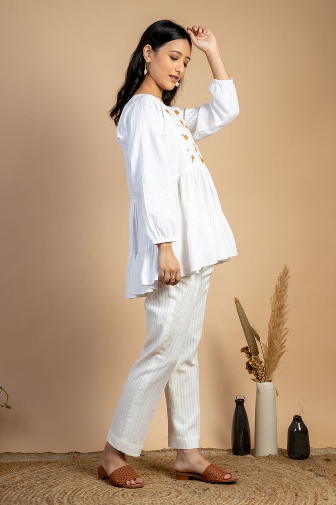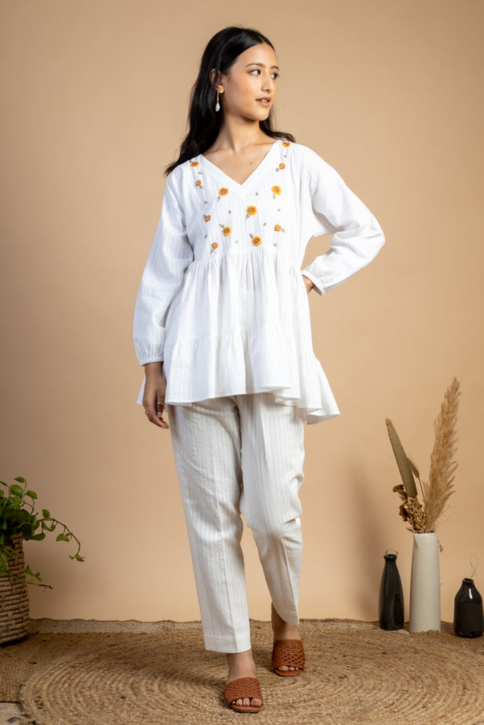 Prepare to get overwhelmed with compliments by wearing this handwoven cotton Tier top. It features floral hand embroidery in the front panel. This piece is our absolute favourite.