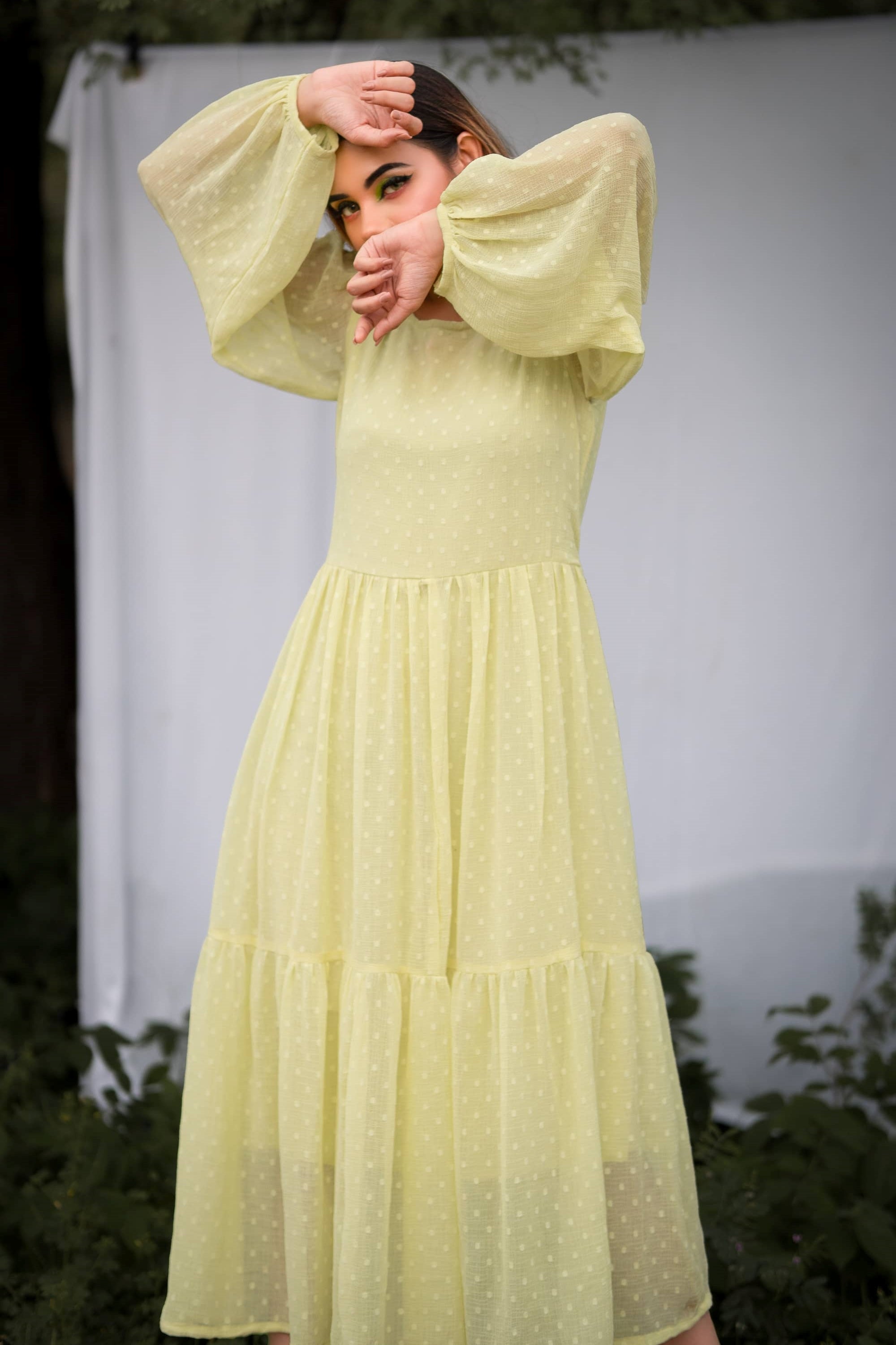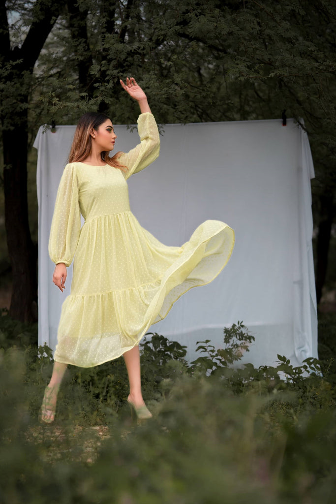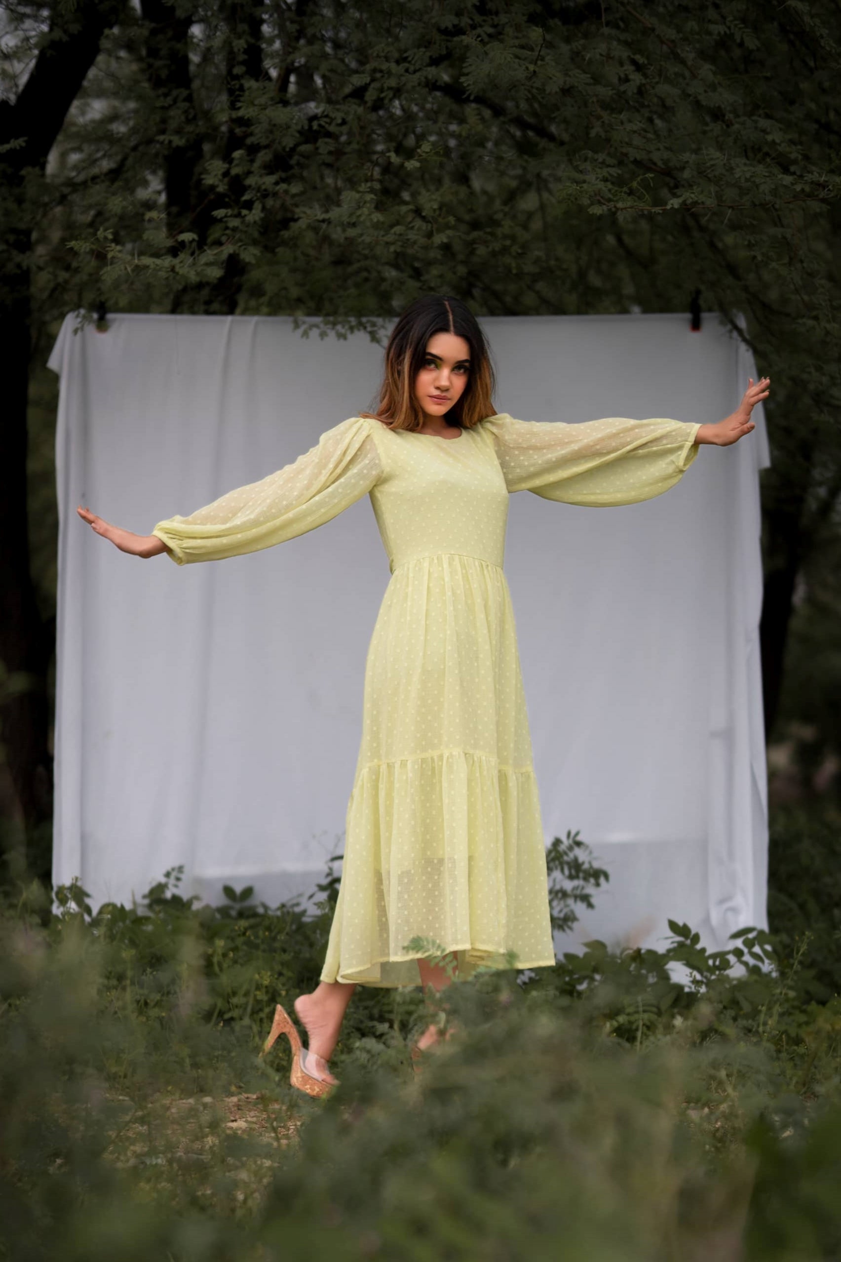 featuring this very beautiful midi princy tier dress handcrafted by MannMani. it has round neck, full sleeves, and 2 tiers.It has a very soft light weight and breathable fabric. Style this outfit with high heels and minimal hairstyle. shop online now from MannMani.