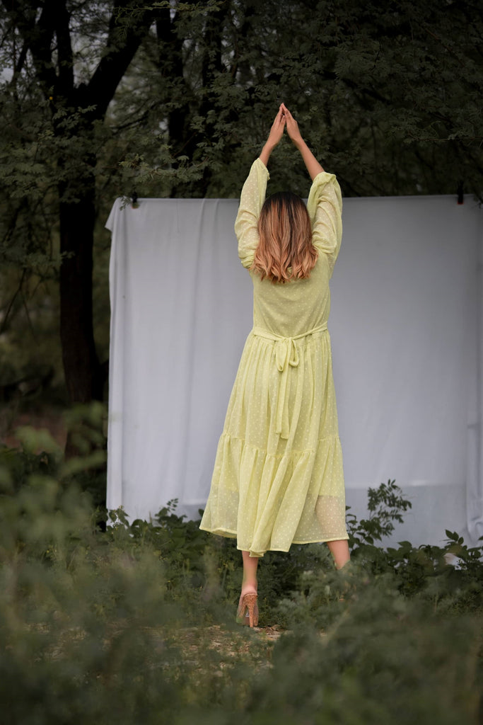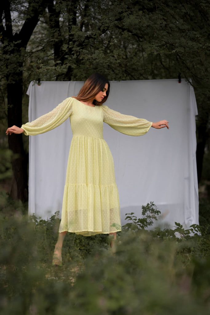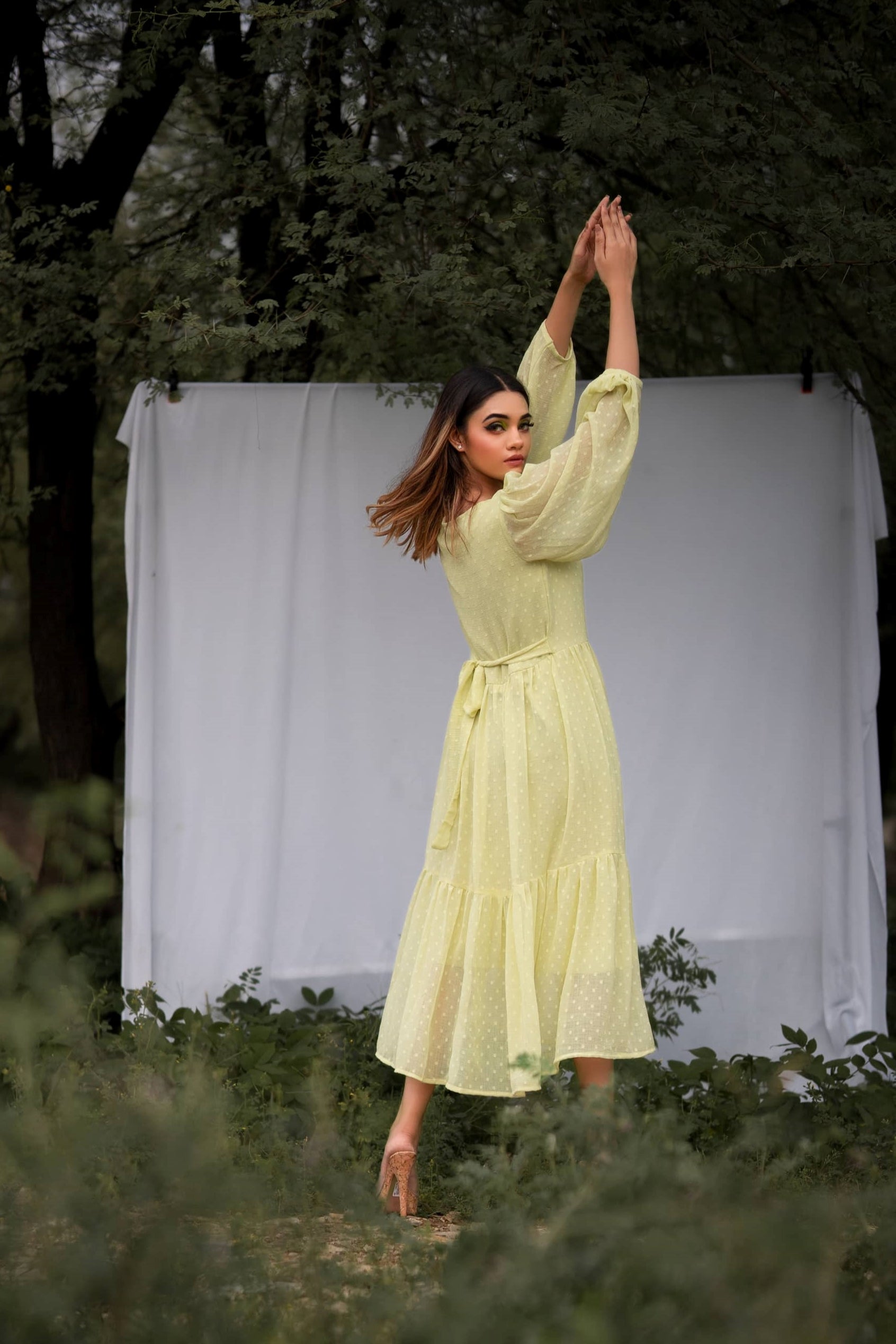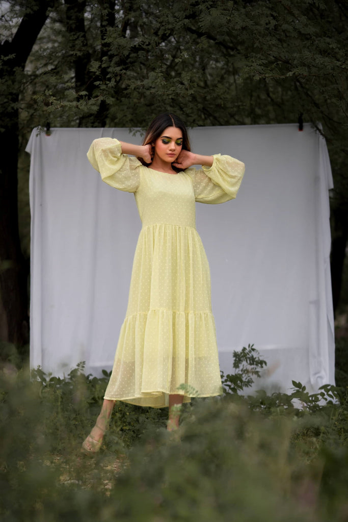 featuring this very beautiful midi princy tier dress handcrafted by MannMani. it has round neck, full sleeves, and 2 tiers.It has a very soft light weight and breathable fabric. Style this outfit with high heels and minimal hairstyle. shop online now from MannMani.