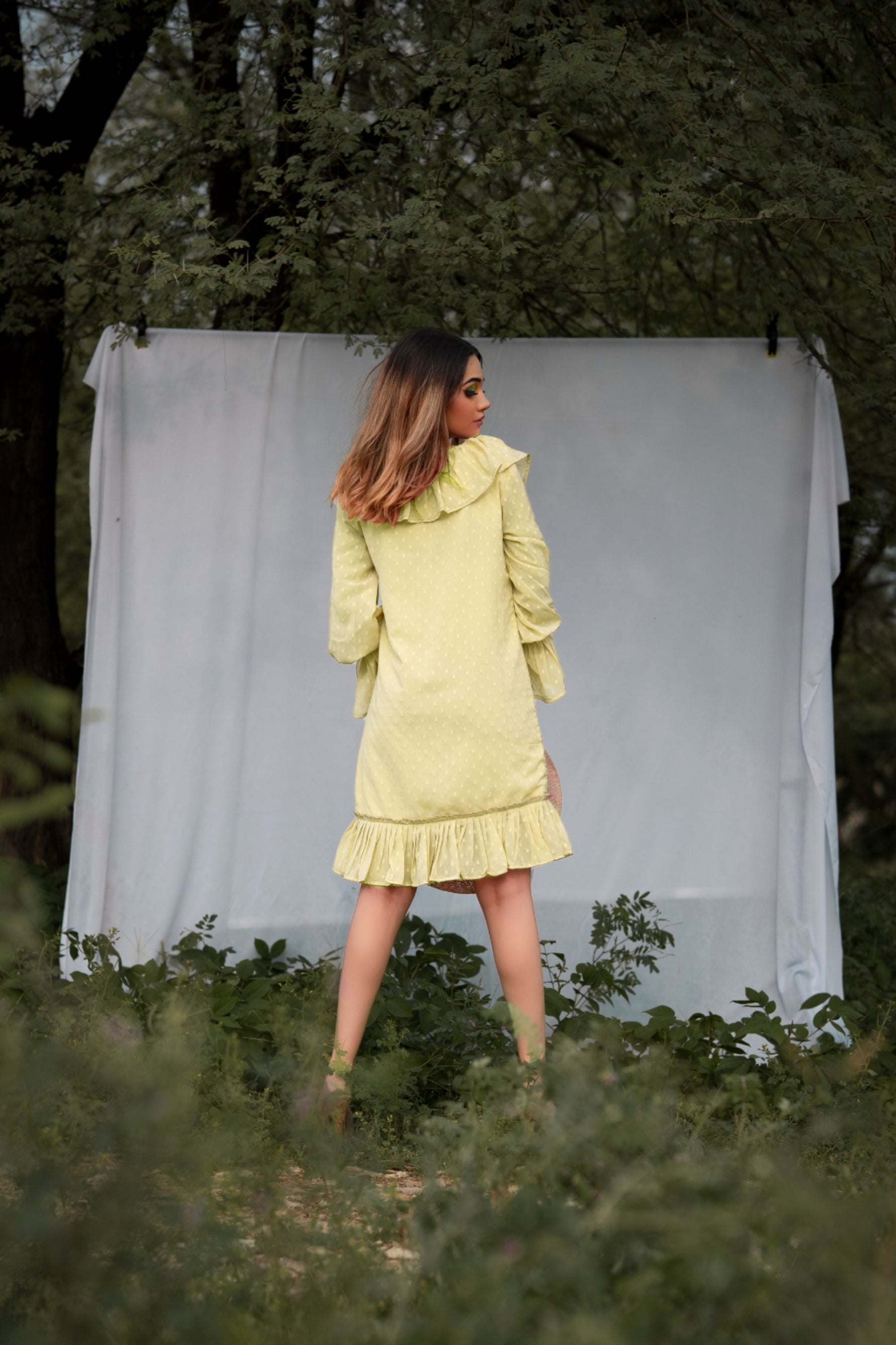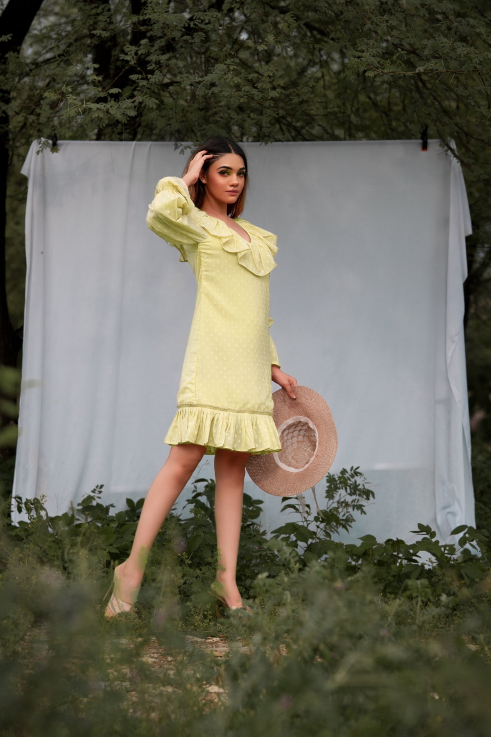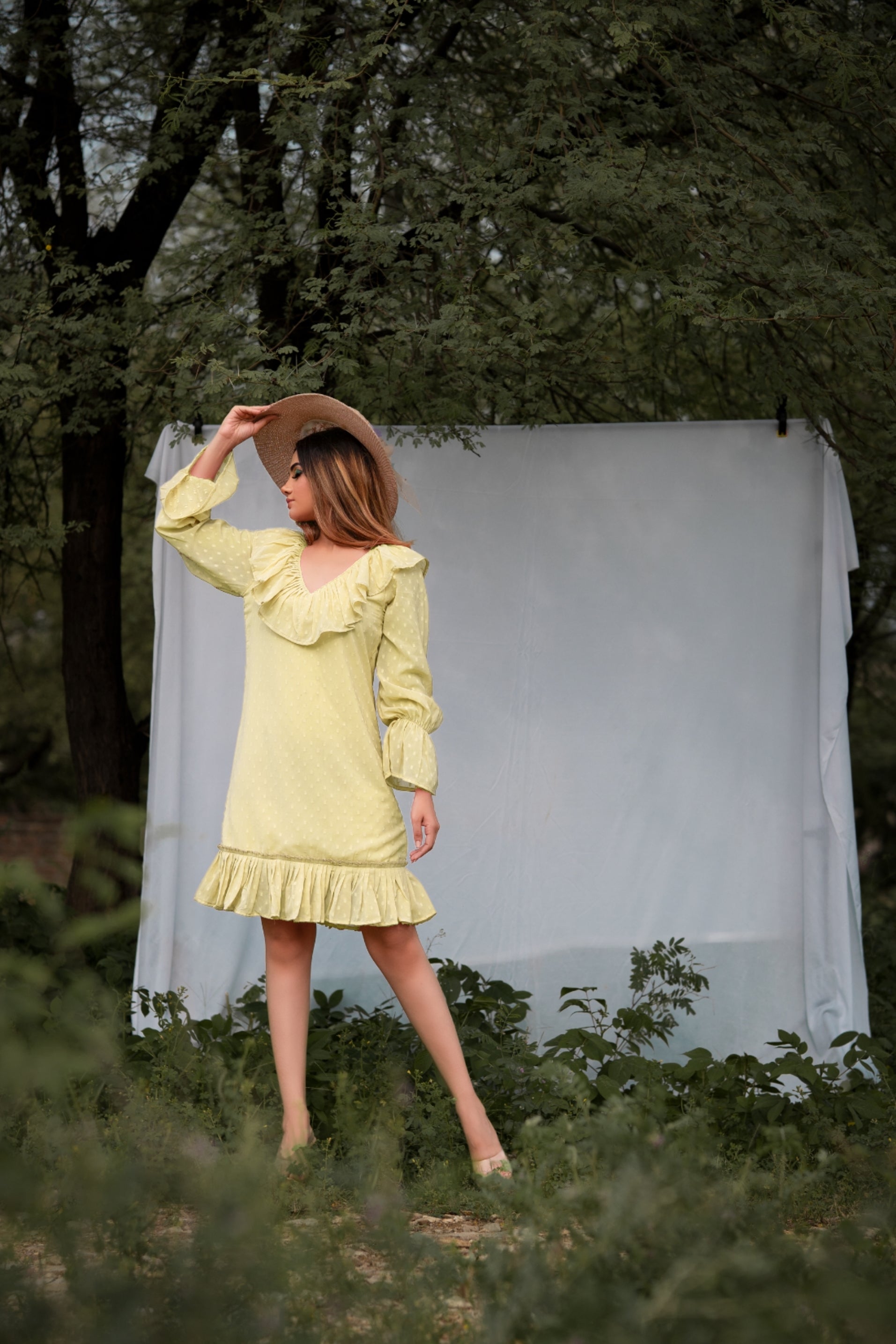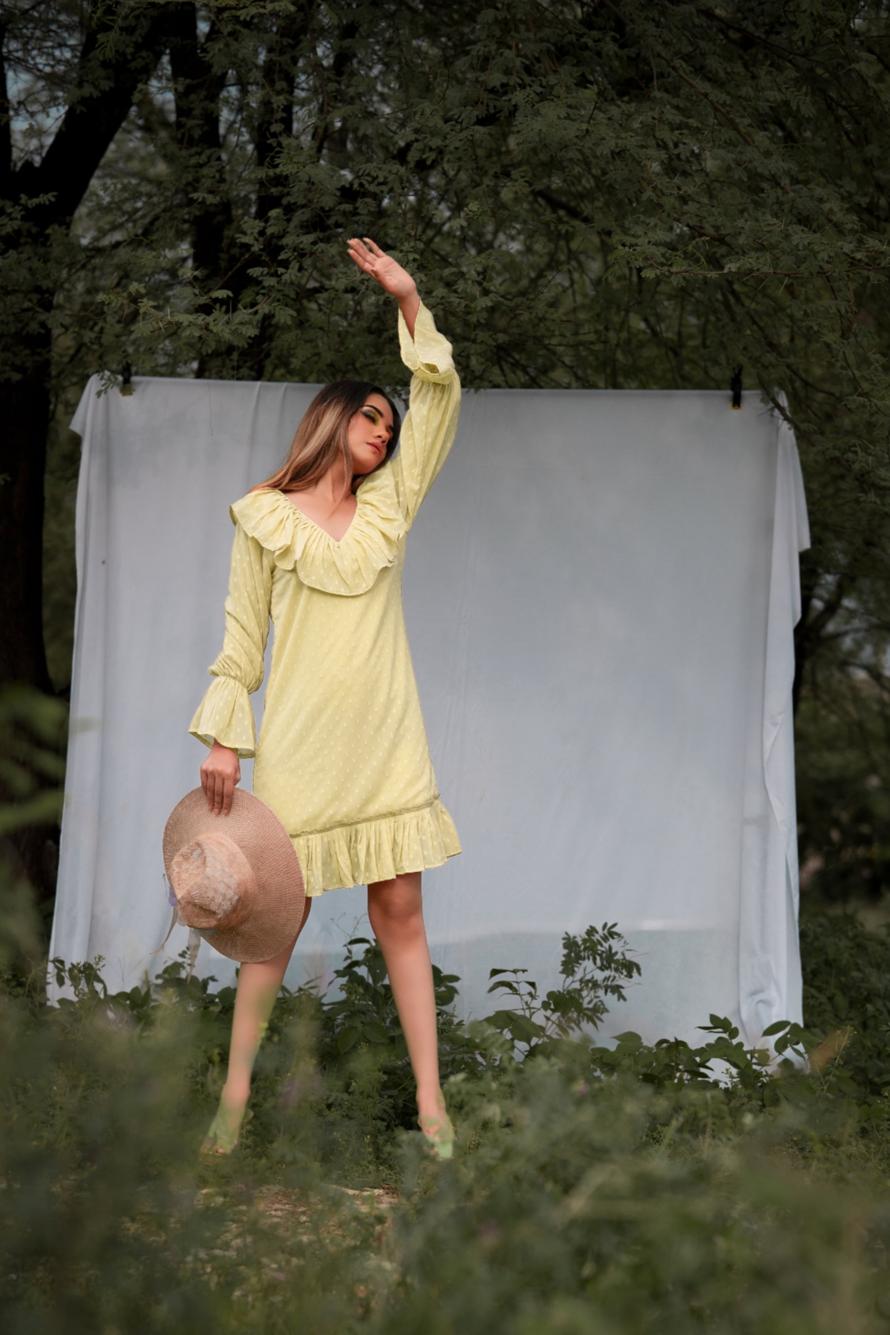 featuring MannMani’s best seller’s variation, lemon yellow ruffle dress, it has very stylish v ruffled neck, full bell sleeves and knife ruffles at bottom.