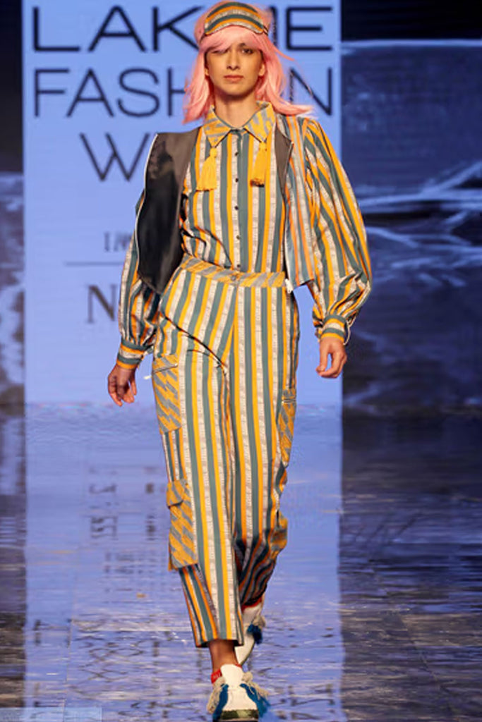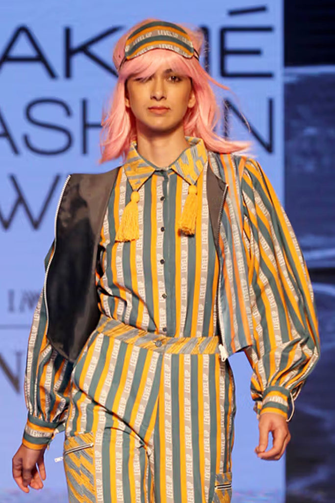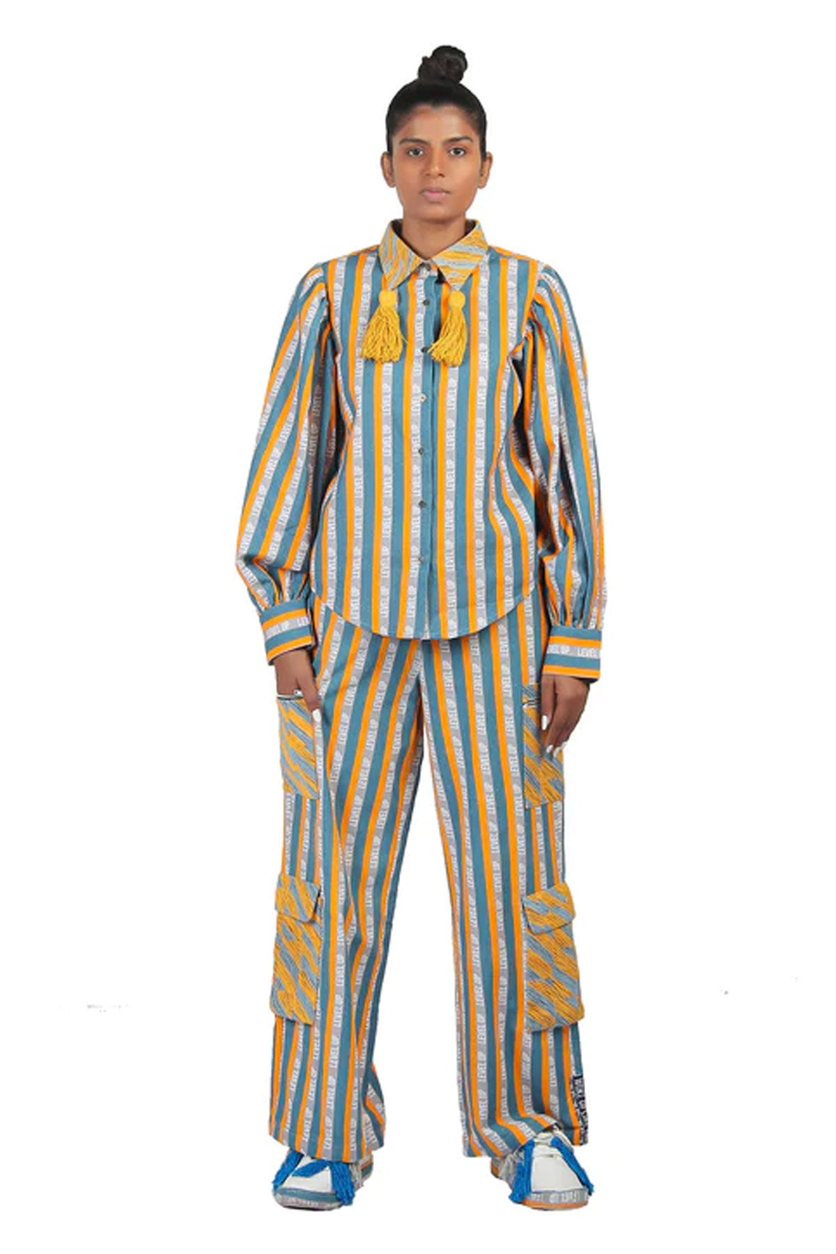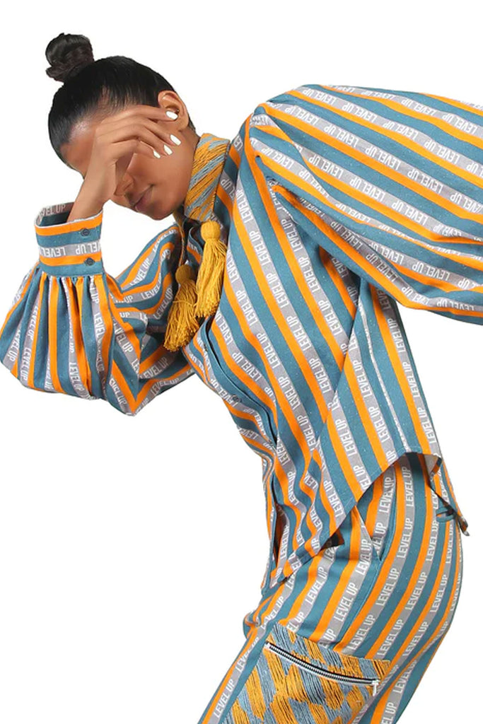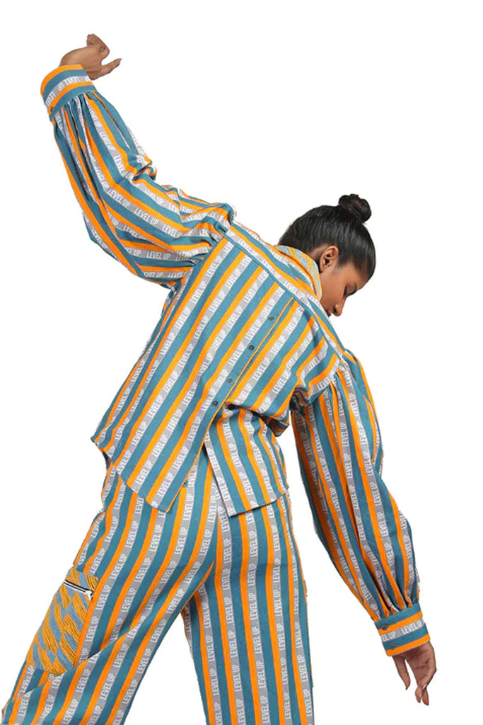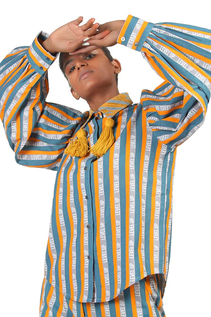Long sleeve cotton shirt. “Level Up” stripe pattern in multicolour throughout. Geometric embroidery in multicolour at spread collar. Orange tassels at collar. Balloon sleeves. Single-button barrel cuffs. Button closure at front and back. Shirttail hem. Signature ALL2DEFY trimming at sleeve.