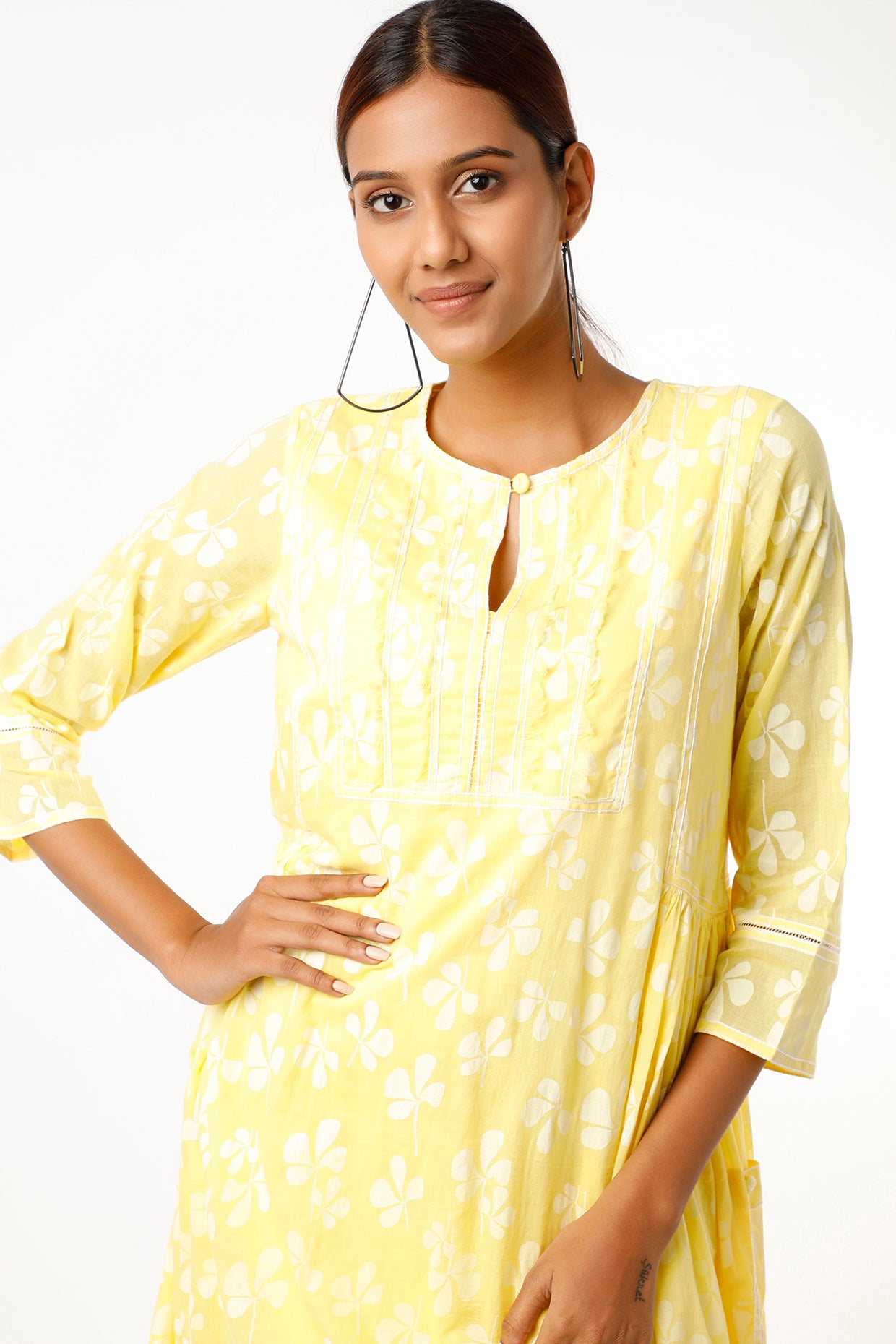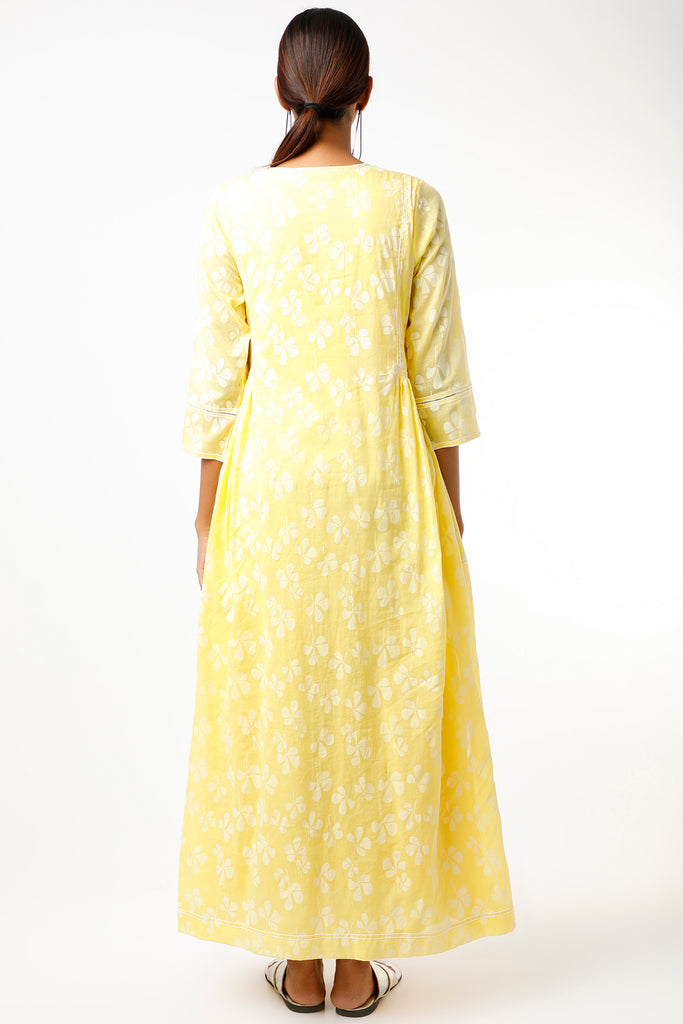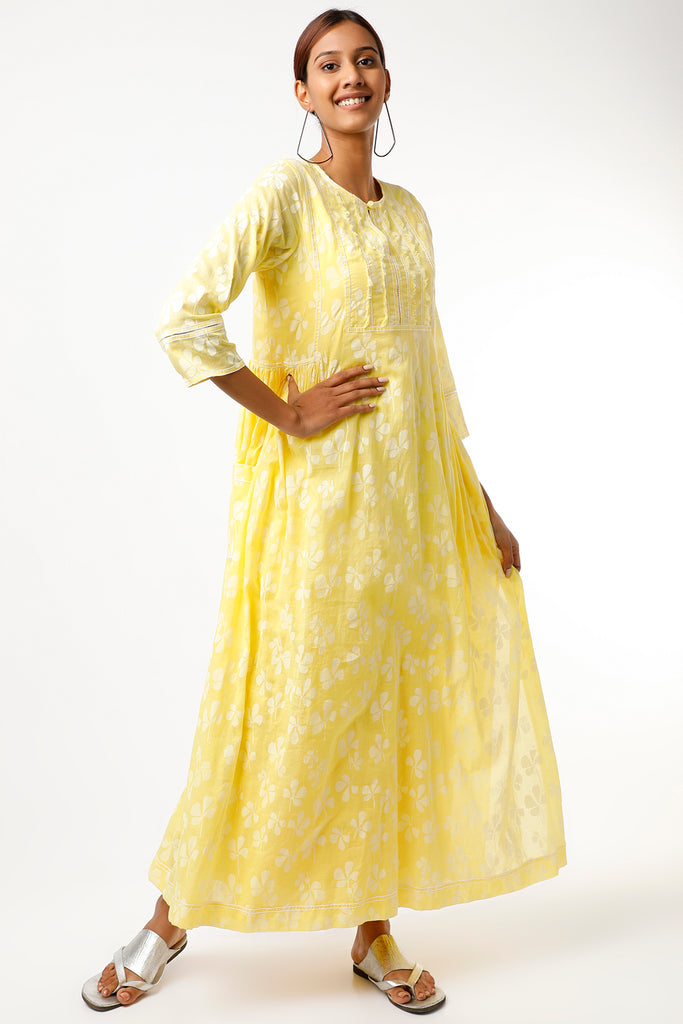 Featuring a light yellow tonal printed dress in cotton base with pockets.