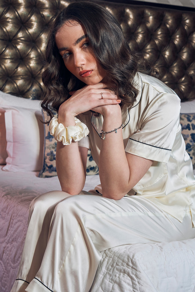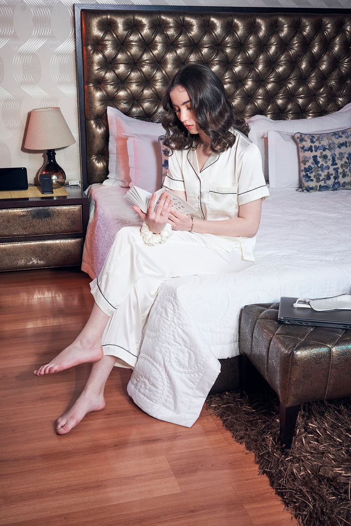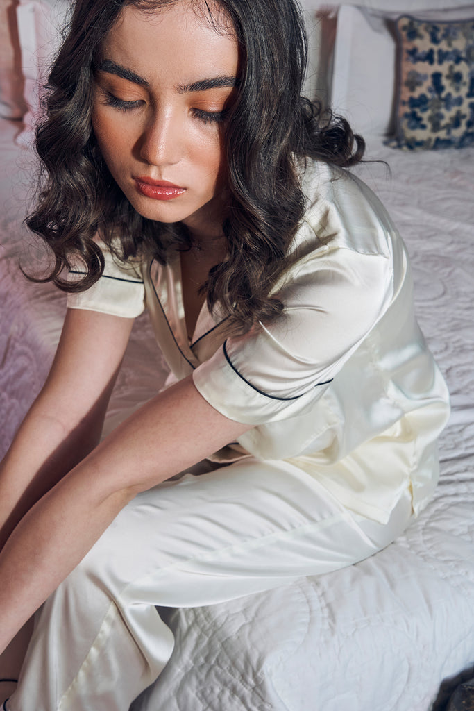 Luxury Loungewear made with breathable lightweight fabrics . Summer white Satins. Lets quirk up our summer wardrobes with Lilies summer satin short set. Each Set consists of a top & lowers.
