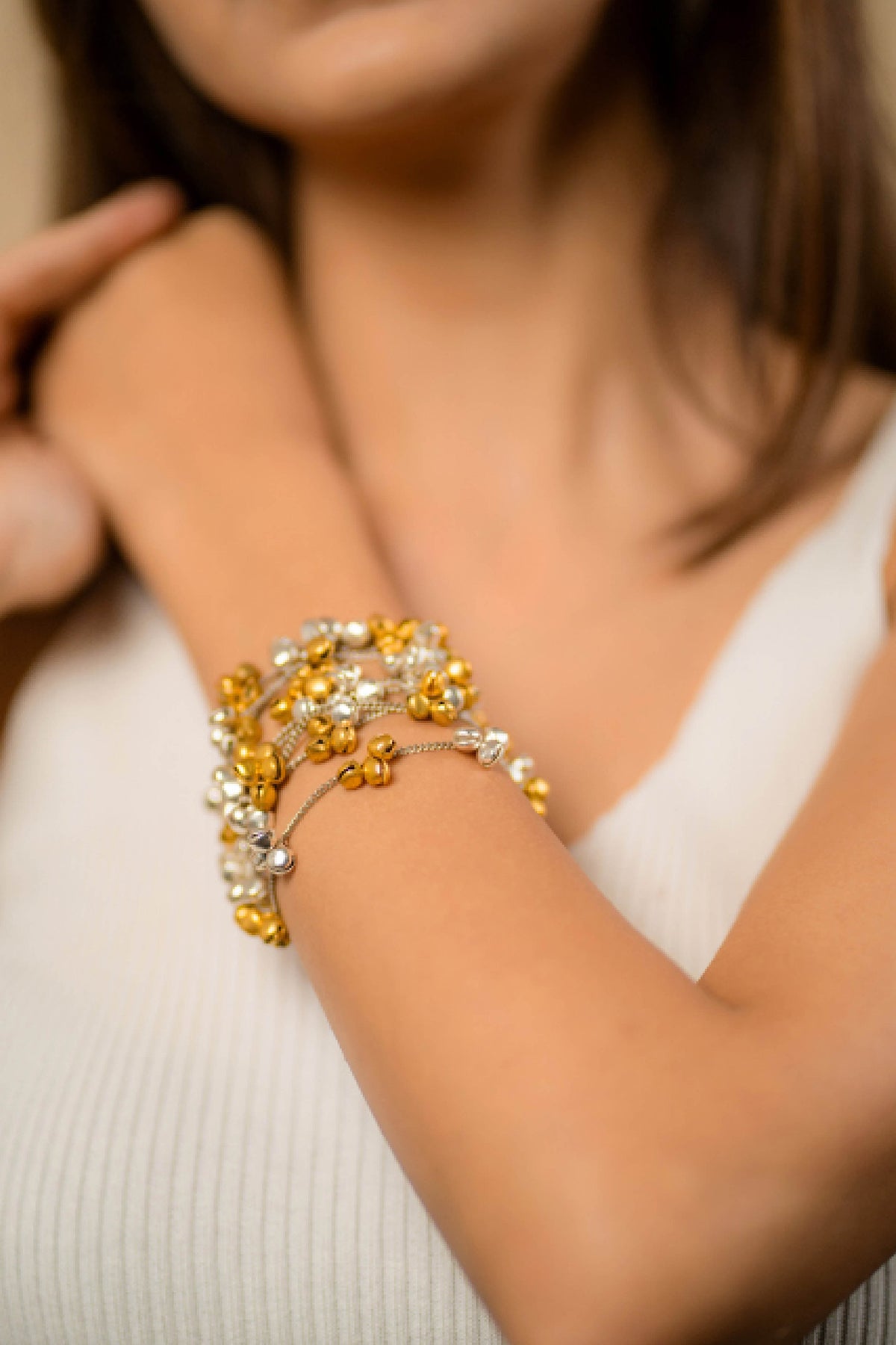 This bracelet is handcrafted to perfection using fine quality brass and ghungroos with light silver and gold plating on it. Traditional look with modern simplicity is what this bracelet has to offer.