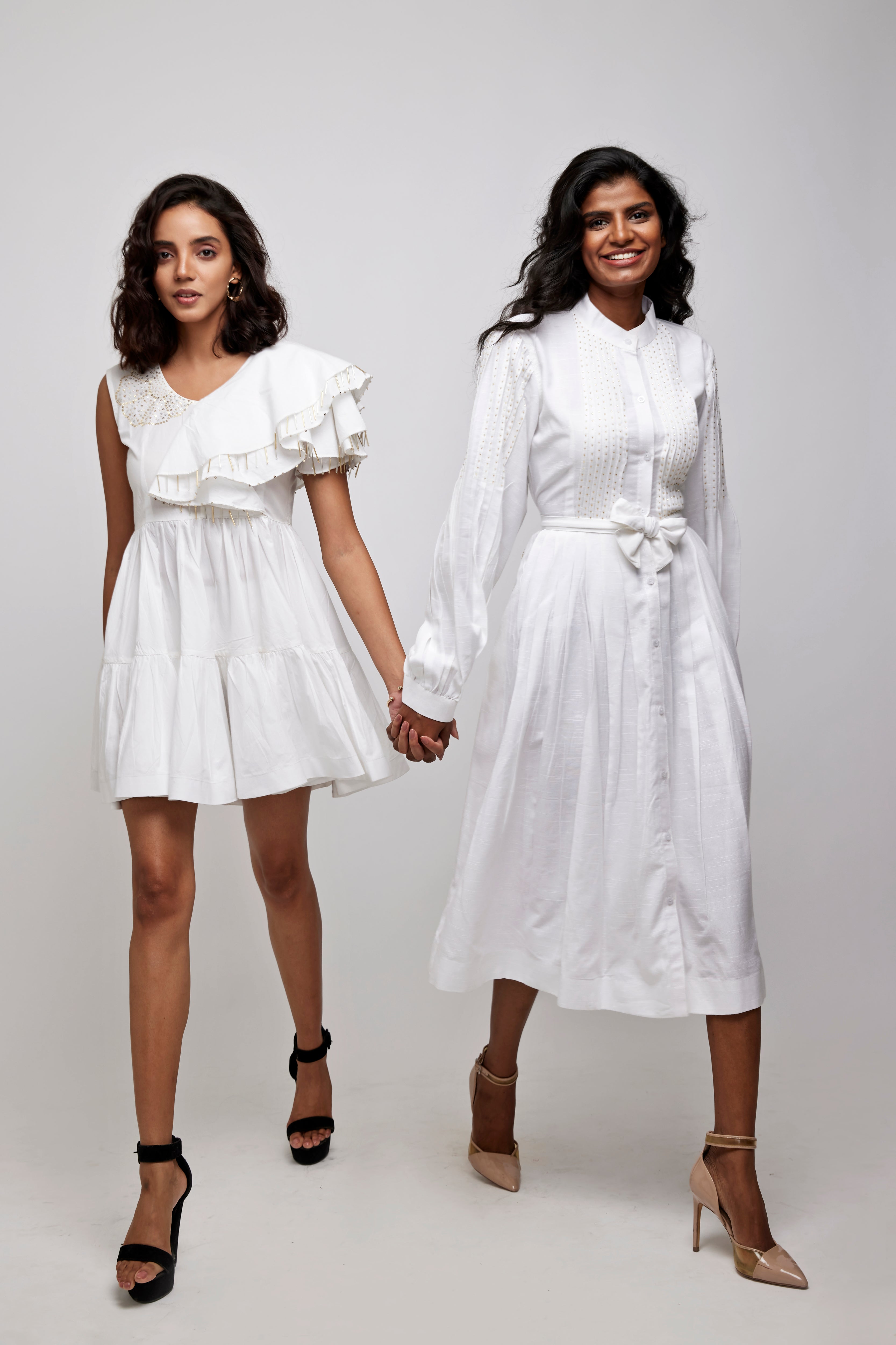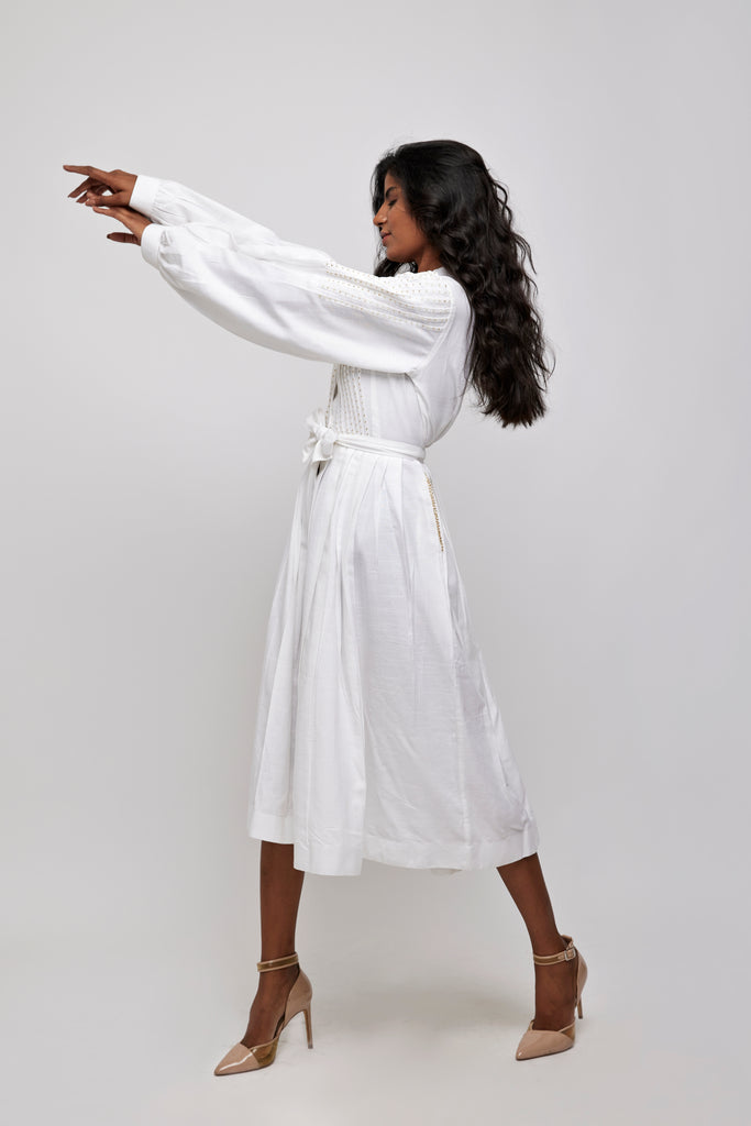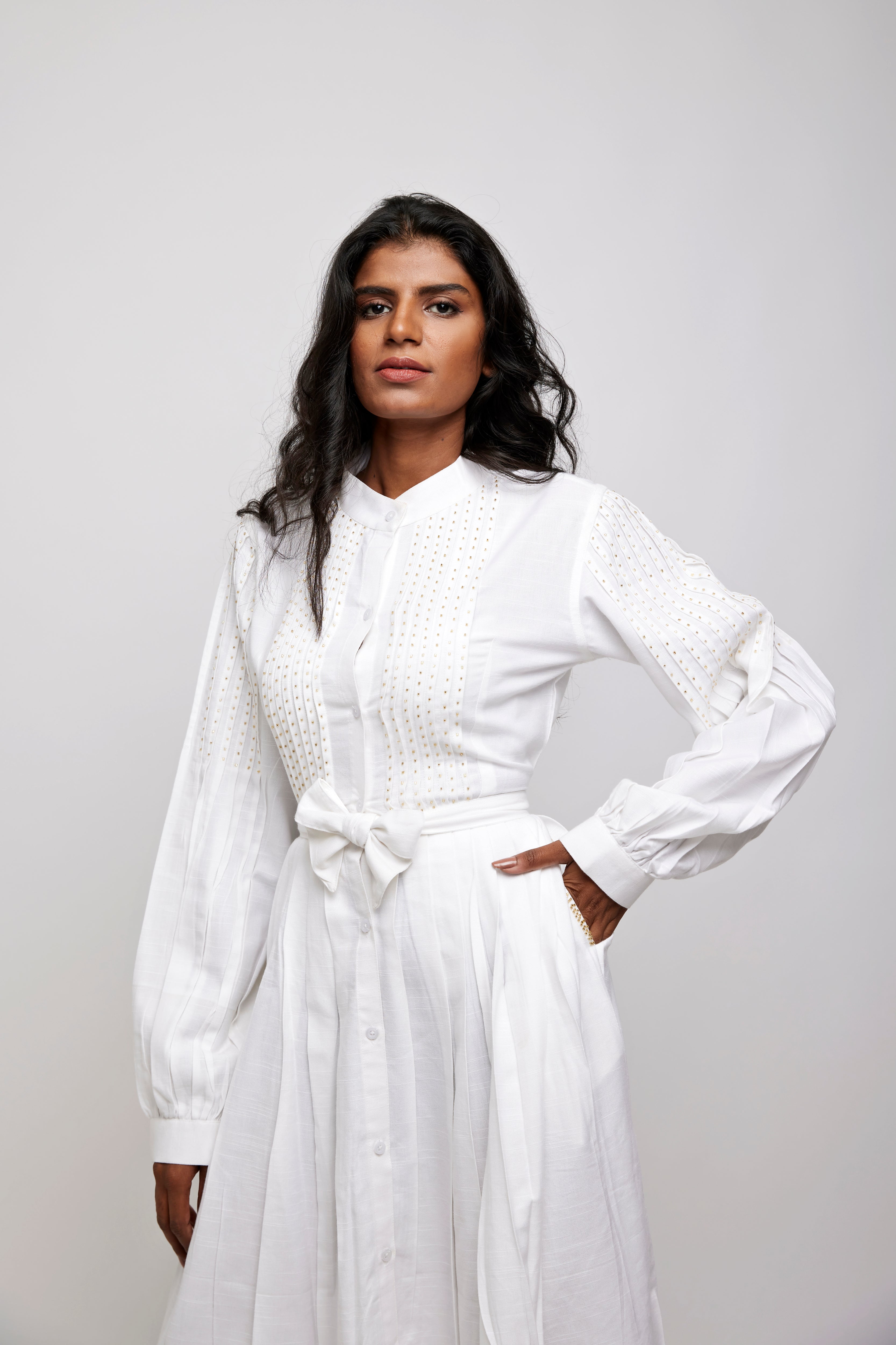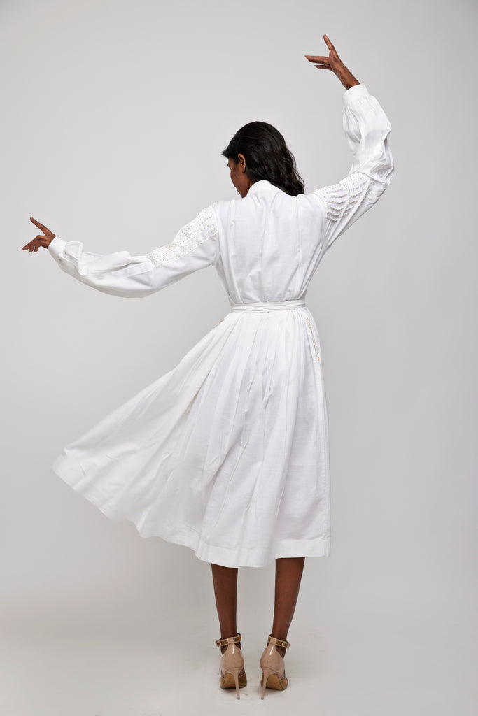 A line knife pleated button down dress. Shirt dress with Mandarin collar and pleated tucks at the front yoke with the golden glass beads embellishments.