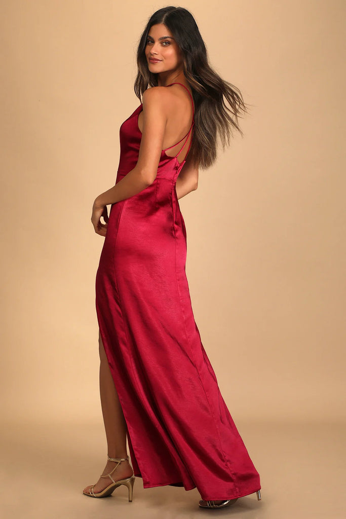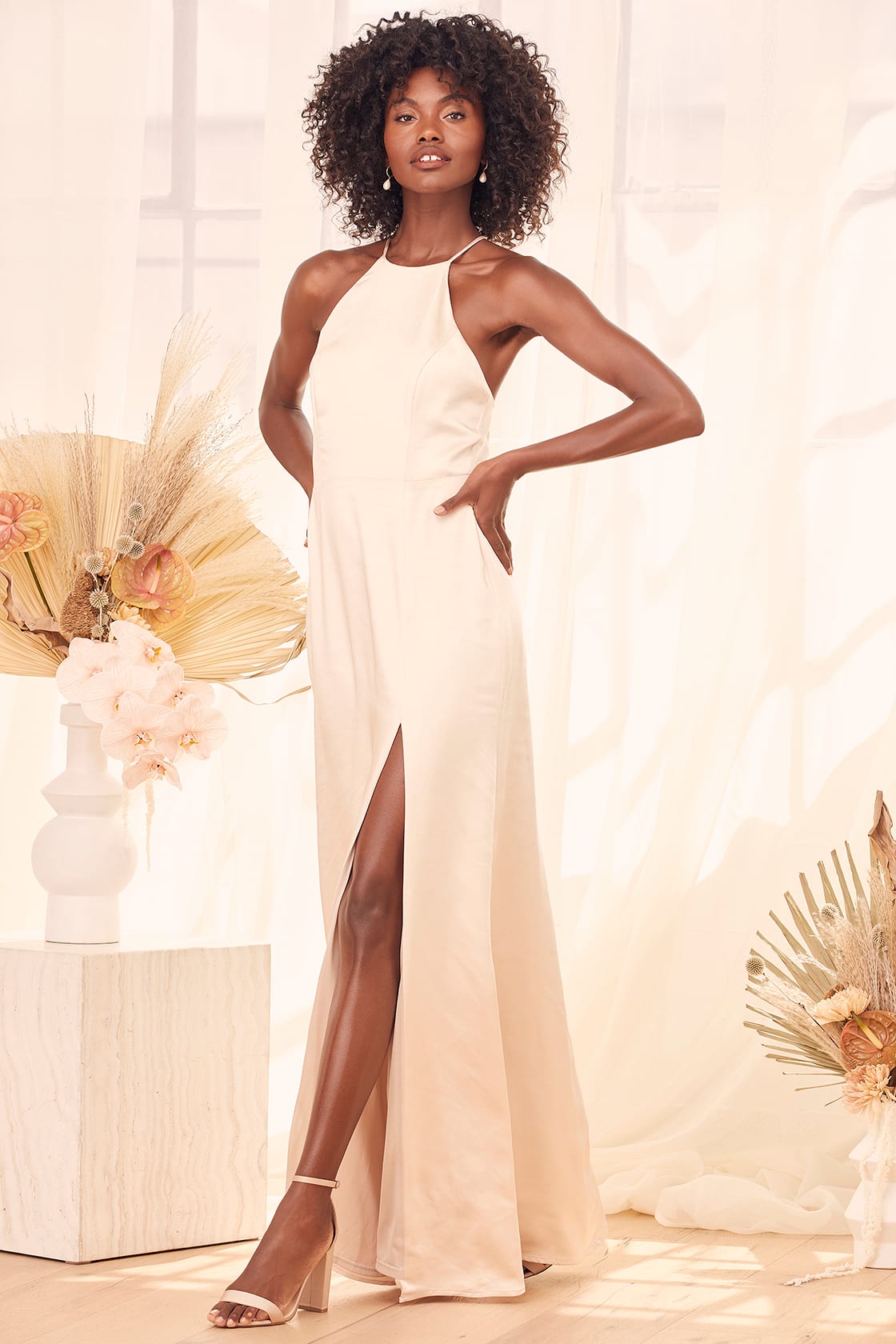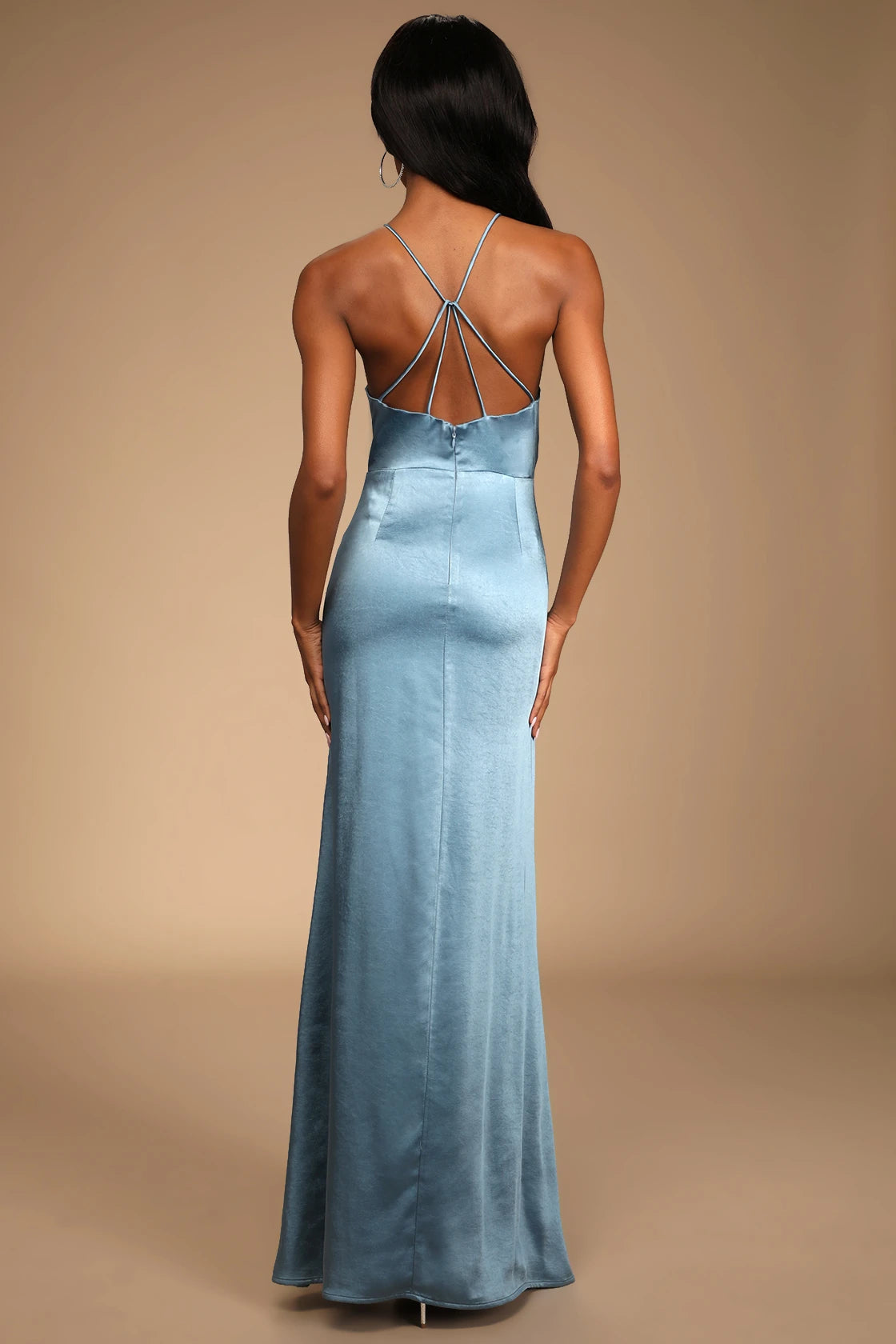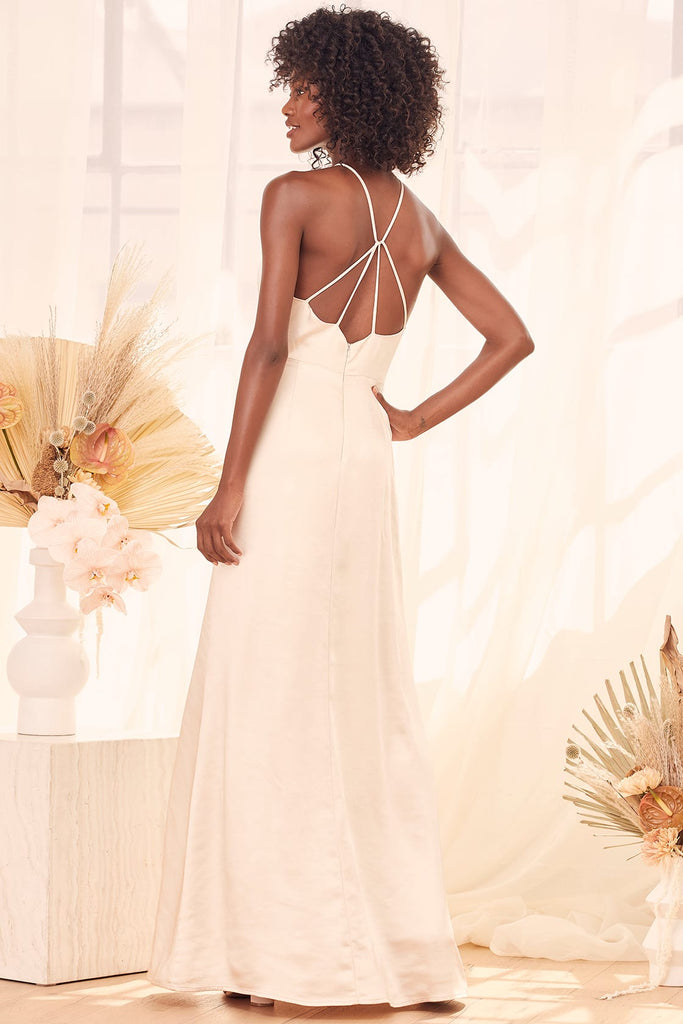 Sleek woven satin shapes this dress that has a princess-seamed bodice and a modified halter neckline that flows into a strappy back.