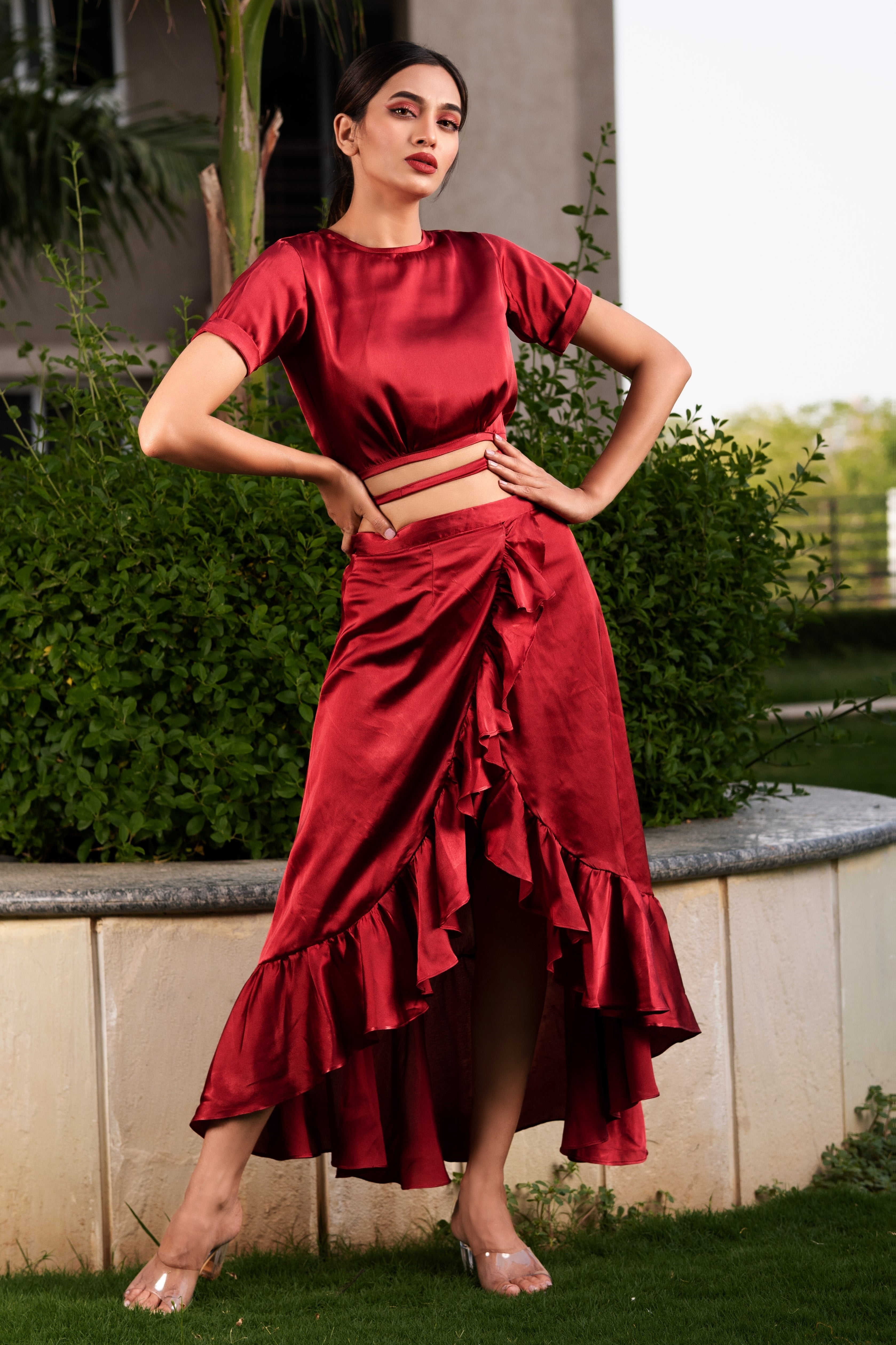Featuring this beautiful maroon co-ord set. The wrap around skirt which has a waistband with traffic jam closure and asymmetric hemline, and therefore the matching back knotted top completing the design .