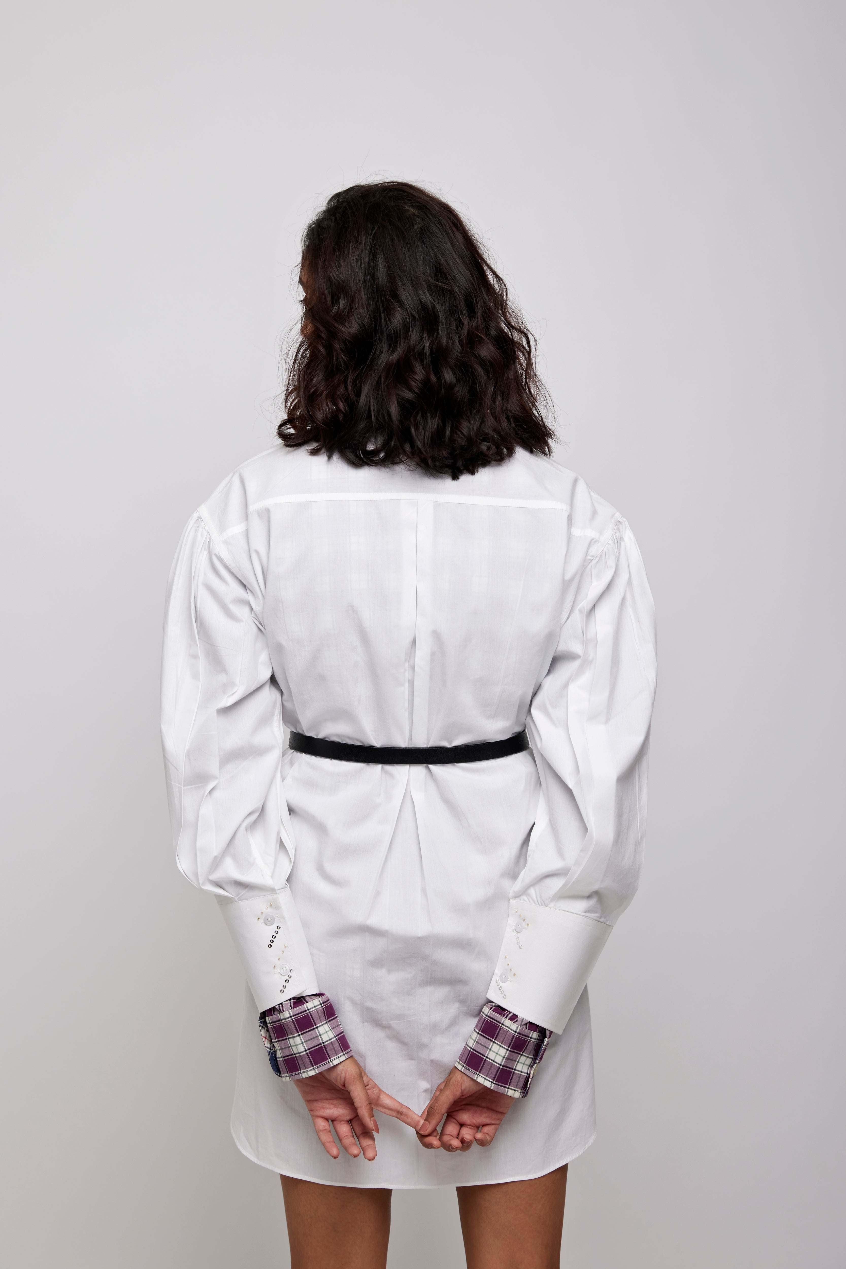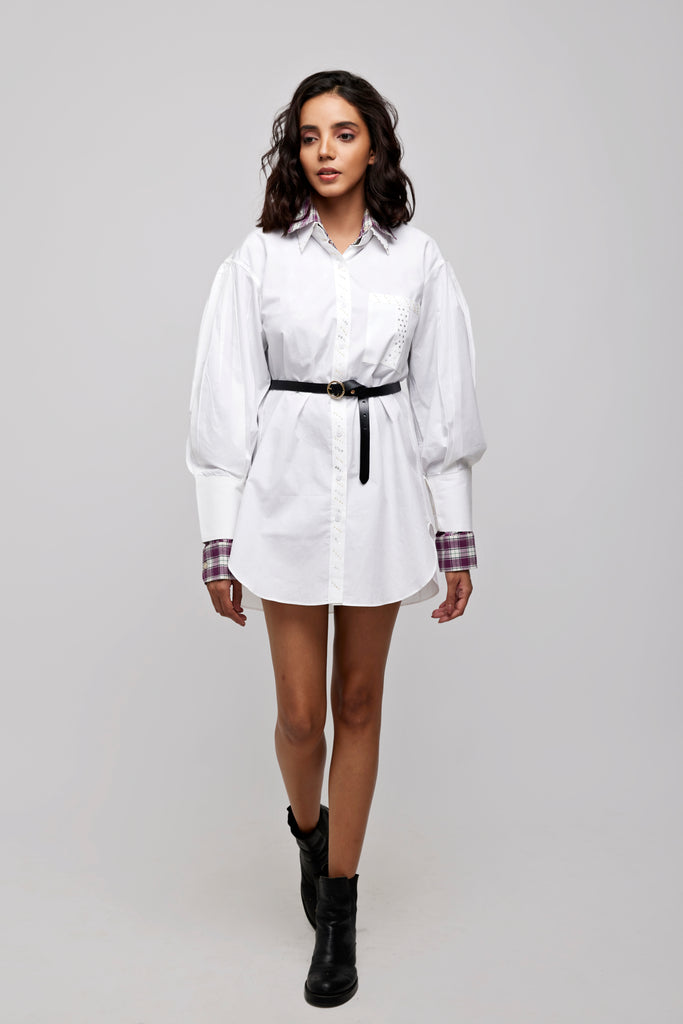 Basic White long shirt with semi spread collar, box pleat patch pocket, shirt tail hem.