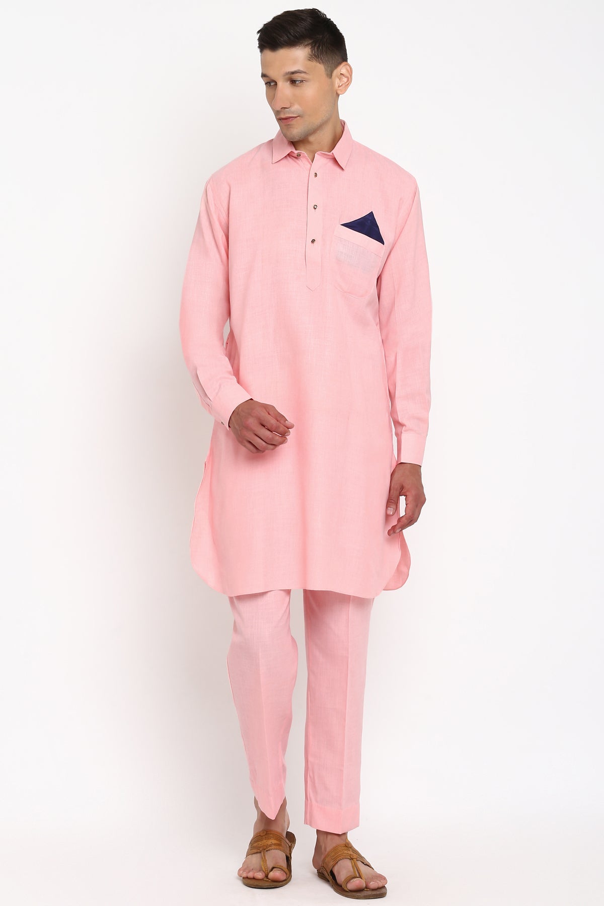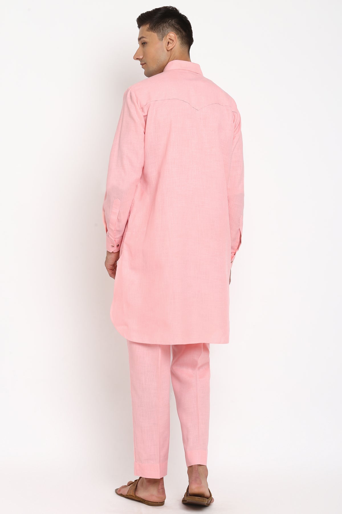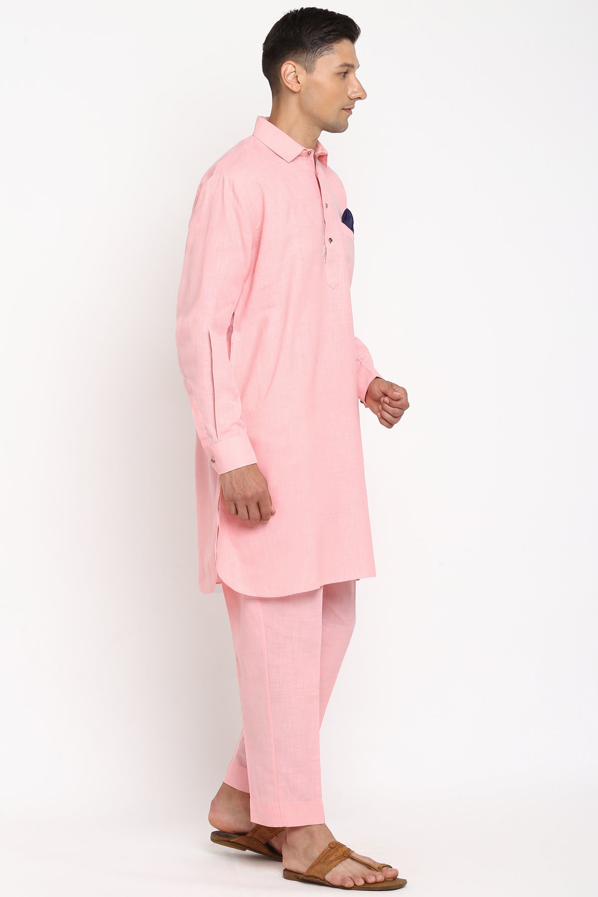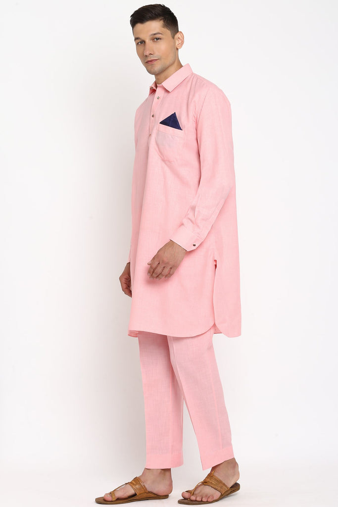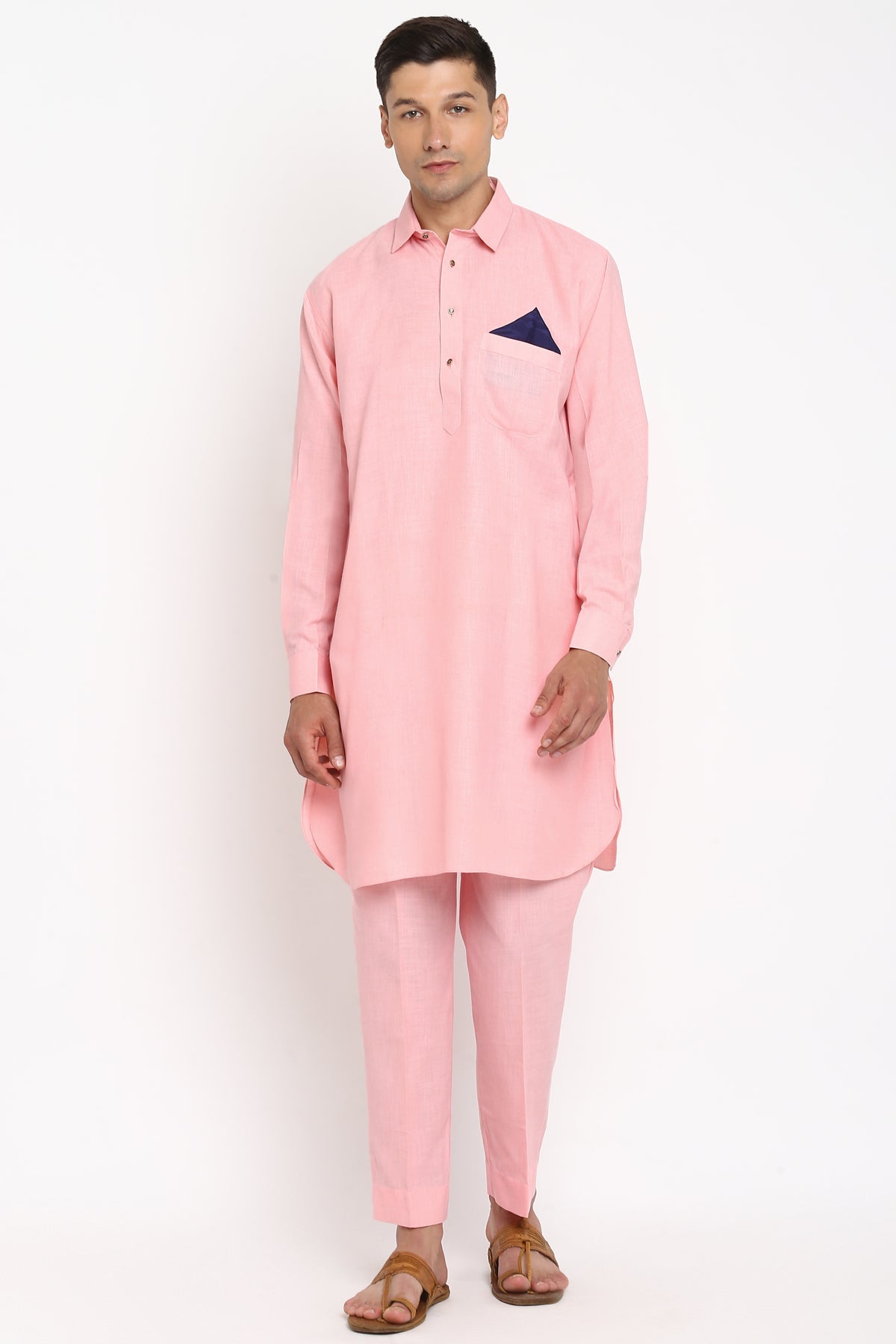 Stylish long sleeve kurta set made in cotton linen. This set is perfect for the festive season, crafted for sheer comfort and class. The bottoms are made of 100% cotton.