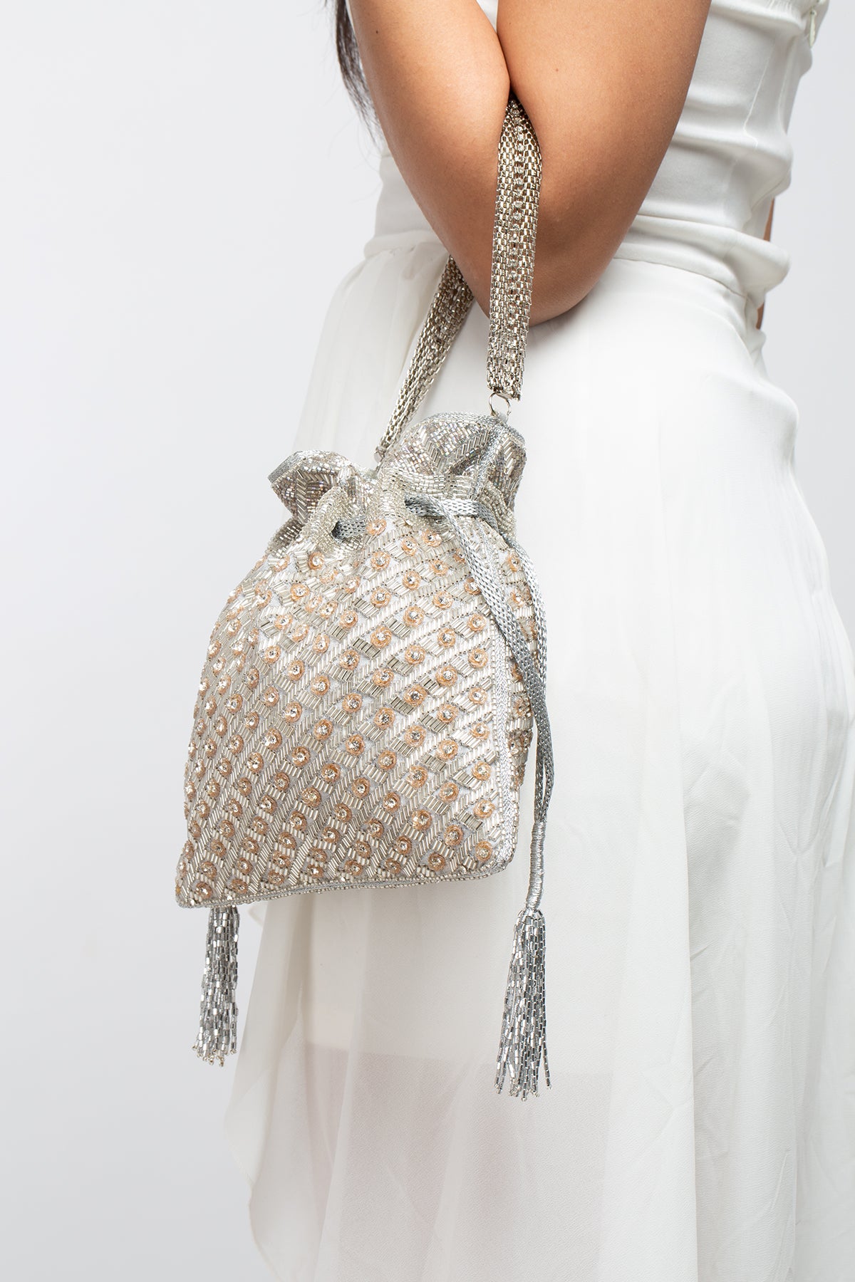 Inspired by a mesh pattern, this potli has salli embroidered to match the inspiration.