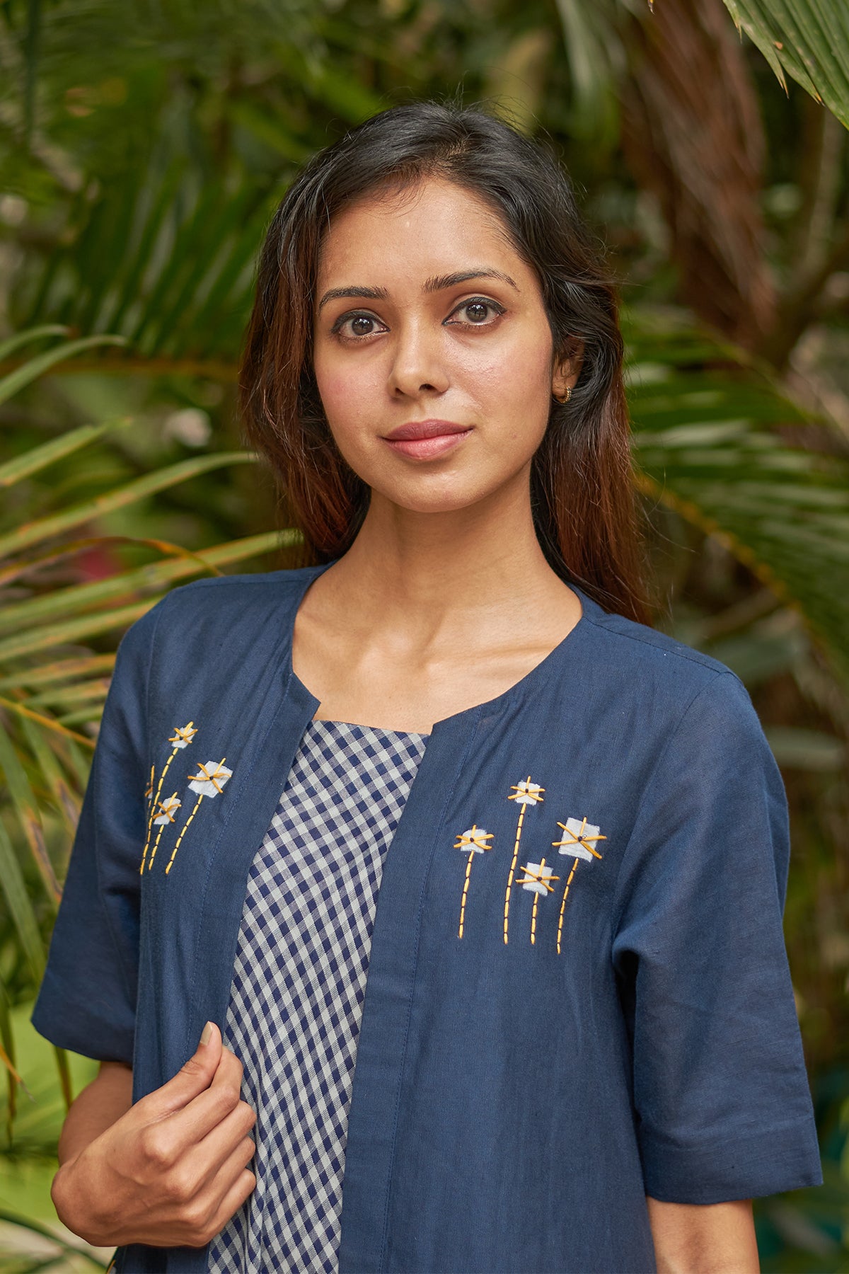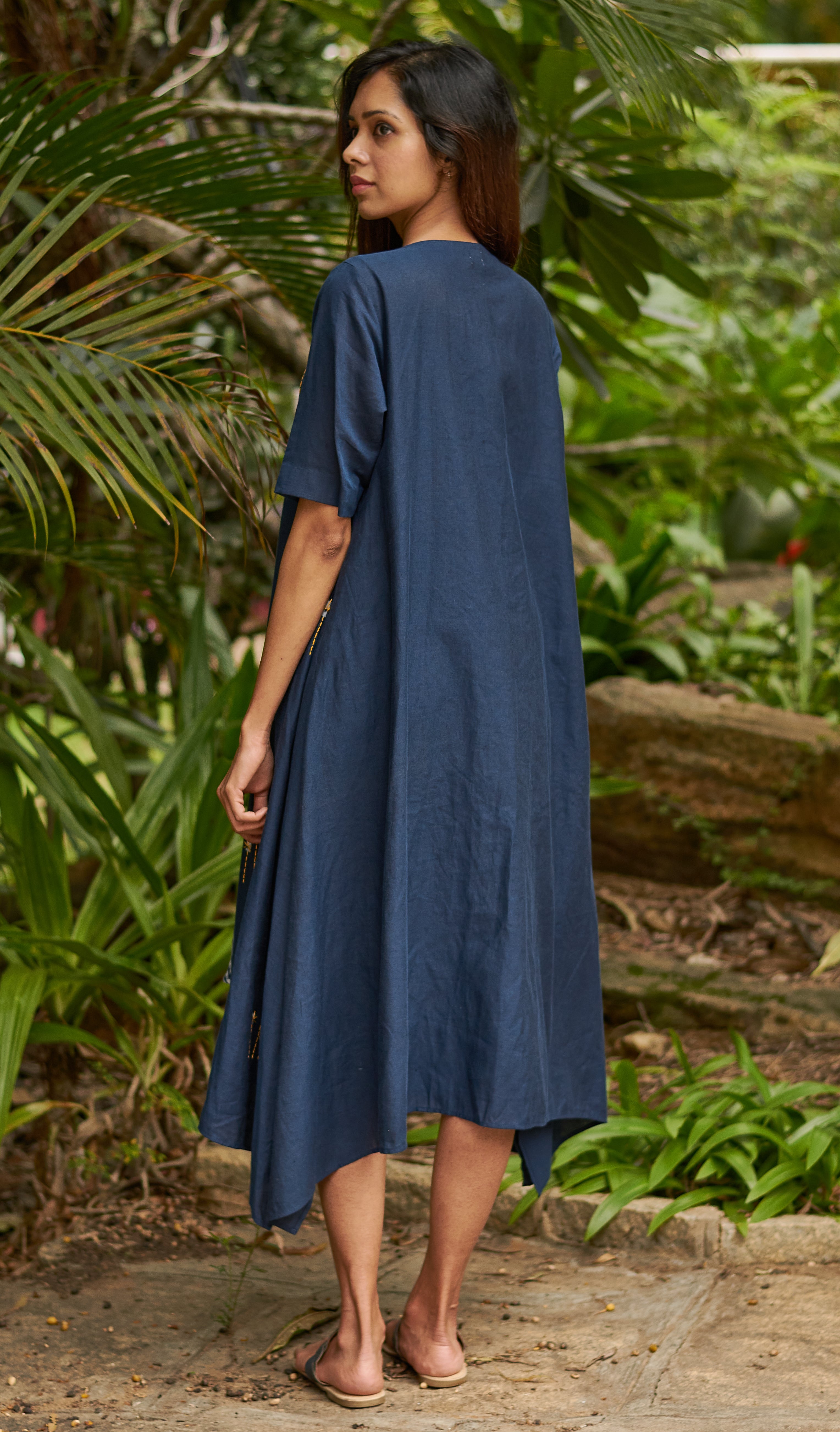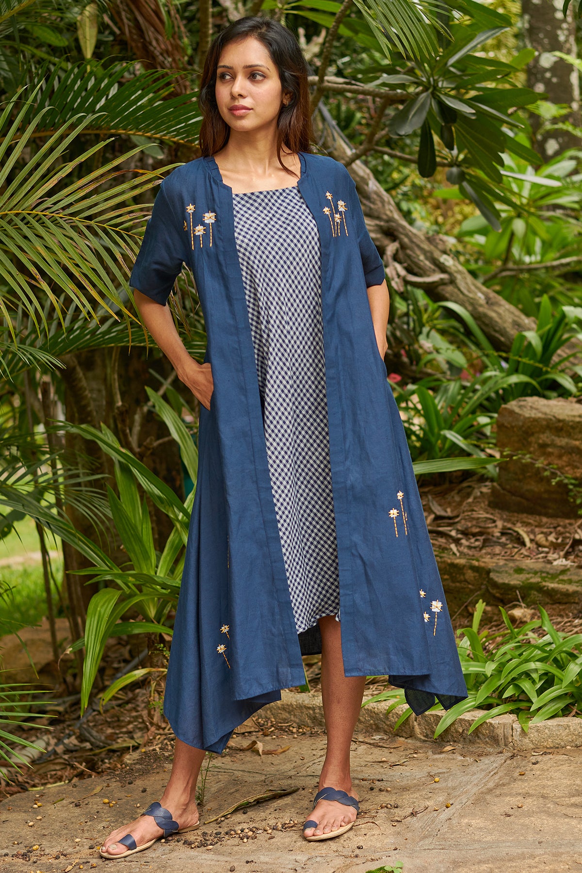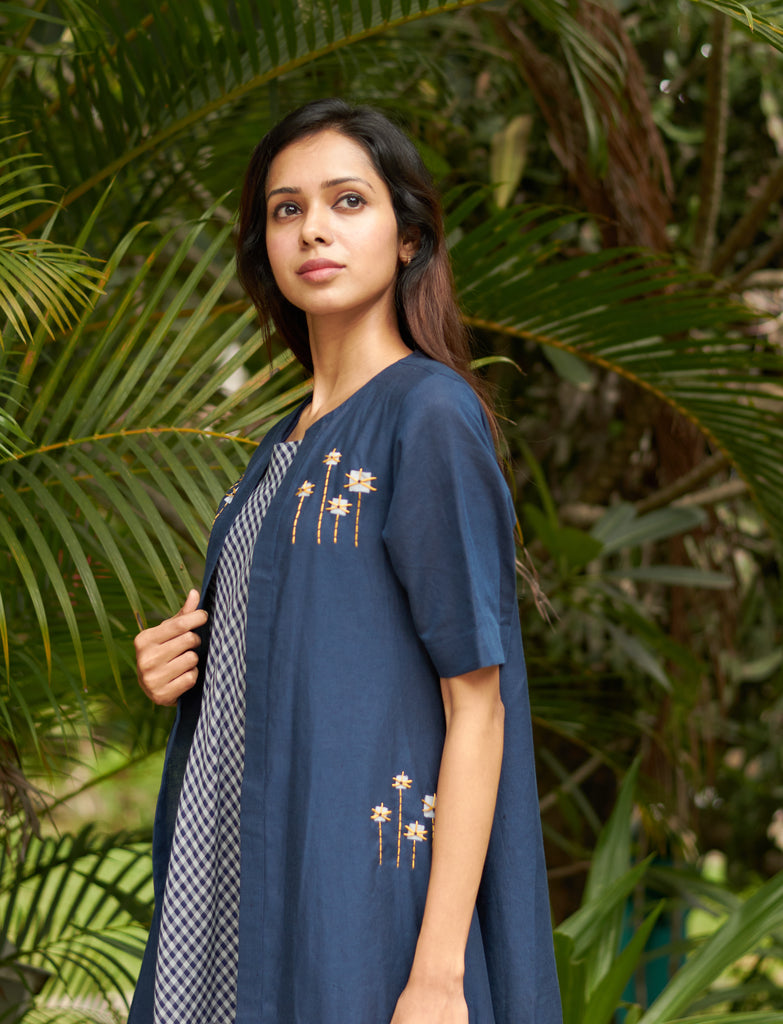 Its a long asymmetrical overlay with block print and hand embroidery detailing.