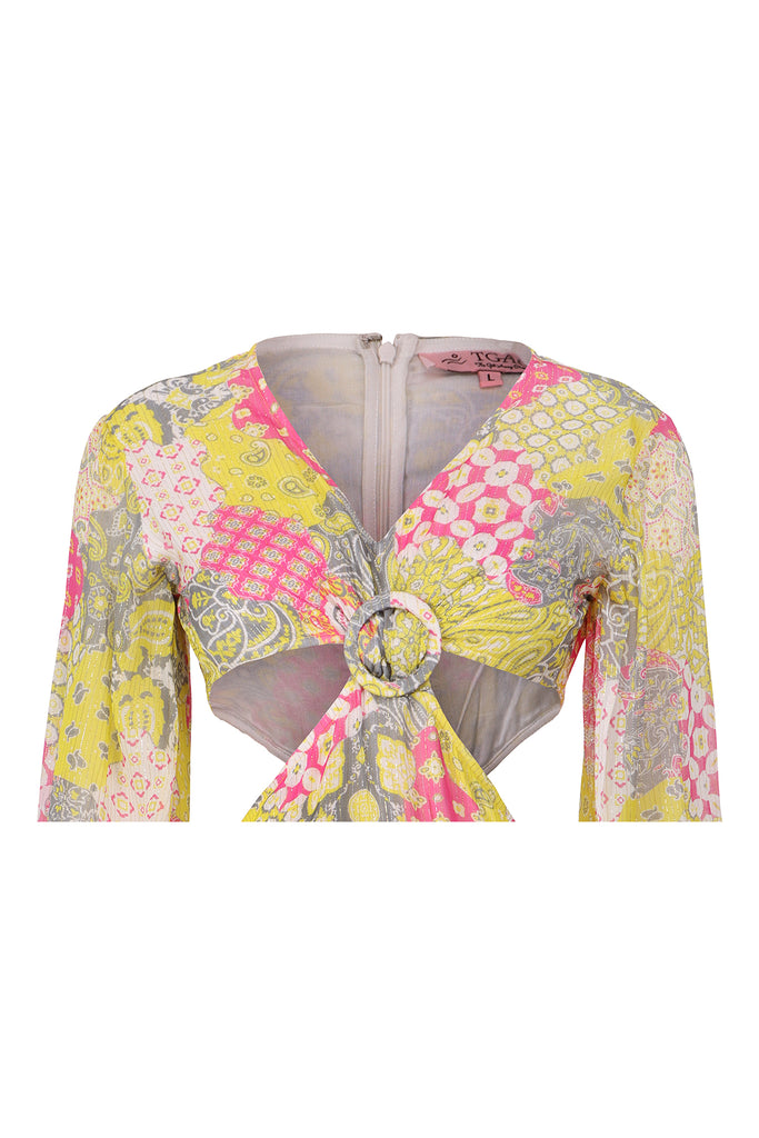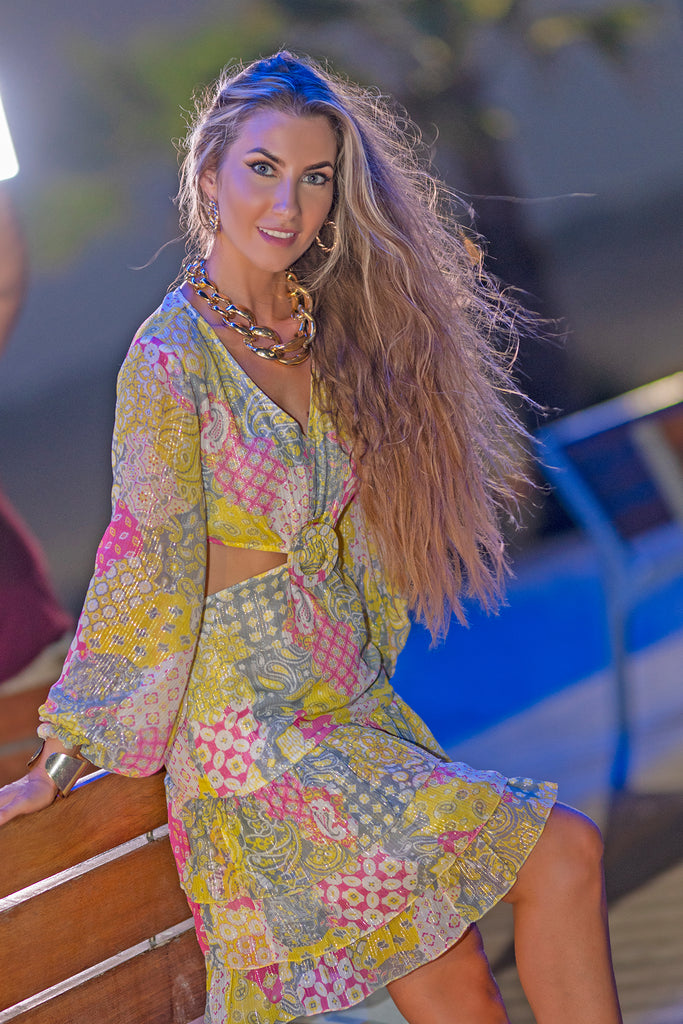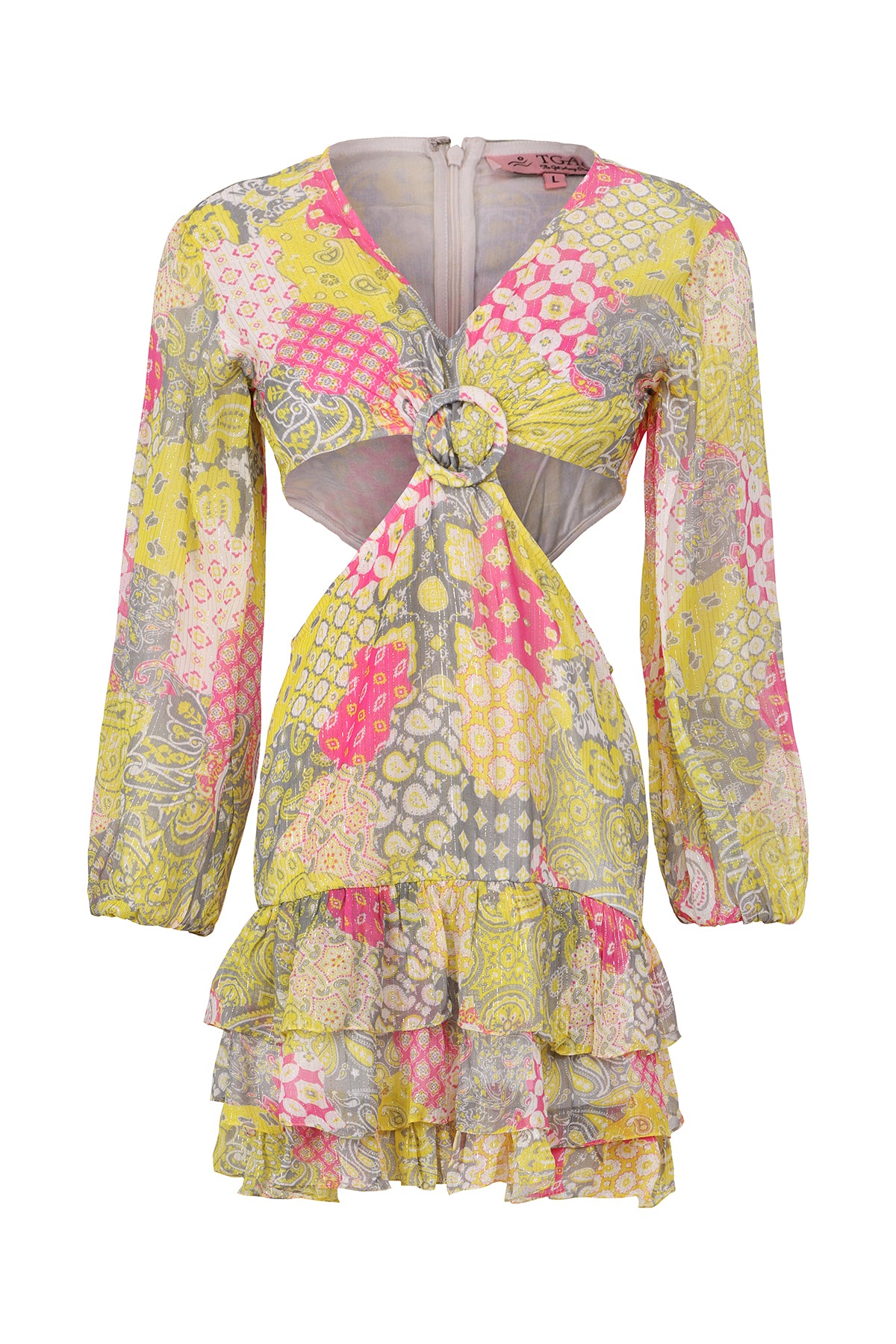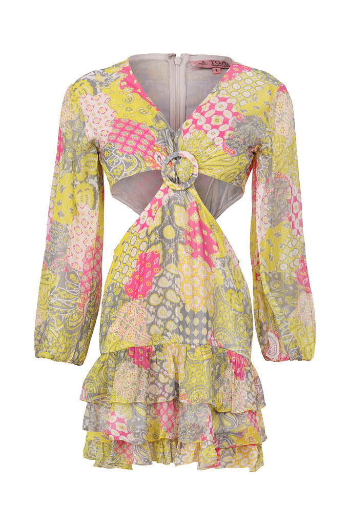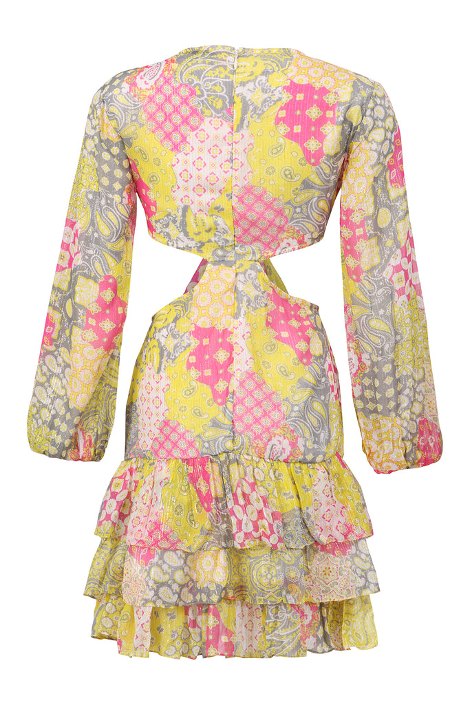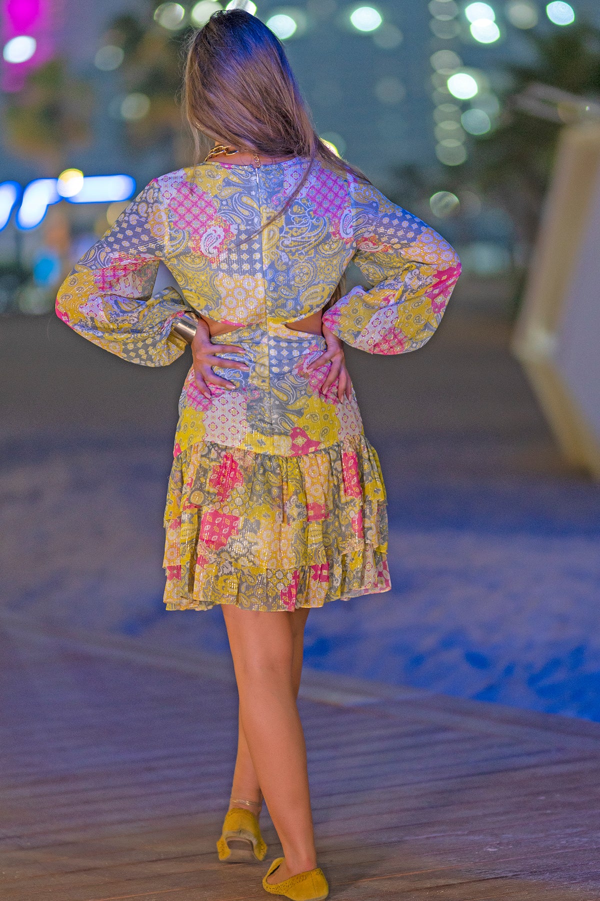 This never sacrificing O-Ring Bandana dress designed in viscose georgette exudes classic elegance. The intricate silver gold lurex embellished mermaid-like silhouette features a refined balloon sleeve and sensual cut-out waist. Complete with a v-neck and back fastened with zipping, this viscose georgette piece is an essence of darling and classiness.