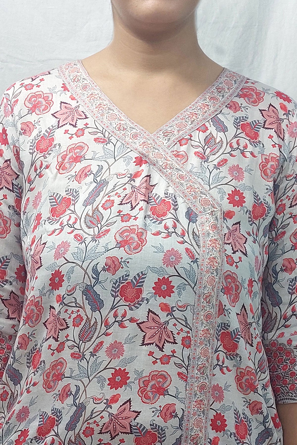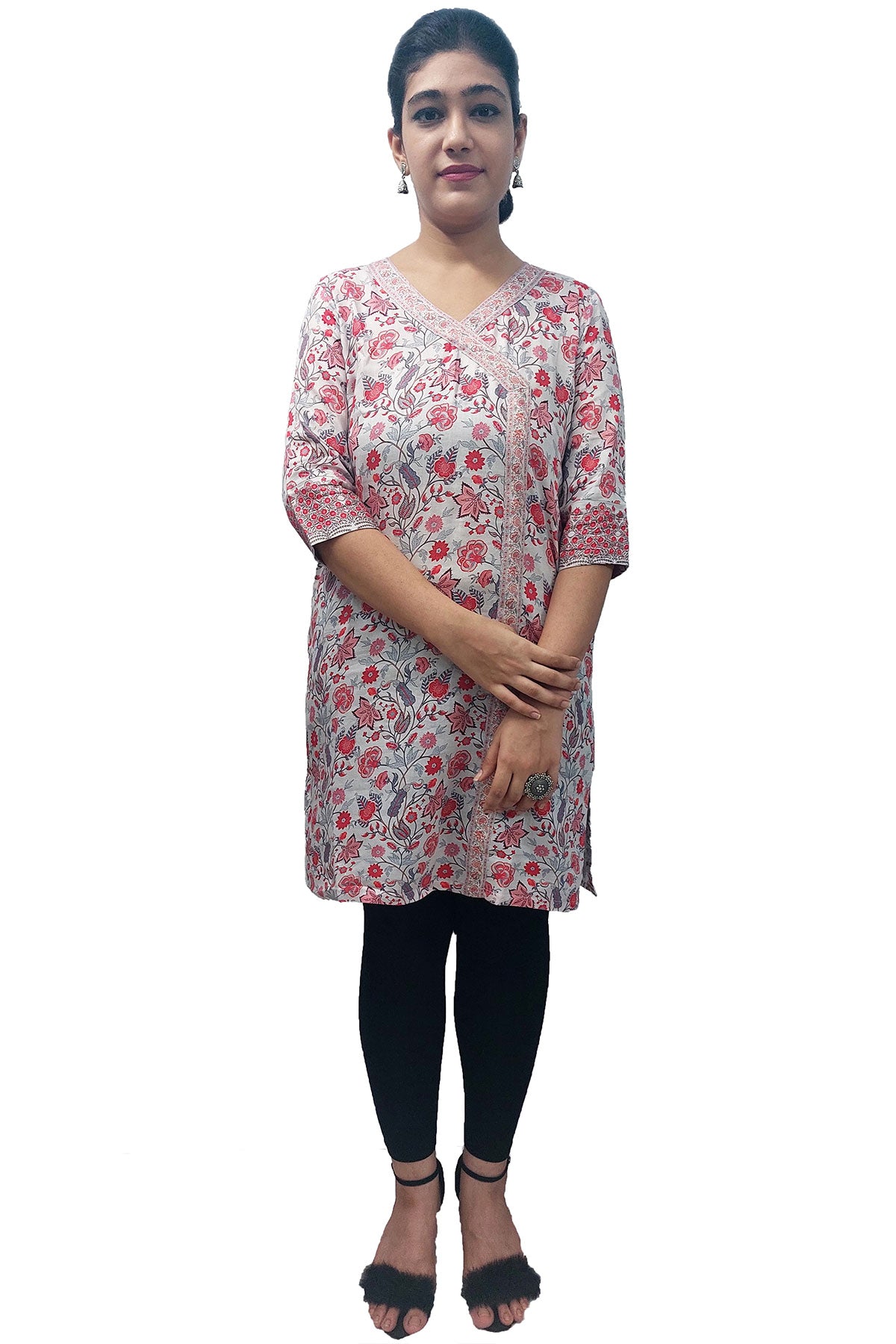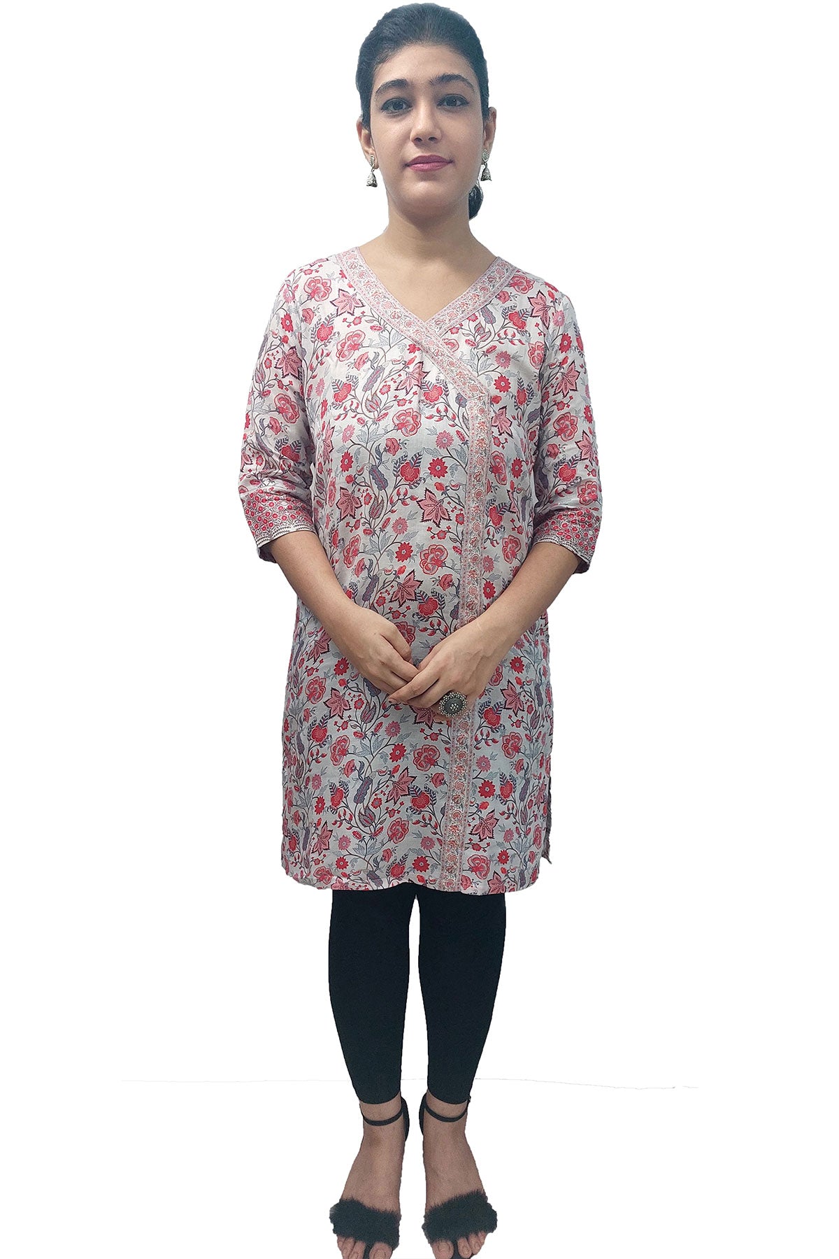 A 3/4th sleeves wrap style printed cotton satin kurti.