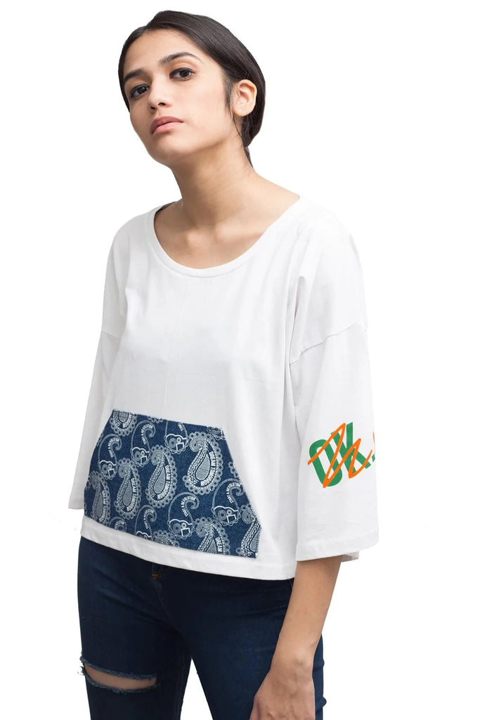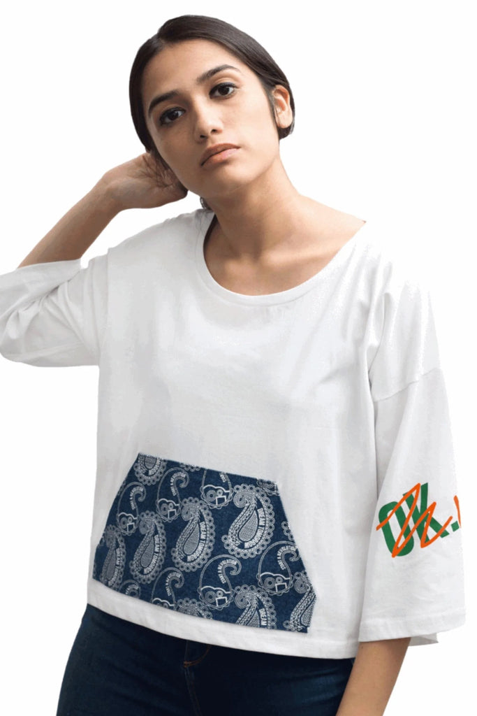 Short sleeve oversized cotton t-shirt in white. Rib-knit crewneck collar. Signature ALL2DEFY paisley print denim Kangaroo pocket at waist. “Ok. nope” graphic at the sleeve in orange and green. Cropped hem. Tonal Stitching.