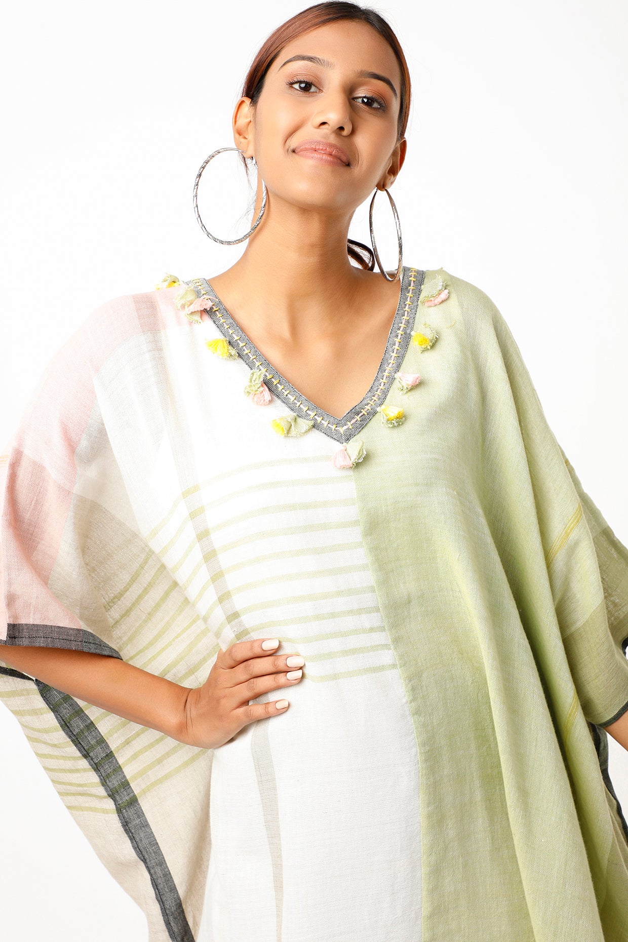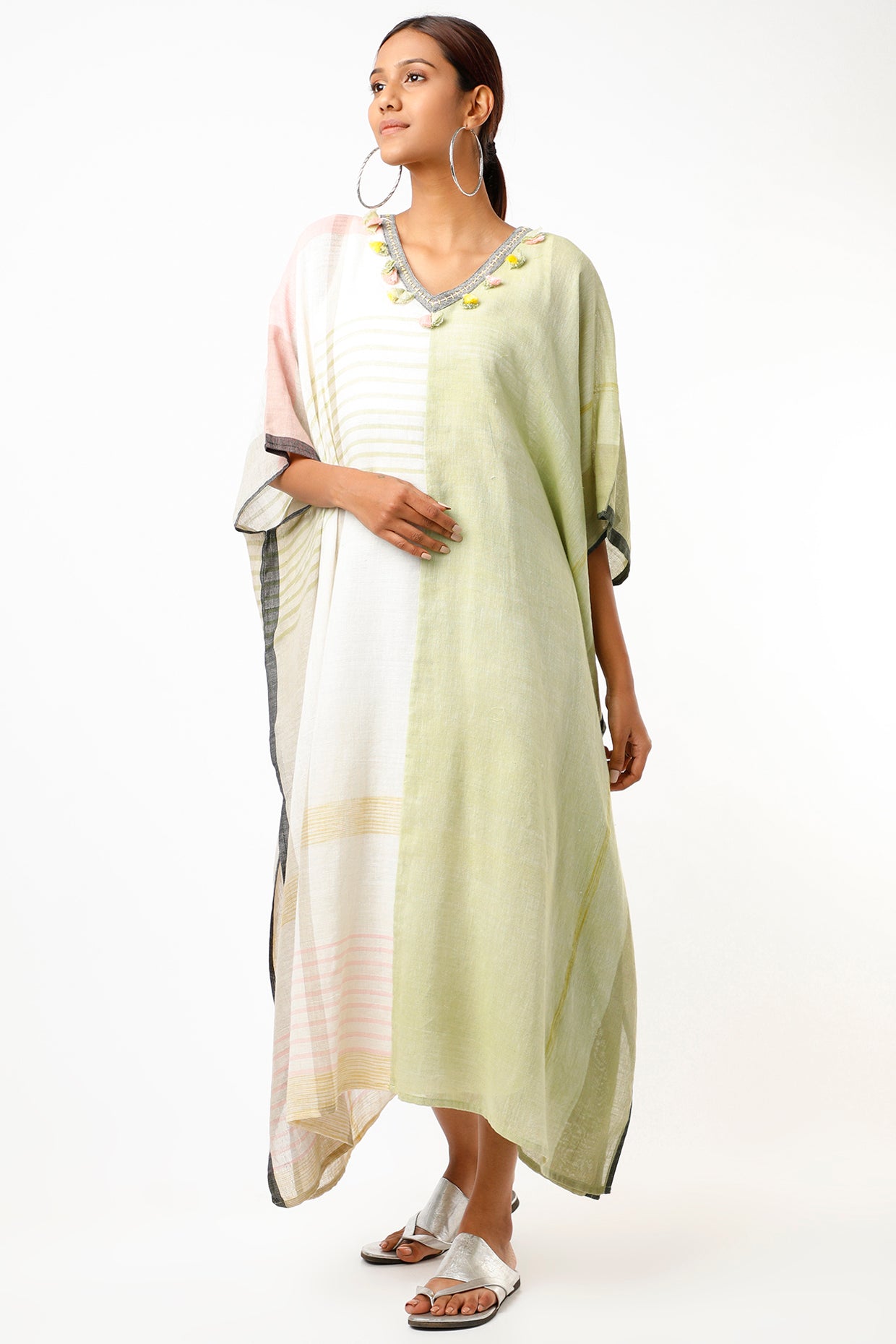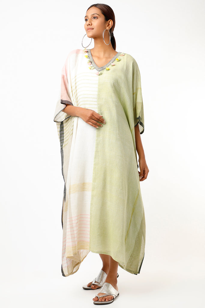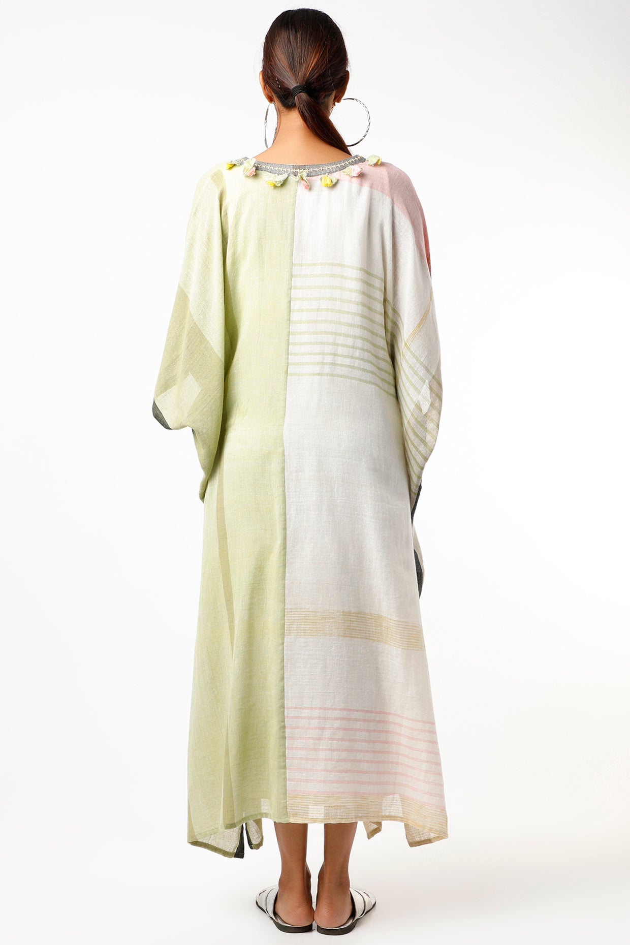 Featuring an olive kunbi handloom cotton kaftan with anchor embroidery and tassel detail.